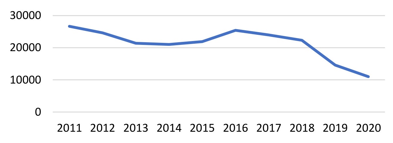 - Los casos corresponden a los años 2010 (2), 2011 (2), 2012 (3), 2013 (1), 2014 (4), 2015 (3), 2016 (6), 2017 (10), 2018 (6), 2019 (6) y 2020 (6).↵