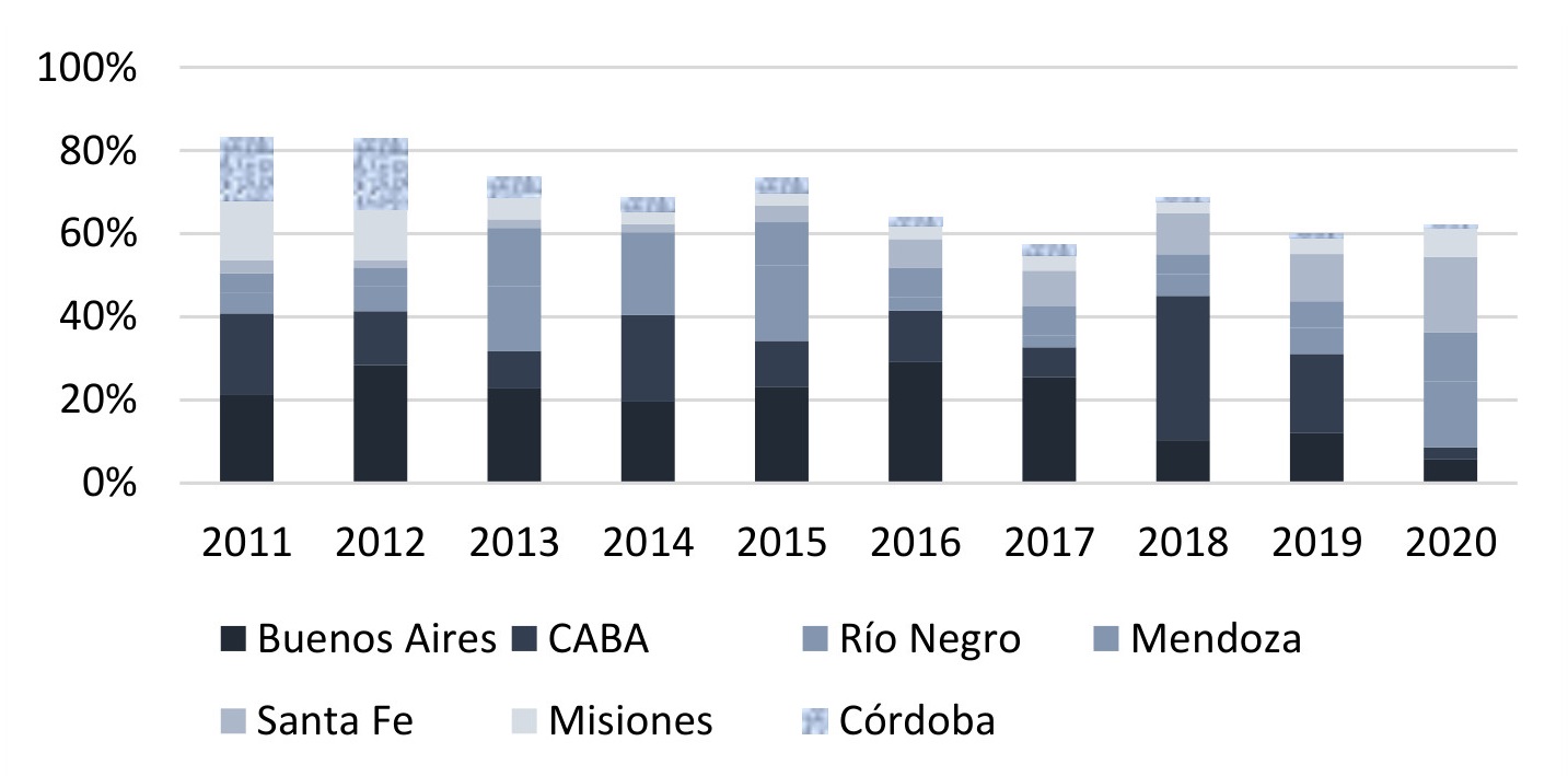 Cabe destacar que no solo aumentaron las infracciones a estos artículos, sino que también se diversificó su distribución geográfica (gráfico 3). Así, si bien el 69 % de estas infracciones en el período 2011-2020 se concentraron en siete jurisdicciones –que no solo se encuentran entre las más pobladas del país (INDEC, 2012), sino que además cinco de ellas son cuna de las primeras agrupaciones cannábicas (Corbelle, 2018)–, lo cierto es que en el último quinquenio se presenta una distribución más homogénea entre las provincias, que podría deberse a la difusión del uso terapéutico-medicinal del cannabis a partir del 2016 en Argentina (Corbelle, 2023).