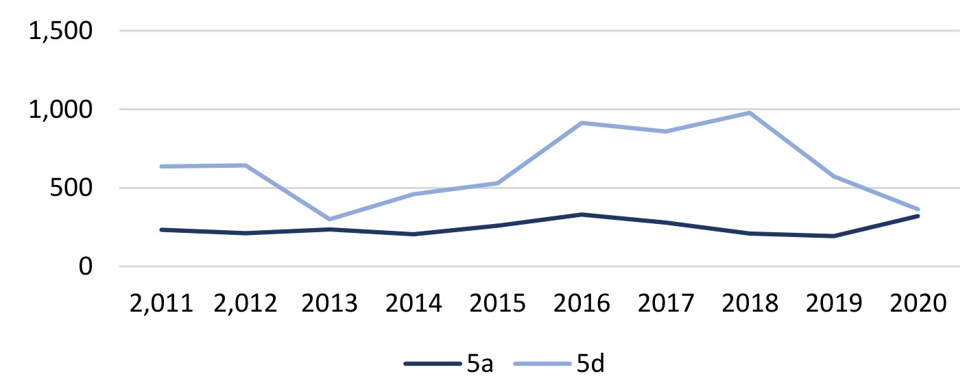 Gráfico 2. Causas iniciadas por infracción al artículo 5, incisos a y d (2011-2020)