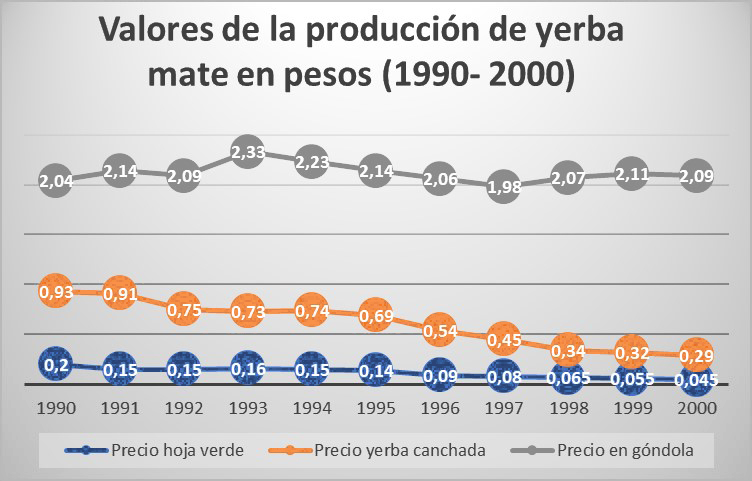 El primer lustro luego de la desregulación no mostró modificaciones sustanciales en el escenario yerbatero. La estabilidad en el precio de la hoja verde y la canchada, como ciertos saldos exportables explican el contexto. Sin embargo, entre 1995 y 2000 los importes de la materia prima inician una caída notoria y, como contraparte, el del producto final en las góndolas mantiene cierta estabilidad, ocasionando el aumento de la brecha entre producción y comercialización, factor que genera una enorme transferencia de la renta en favor de la industria (molinos); como así también para un nuevo e influyente integrante del sector: las cadenas de supermercados (Gortari, 2007; Magán, 2008; Rau, 2012).