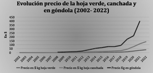 Gráfico III: Evolución precio de la hoja verde, canchada y en góndola (2002-2022)