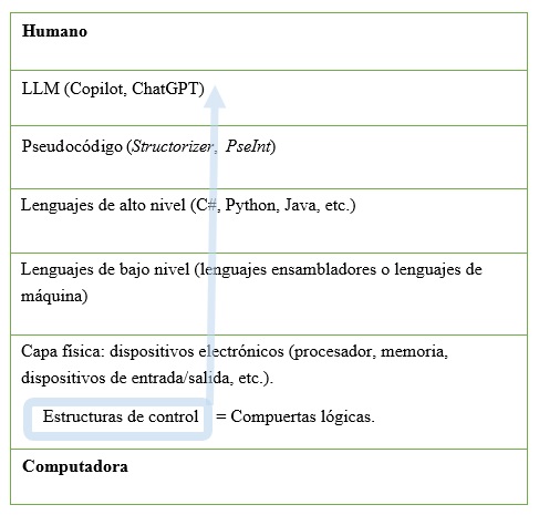 Las estructuras de control (representadas en la figura con un rectángulo y una línea celeste) son fundamentales en la informática y están presentes a lo largo de toda la historia de los lenguajes desde el nivel más básico de la electrónica hasta los lenguajes de programación de alto nivel. Estas estructuras son esenciales para modelar los algoritmos y continúan desempeñando un papel en el desarrollo computacional actual.