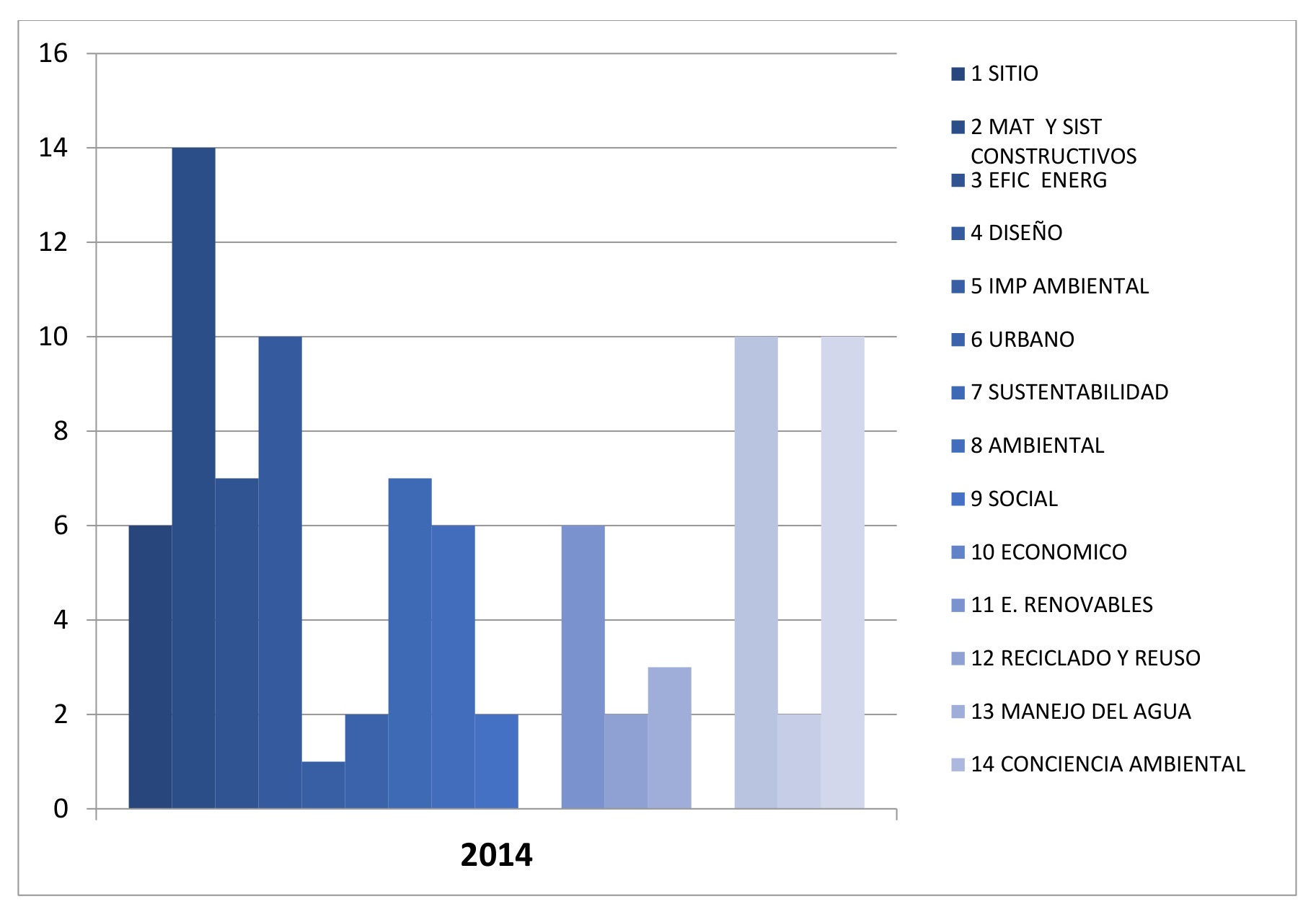 En el año 2014 (gráfico 13), se consolidaron los grupos de categorías. El “sitio” es referenciado como categoría de la sustentabilidad y de lo ambiental a través de las estrategias de diseño. Se observaron mayores consideraciones a las energías renovables, las cuales fueron agrupadas dentro de tecnologías junto a materiales y sistemas constructivos (gráfico 14).