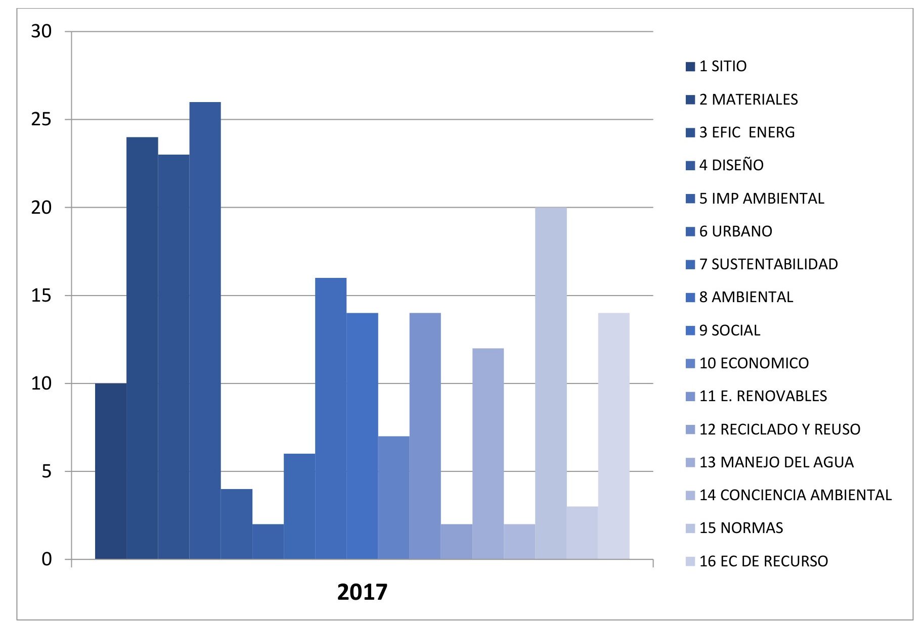 Estos aspectos o criterios a los que los términos “sustentabilidad”, “ambiental” y las denominaciones derivadas hicieron referencia en los artículos analizados se agruparon en las siguientes 17 categorías: sitio; materiales y sistemas constructivos; eficiencia energética; diseño; impacto ambiental; sustentabilidad urbana; sustentabilidad; sustentabilidad ambiental; sustentabilidad social; sustentabilidad económica; energías renovables; reciclado y reúso de materiales; manejo del agua; conciencia ambiental; normas; economía de recursos; y tecnología[6].