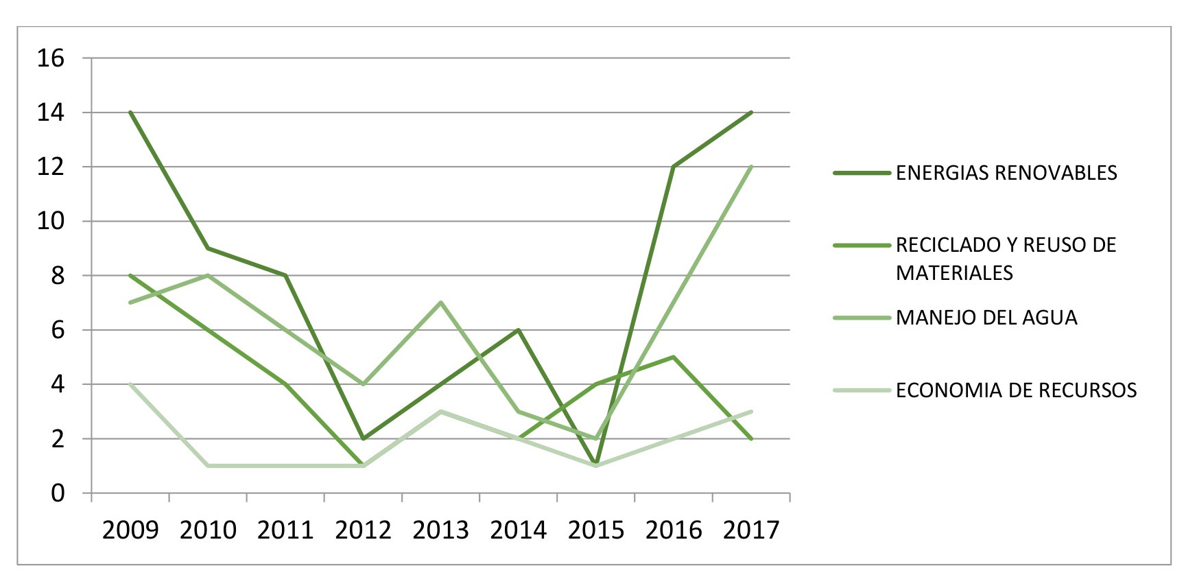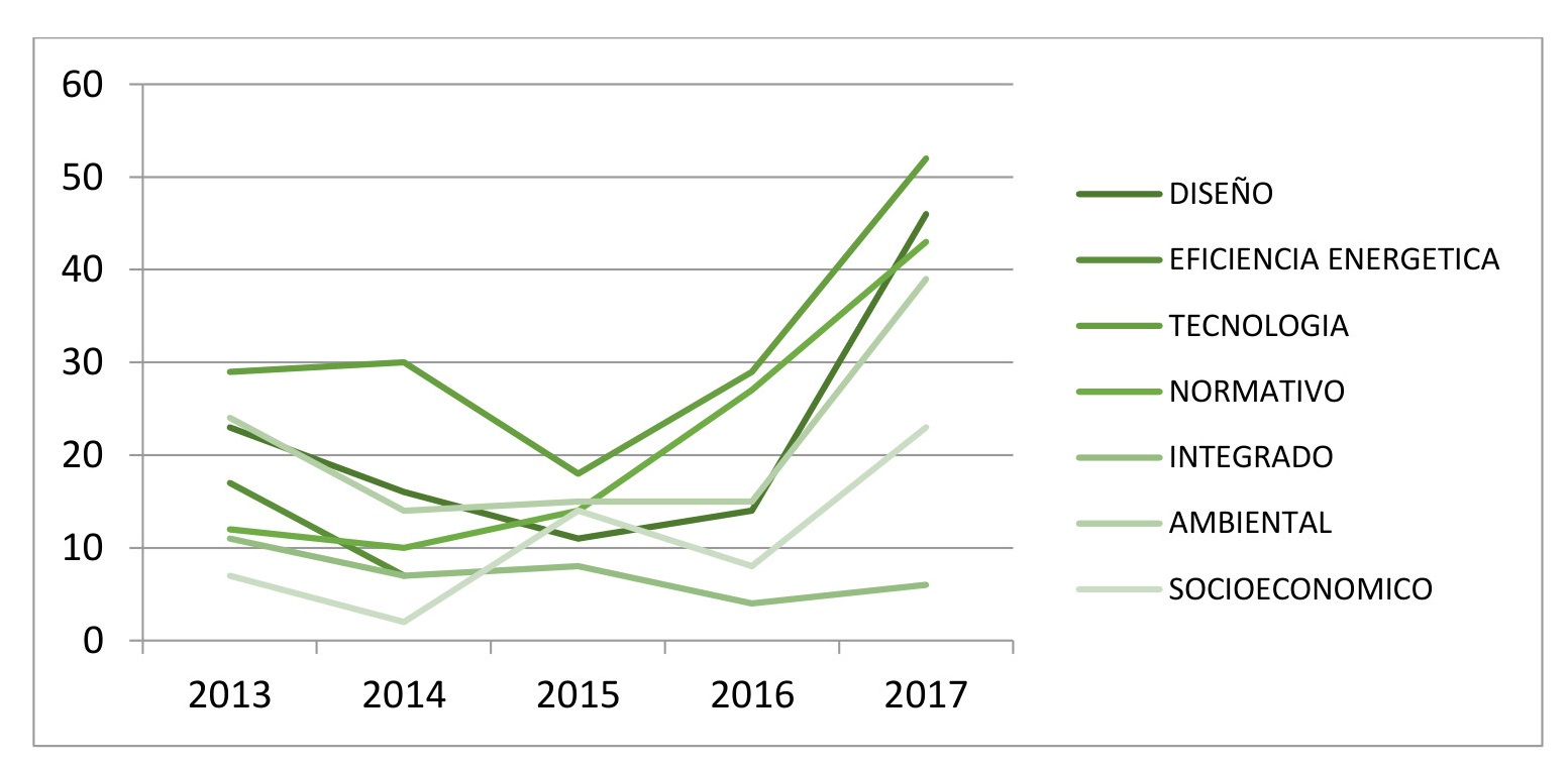 Las categorías “materiales y sistemas constructivos”, “diseño” y “eficiencia energética” se iniciaron en el año 2009 con valores casi iguales y llegaron al año 2017 nuevamente a valores semejantes y con tendencias ascendentes.