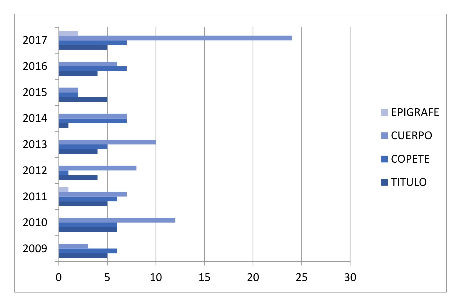 Estos datos no son suficientes para responder a estas preguntas. Se analizó, entonces, la jerarquía de la frecuencia de aparición dentro de la estructura del artículo.