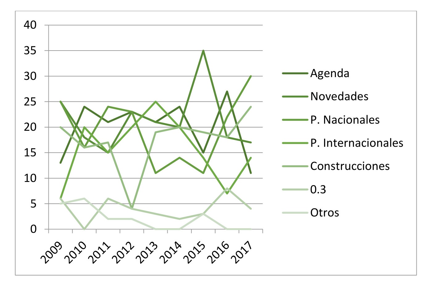 En el gráfico 6, vemos al final del período analizado líneas ascendentes y descendentes. Podemos definir las líneas ascendentes, que corresponden a “obras, proyectos y concursos nacionales”, los “proyectos internacionales” y las “construcciones”, como el “hacer”, y las descendentes, que corresponden a “novedades”, “agenda” y la “0.3” (jornadas, charlas, debates, capacitaciones, exposiciones, congresos, opiniones, entre otras), como el “decir”. Esta tendencia empezó a visualizarse en el año 2017. ¿Marcaría un camino hacia un “hablar menos y hacer más”?