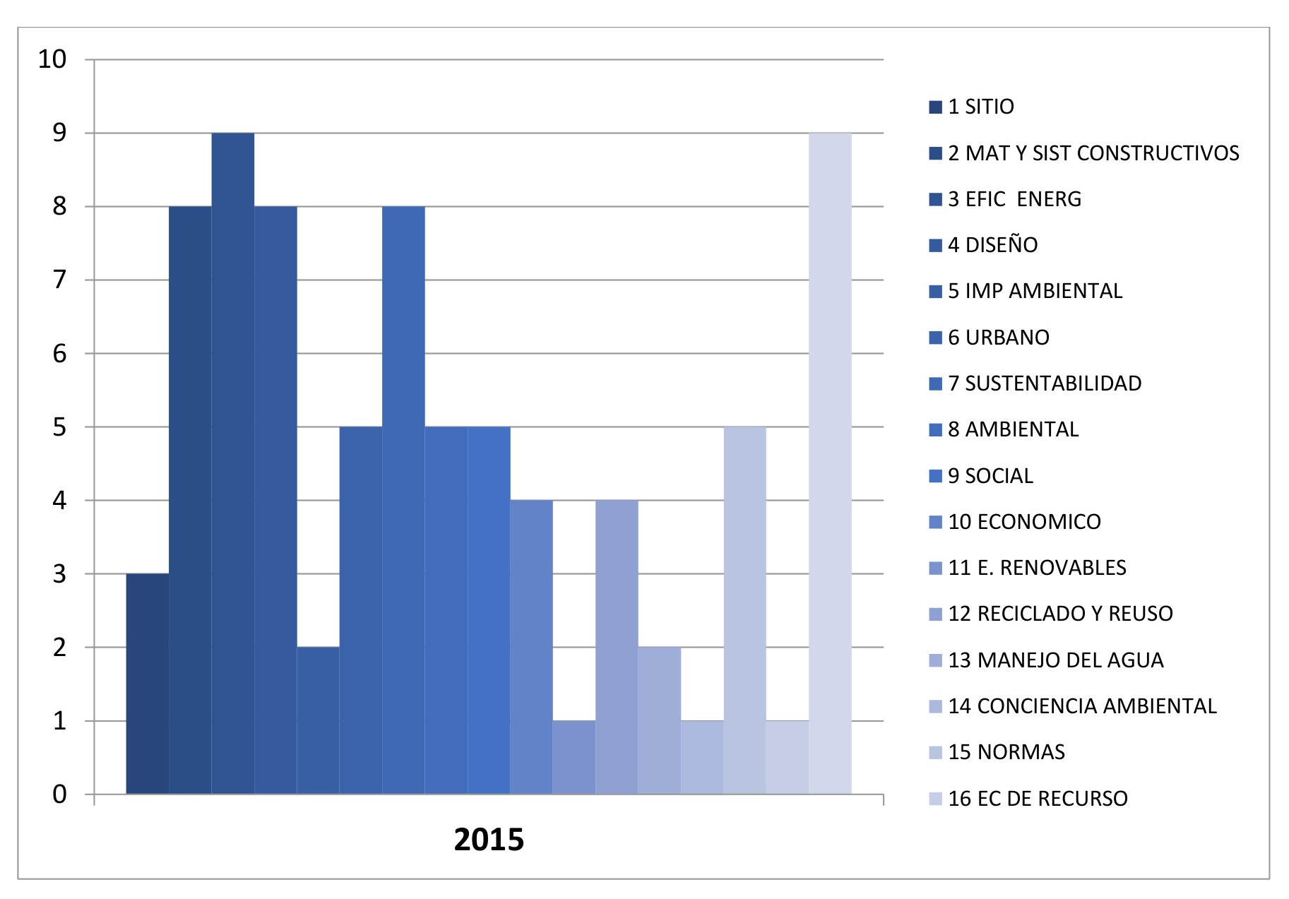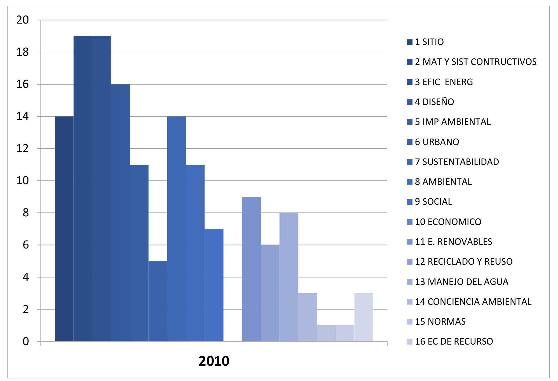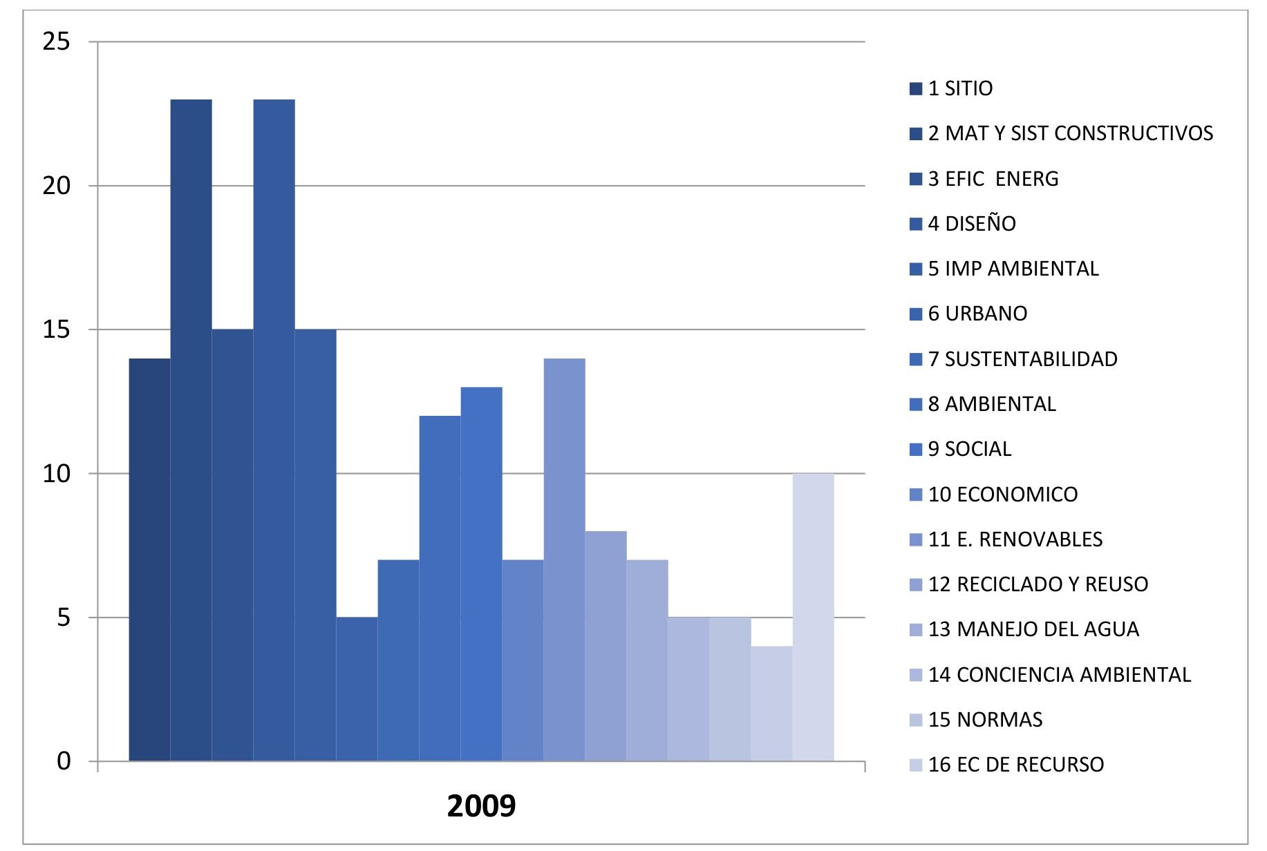 En el gráfico 7, que corresponde al año 2009, los valores más altos correspondieron a relacionar la sustentabilidad a las categorías de “materiales y sistemas constructivos” y “diseño”. “Economía de recursos” y “normas” fueron los criterios a los que menos se relacionó con los términos “sustentabilidad” o “ambiental”. Estas cuestiones empezaban a instalarse en los ámbitos disciplinares y profesionales de la arquitectura.