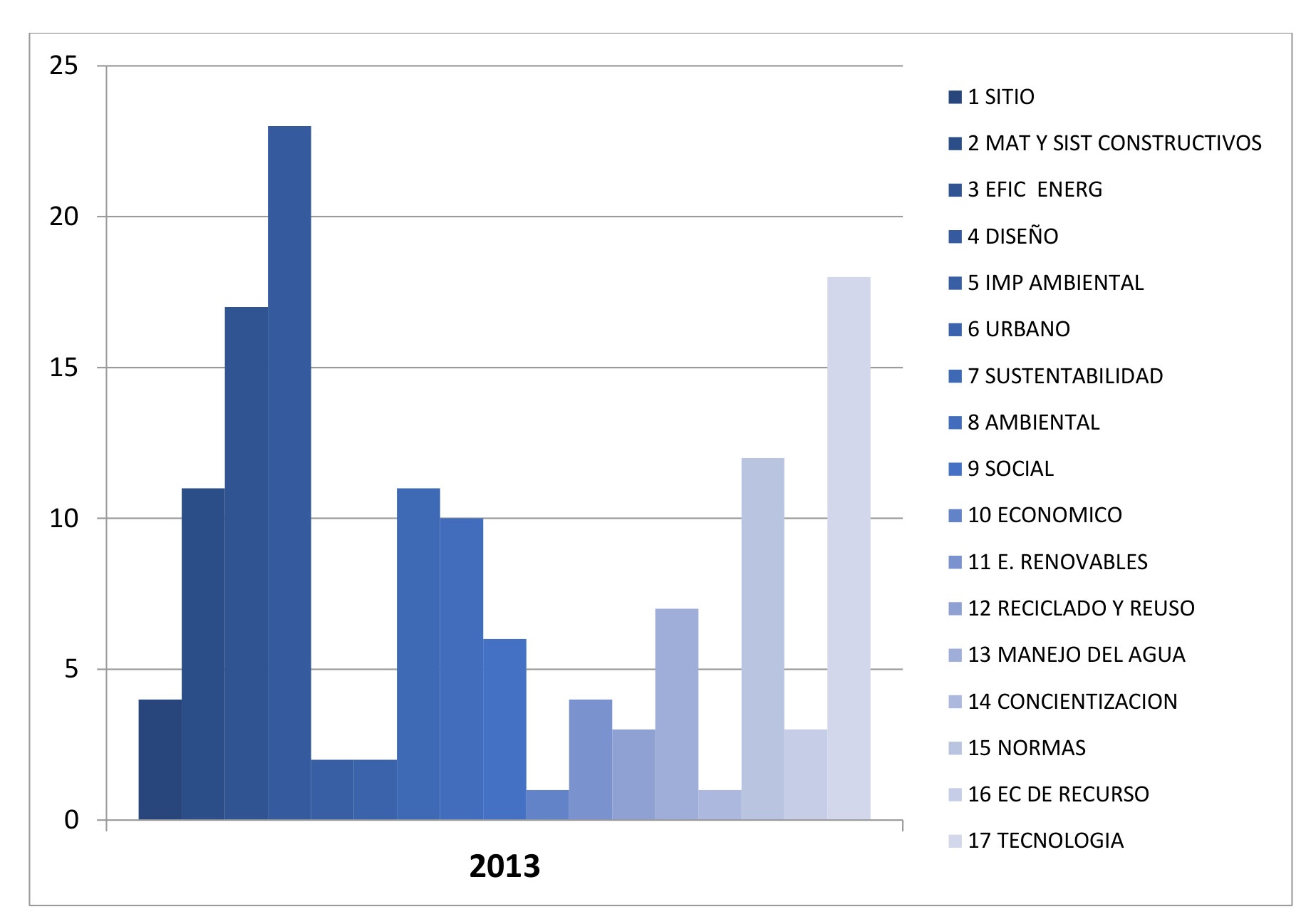 En el año 2013, las categorías se consolidaron (gráfico 11) y conformaron un primer agrupamiento (gráfico 11), tendiente al establecimiento de modelos de sustentabilidad. Los valores de la categoría “tecnología” ascendieron. La categoría “materiales y sistemas constructivos” fue absorbida por la “tecnología”. La “eficiencia energética” ascendió casi al nivel de la “tecnología”. En los artículos, a la tecnología se la relaciona con el diseño pasivo y bioclimático, con los materiales y sistemas constructivos, con las instalaciones y el confort y con la tecnología en la búsqueda de “fachadas eficientes”.