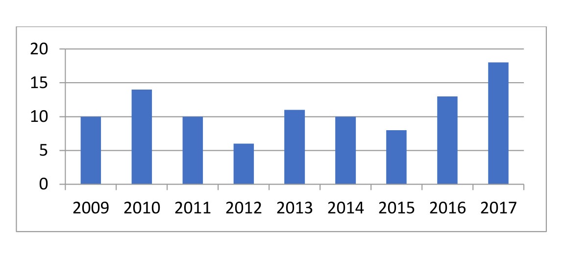 Gráfico 2. Oscilaciones de las apariciones de los términos “sustentabilidad”, “ambiental” o denominaciones derivadas (2009 y 2017)