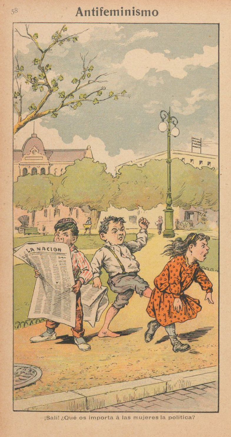 El cartoon reproducido retrata aparentemente una escena en la Plaza de Mayo, en Buenos Aires. En cuanto a la denotación, el acto es rápido y directo: hay dos niños leyendo el diario La Nación, aunque uno de ellos (el de la izquierda) está mejor vestido. Una niña, aparentemente de la misma edad, se acerca a los dos, pero de repente es pateada: “¡Salí! ¿Qué os importa á las mujeres la política?”. En el ámbito connotativo, sin embargo, hay una serie de simbologías. La primera tiene que ver con el escenario: la plaza, ubicada frente a la Casa Rosada, sede del poder político-institucional argentino, no parece haber sido elegida sin razón. El gesto de los niños, al expulsar a la niña del lugar e impedirle leer el diario La Nación y “seguir la política” con ellos, sirve como metáfora del antifeminismo: la negación y el rechazo a la participación de la mujer en la esfera política.