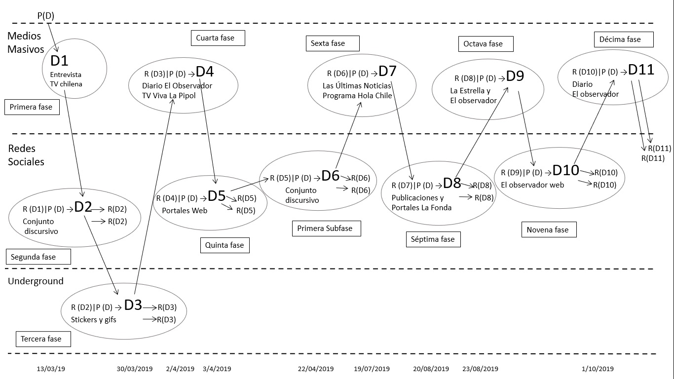 Para llevar adelante el trabajo, se adoptará el modelo de circulación hipermediática desarrollado por Carlón (2020)[11], que permite evidenciar las nuevas condiciones de circulación discursiva a partir de la existencia de dos sistemas de medios que se encuentran en constante relación de convergencia y divergencia. Siguiendo el modelo, se construirá una línea de tiempo donde se identificarán fases de la circulación (puntos de encuentro entre los dos sistemas de medios que se producen, generalmente, por cambios de escala en la mediatización, en la dirección de la comunicación y del estatuto del enunciador), al igual que subfases (cambios de escala en la mediatización, en la dirección de la comunicación y del estatuto del enunciador que no alcanzan a atravesar el otro sistema mediático) para el estudio de la producción del sentido, con especial atención en la generación de discursos cómicos.