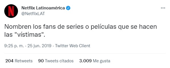 Por otro lado, el 10 de junio, la cuenta de premiación realizada por el canal de televisión MTV Latinoamérica @MTVMiaw citó un tuit y publicó: “DEJA DE HACERTE LA VISTIMA”[51]. Por su parte, Netflix Latinoamérica el 25 de junio tuiteó “Nombren los fans de series o películas que se hacen las ‘vístimas’”[52], que obtuvo 226 retuits y 3.275 me gustas.
