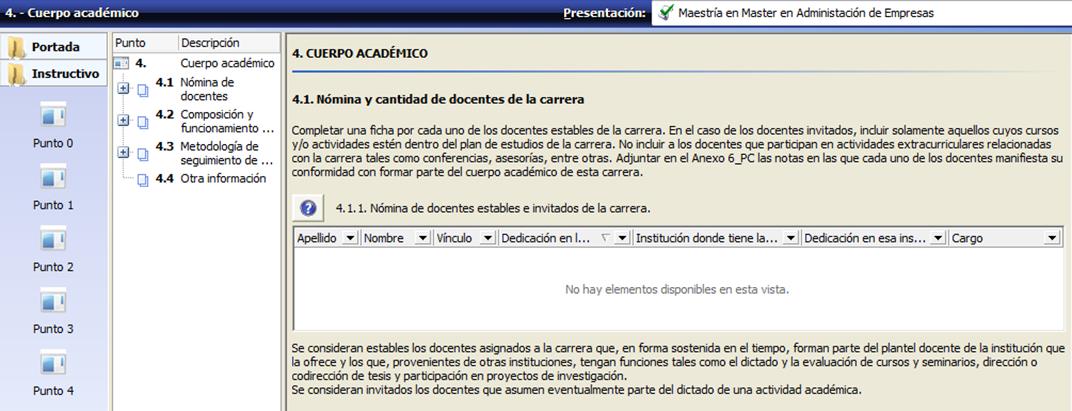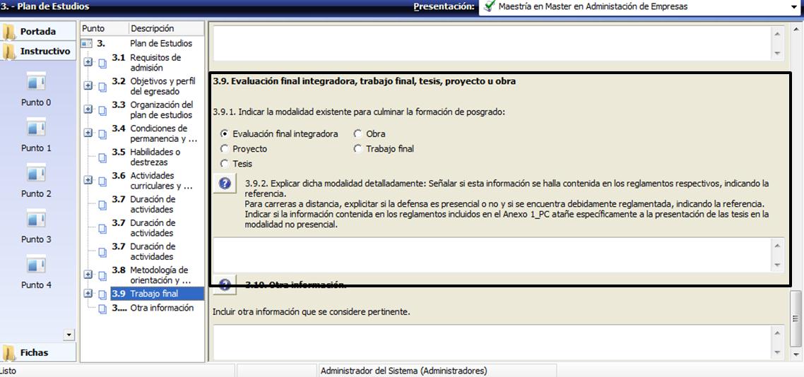 Para mencionar un ejemplo, en el punto 3 de la PC sobre Plan de Estudios se dan varios casos de superposición. En el 3.8.1 se solicita describir los mecanismos de orientación y supervisión de alumnos, y en el 3.8.2 se solicita la misma información, pero especificada para la elaboración del trabajo final o tesis. Por lo tanto, se puede considerar que el punto 3.8.2 está contenido dentro del 3.8.1. Además, en el 3.9.2 se solicita información sobre la modalidad de la evaluación final integradora, trabajo final, tesis, proyecto u obra. Parte de esta información ya se consignó en el punto 3.8.1 (en el que se solicita que en el caso de requerir tutores para la orientación y supervisión de alumnos se debe describir cómo se los selecciona y qué condiciones deben reunir) y 3.8.2 (cómo es la orientación y supervisión realizada a los alumnos que se encuentran en la etapa final de elaboración del trabajo o tesis).