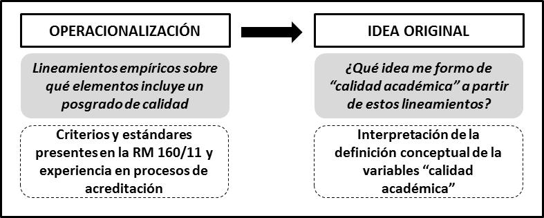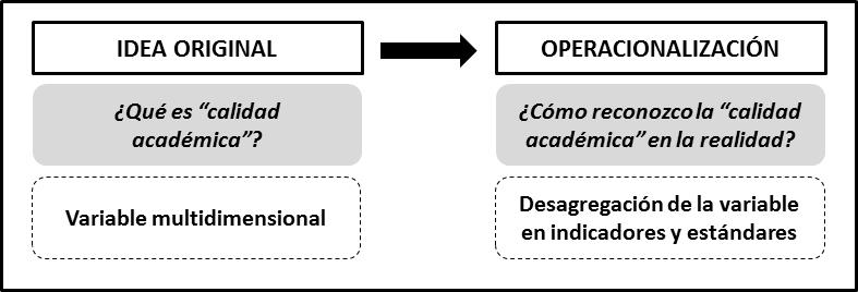 El acto de acreditación de carreras de posgrado que realiza la CONEAU es un acto público mediante el cual este organismo (identificado como autoridad legal) reconoce la calidad de un programa académico de acuerdo a determinados estándares previamente establecidos. Este acto público de garantía requiere que el proceso mediante el cual se llegue a la decisión final no esté amenazado por fallas en la medición. Por lo tanto, para identificar estas posibles fallas se requiere una reflexión sobre qué elementos se fundamentan los instrumentos de medición (es decir, qué concepto de calidad toma como referente), qué herramientas utiliza, e, incluso, bajo qué procedimientos se aplican estos instrumentos. Es decir, este acto público solo cumplirá su verdadero objetivo de garantía de calidad si el dato utilizado para llegar a la conclusión y su posterior análisis gozan de validez y confiabilidad. El proceso de recolección de información para la construcción de este dato incluye una primera etapa en la que se defina la variable a medir y sus dimensiones, continúa una segunda etapa en la que se construye el instrumento de medición que se aplicará a las unidades de análisis de acuerdo a las dimensiones previamente definidas, y finalmente se aplicarán esos instrumentos para recolectar efectivamente el dato. Esta recolección no se realiza al azar, sino que se trata de un proceso que está determinado por reglas claras de medición. Este dato luego es comparado con el concepto inicial de la variable (los estándares) para llegar a una conclusión.