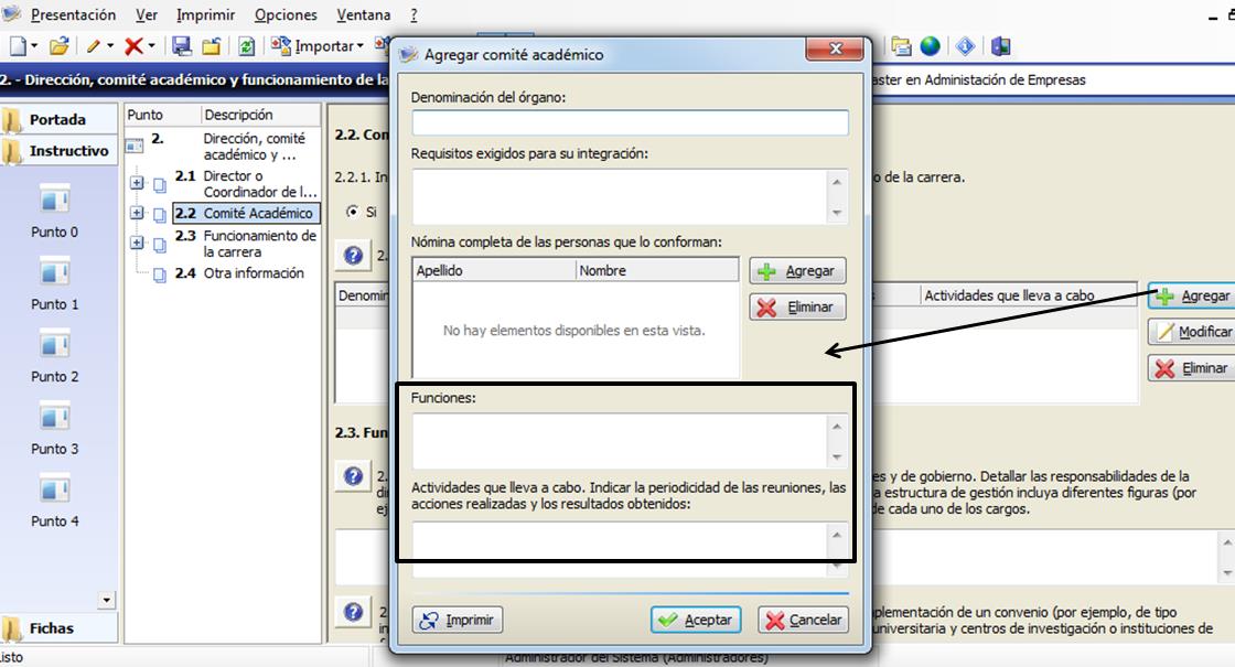Más allá de estos breves lineamientos que provee el organismo, los instructivos a menudo no proveen información suficiente para aclarar dudas sobre la forma de completarlo o para interpretar qué tipo de información se espera en algunas secciones. Para mencionar algunos ejemplos, en el punto 2.2 de la PC, se solicita que se especifique la función del órgano que actúa como comité académico, y las actividades que lleva a cabo. Por un lado, es confusa la diferencia entre las funciones y las actividades. Y por otro lado en las actividades se solicita, como muestra la figura 8, que se indique la periodicidad de las reuniones, las acciones realizadas y los resultados obtenidos. Por lo tanto, la información a completar ya no se refiere solamente a la categoría “actividades”, es decir, dentro de un mismo concepto se están incluyendo múltiples datos a informar. Este inconveniente representa una amenaza técnica, ya que en el instrumento no se proveen especificaciones claras sobre la información que se solicita.