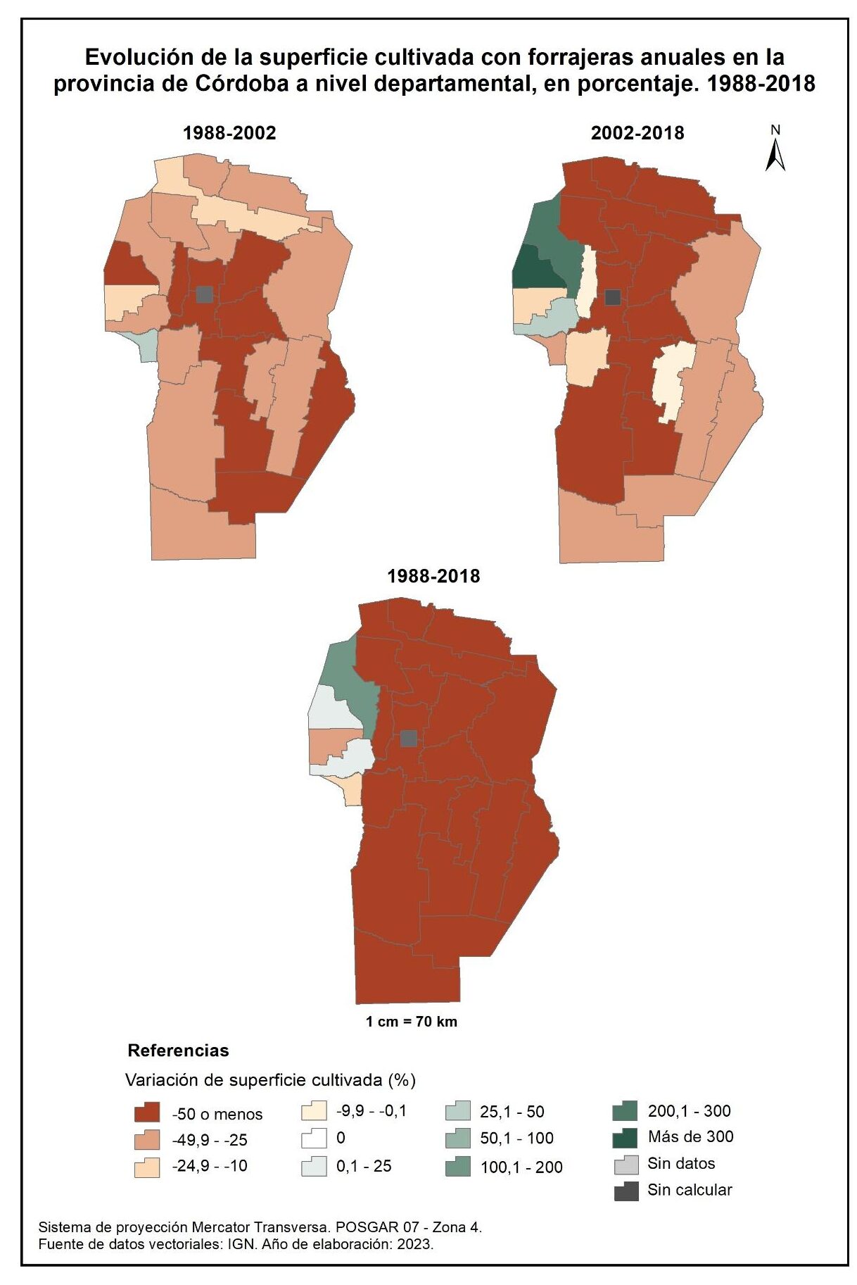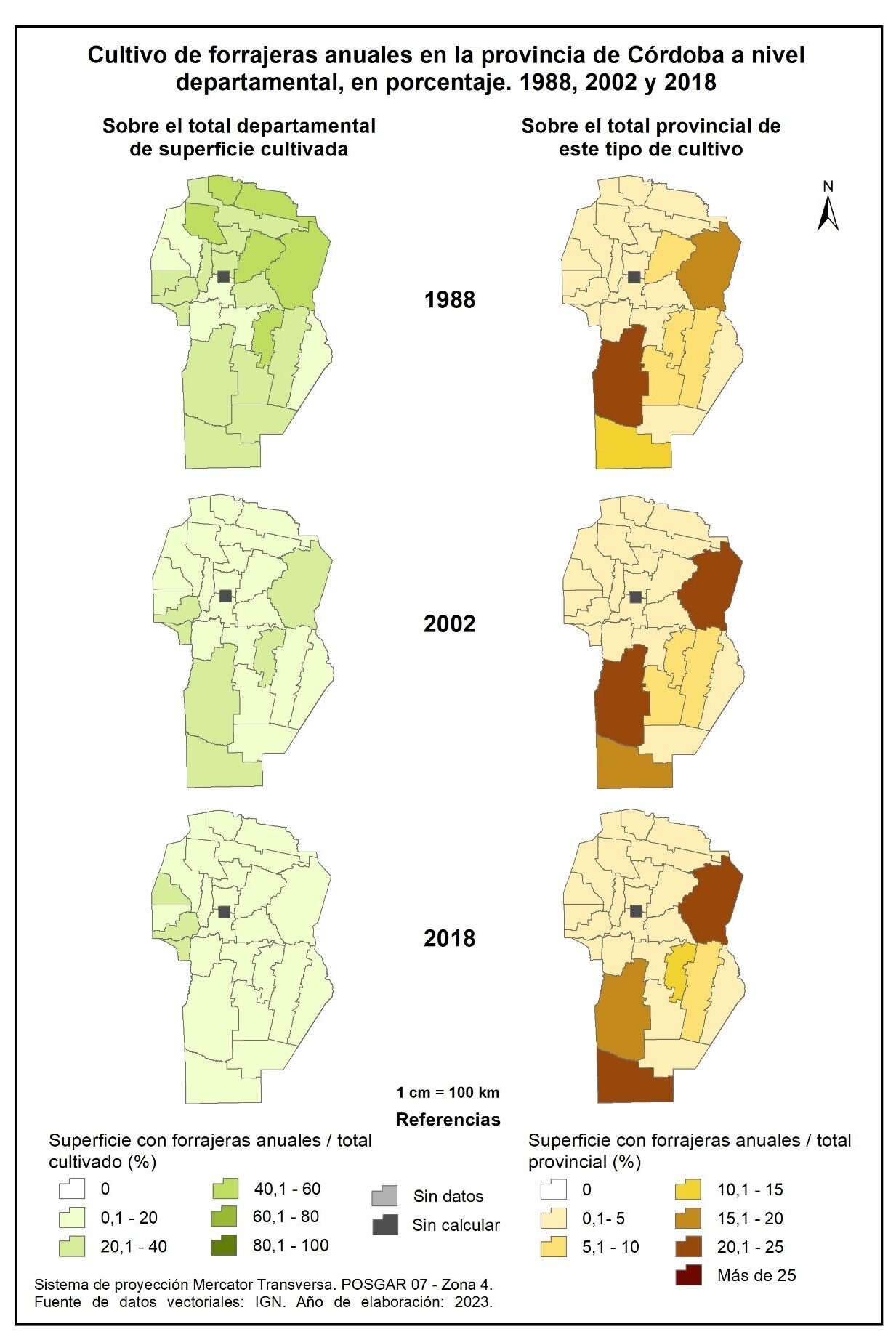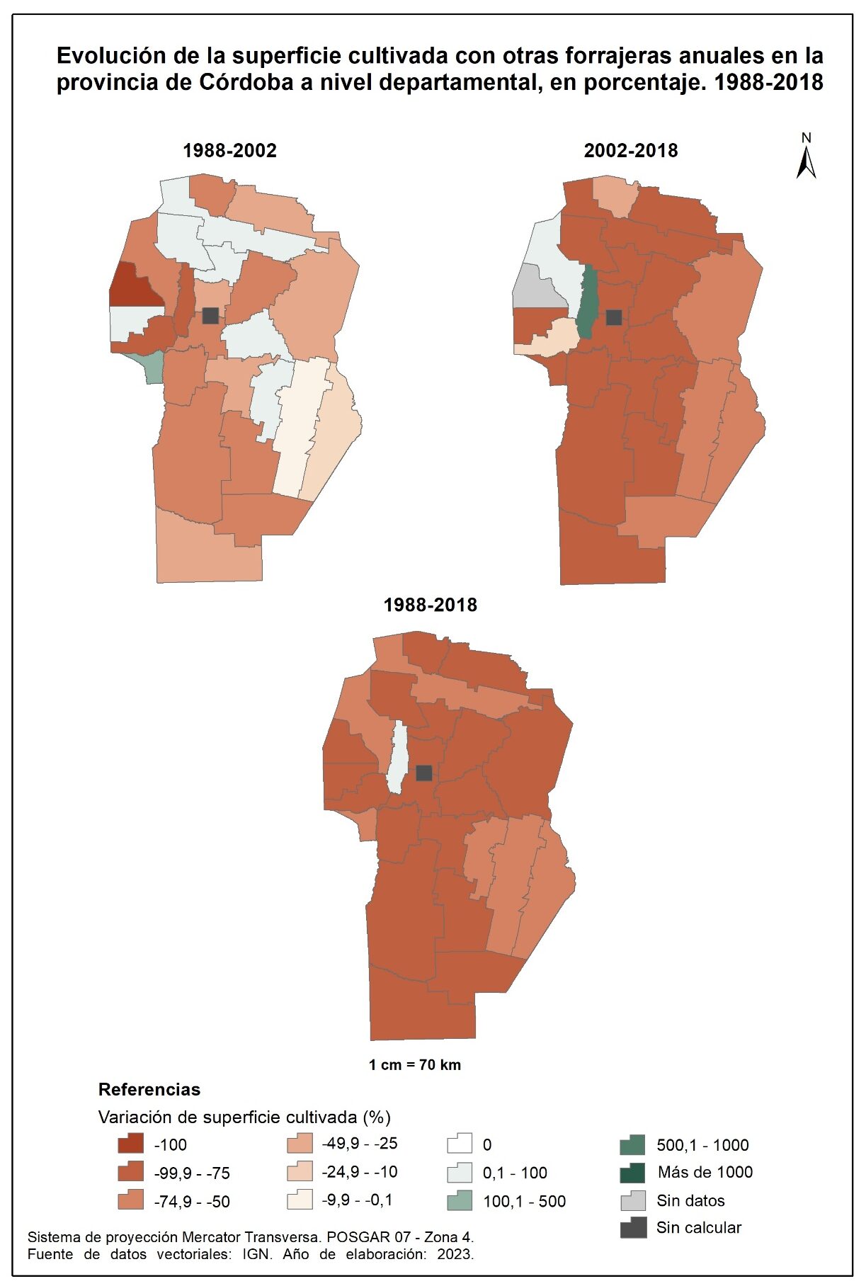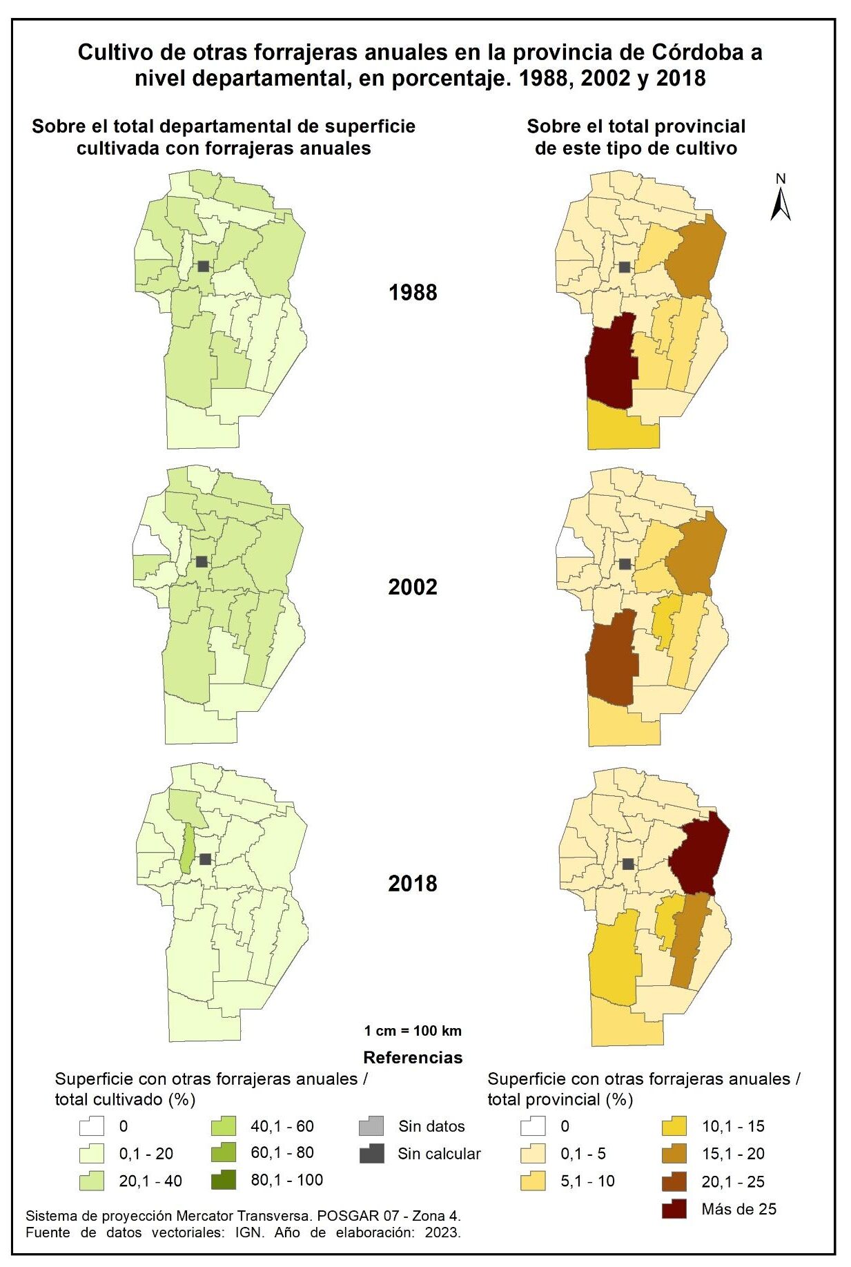 Por tanto, en la totalidad del corte temporal analizado (1988-2018), la mayor parte de la provincia muestra una marcada disminución en la superficie implantada con forrajeras anuales, a excepción de tres departamentos del oeste: Cruz del Eje, Minas y San Alberto; no obstante, vale aclarar que sus valores absolutos no resultan significativos.
