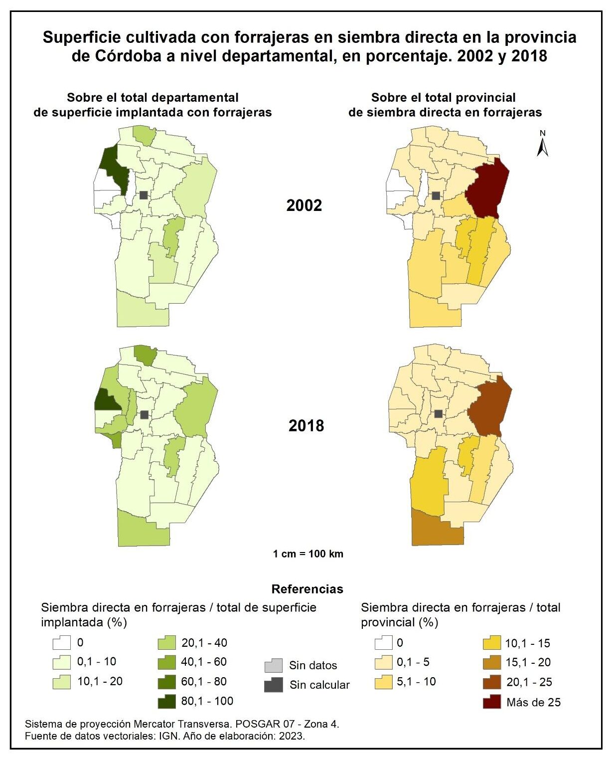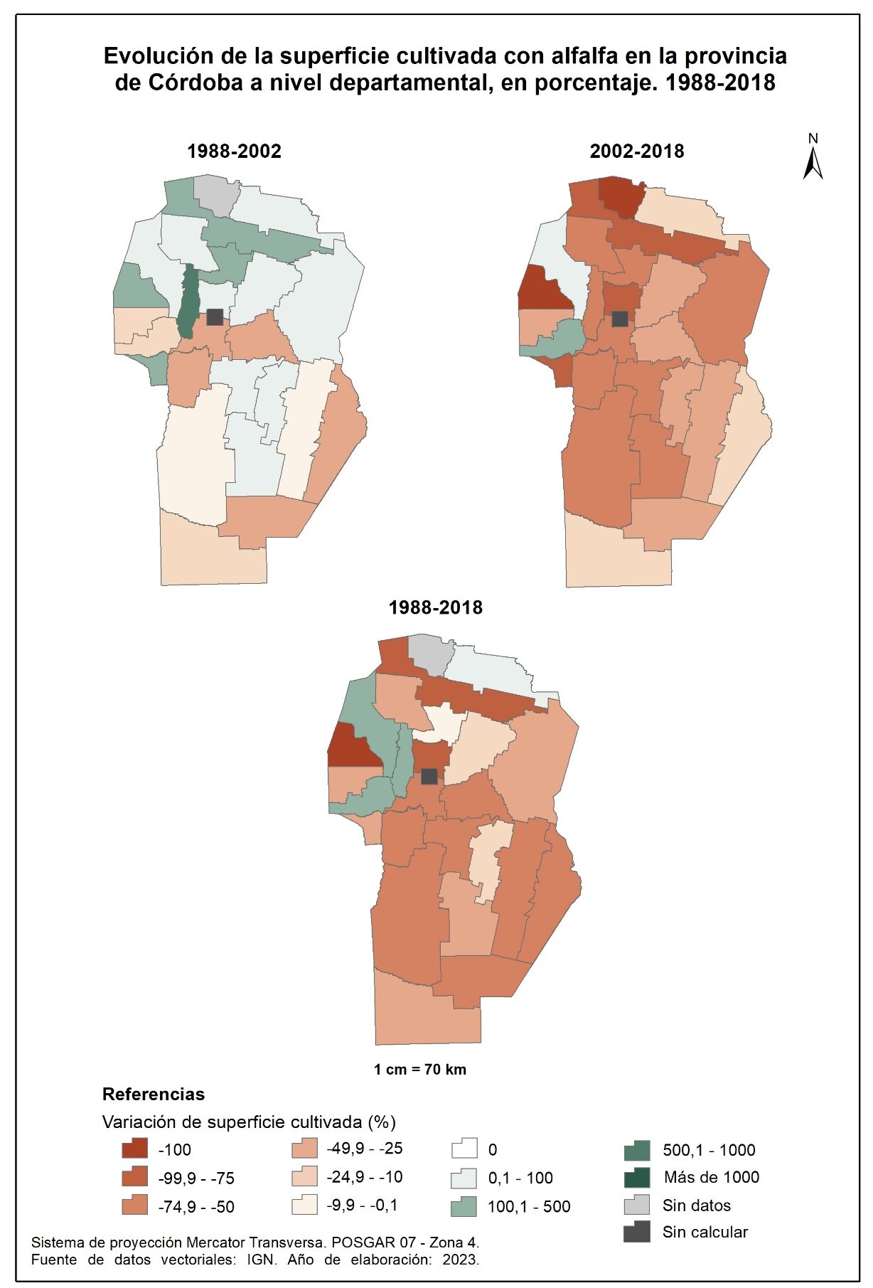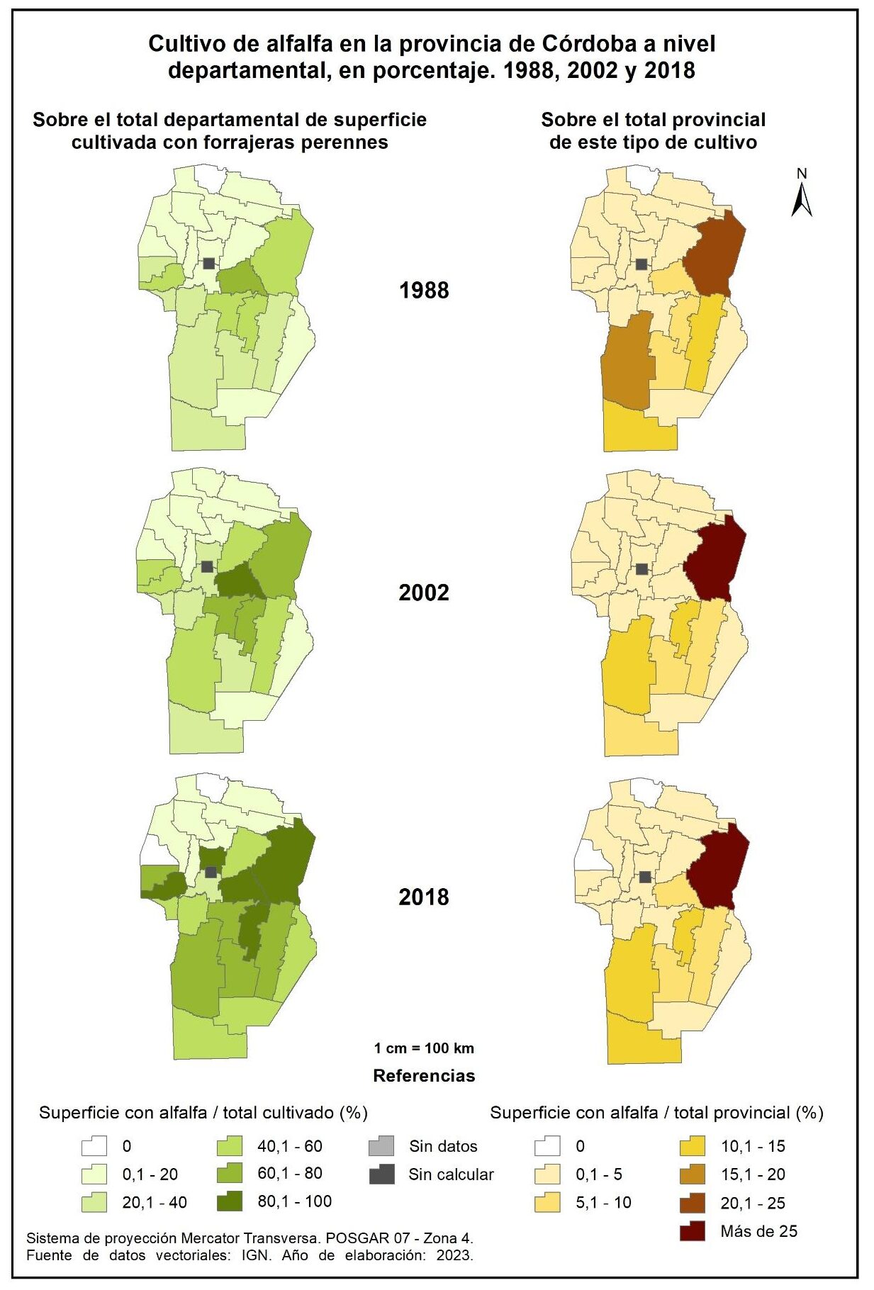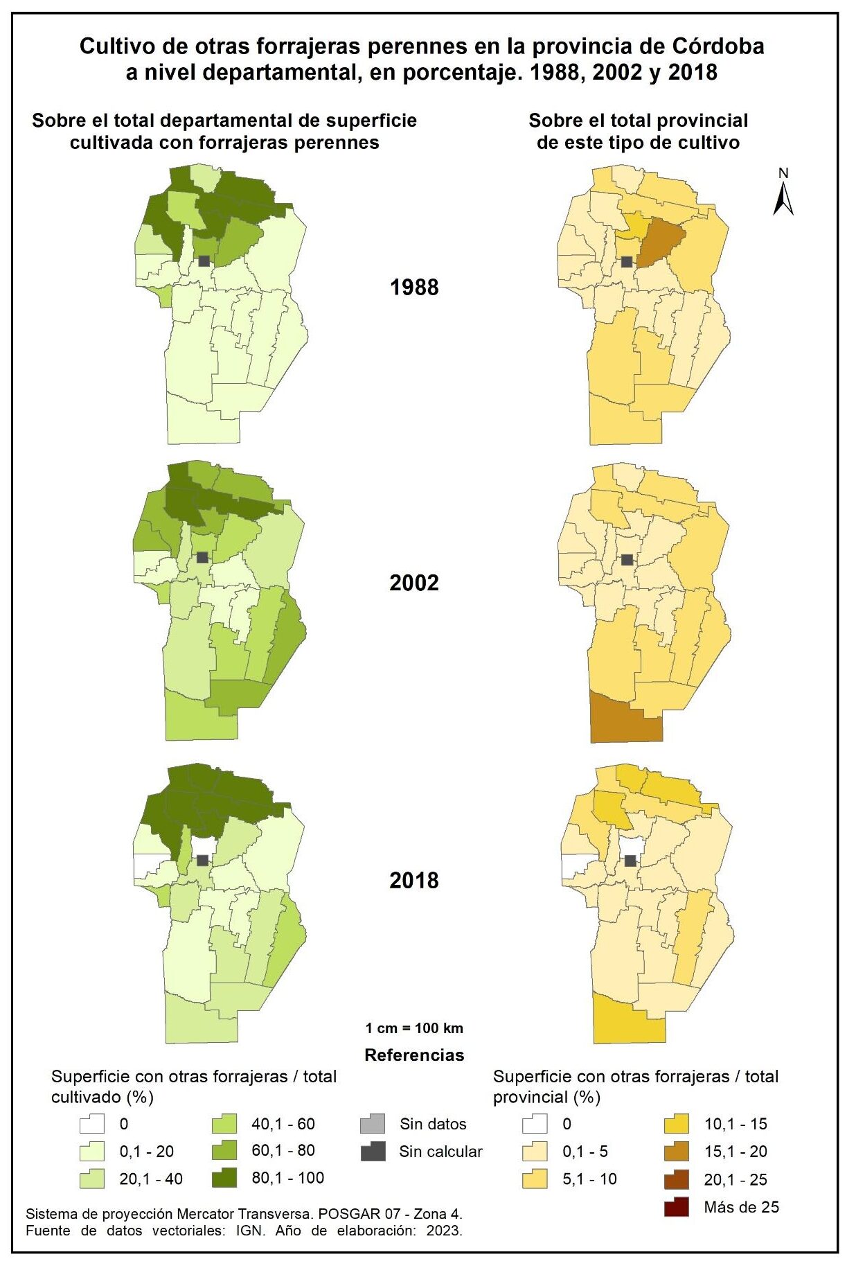 Por tanto, en la totalidad del corte temporal analizado (1988-2018), la mayor parte de la provincia muestra una marcada disminución en la superficie implantada con forrajeras anuales, a excepción de tres departamentos del oeste: Cruz del Eje, Minas y San Alberto; no obstante, vale aclarar que sus valores absolutos no resultan significativos.
