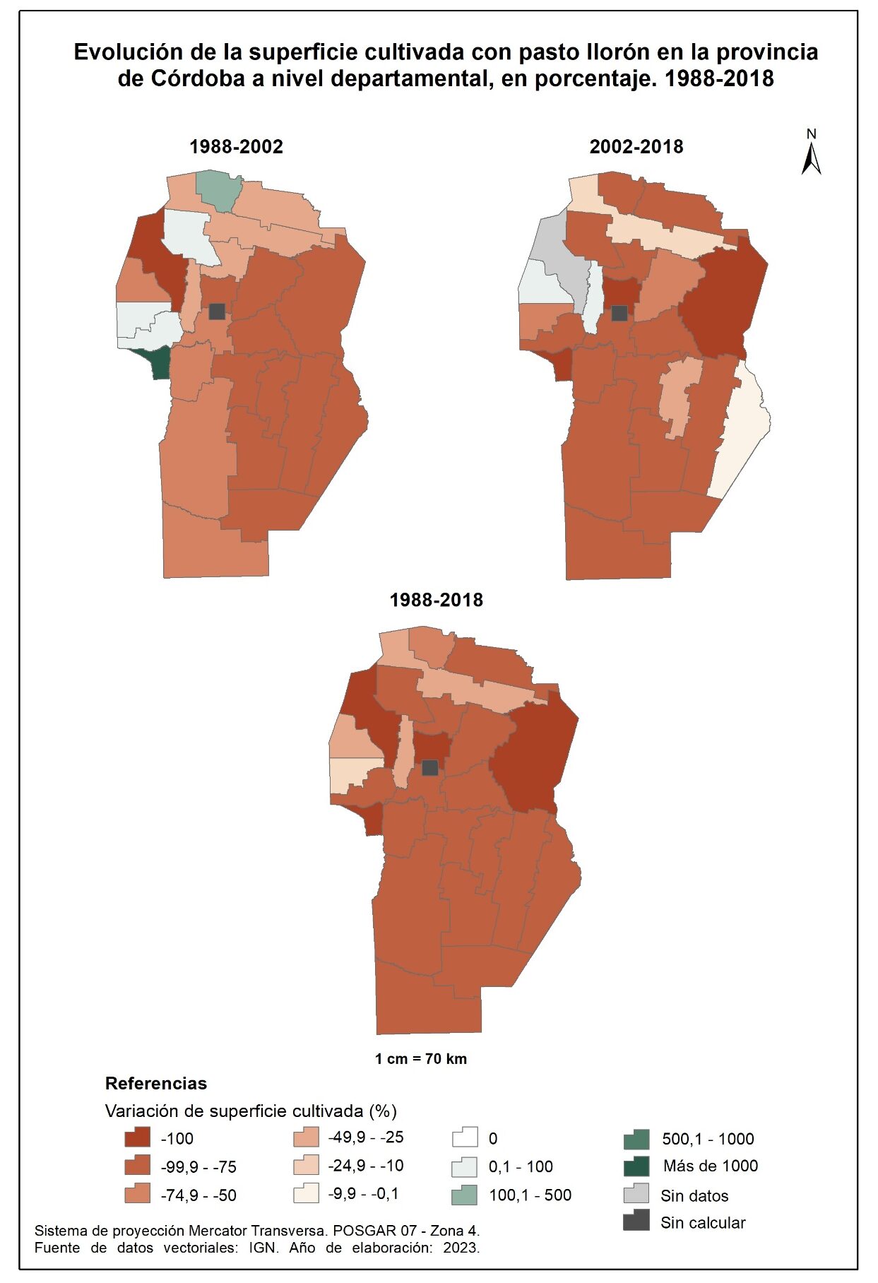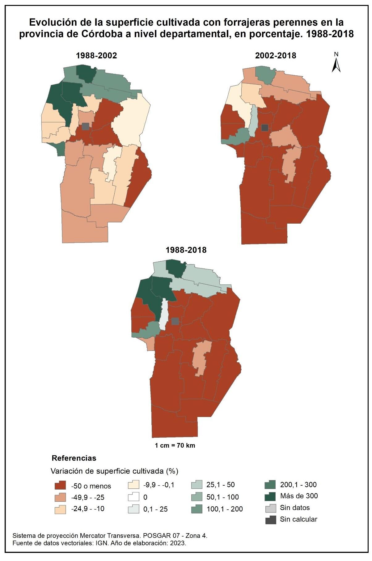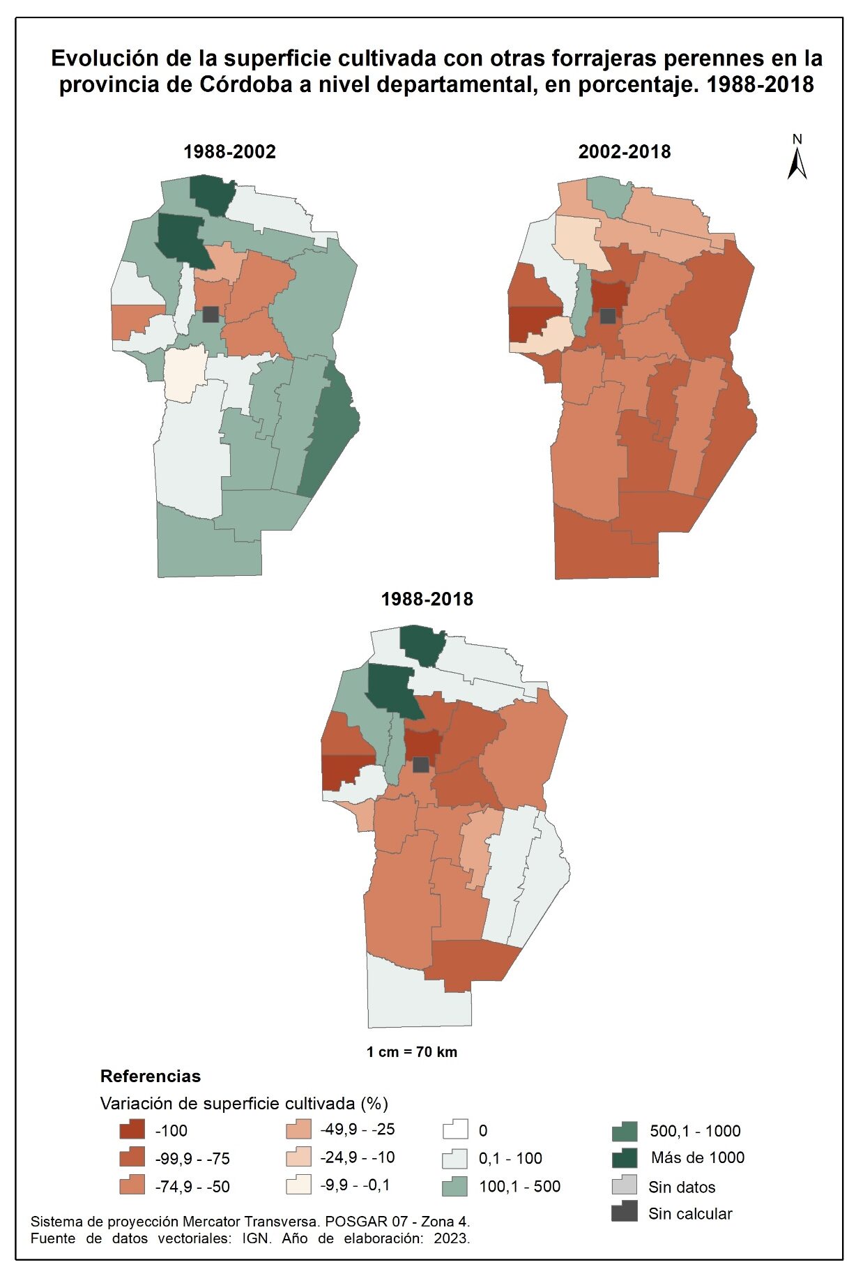 En la totalidad del corte temporal analizado (1988-2018), la mayor parte de la provincia muestra una marcada disminución en la superficie implantada con forrajeras perennes. La excepción la constituyen los departamentos del norte y algunos del oeste, destacándose Sobremonte con un aumento del orden del 1.800% e Ischilín y Cruz del Eje con valores del 570 y 355% respectivamente.