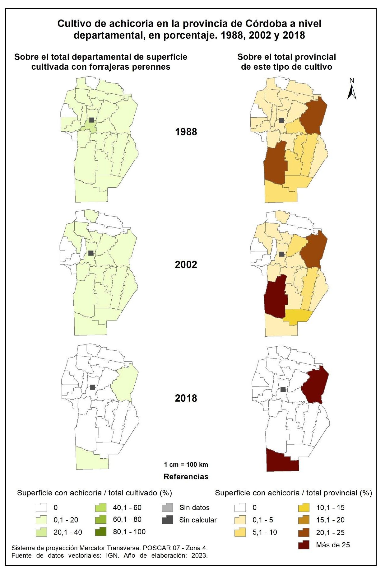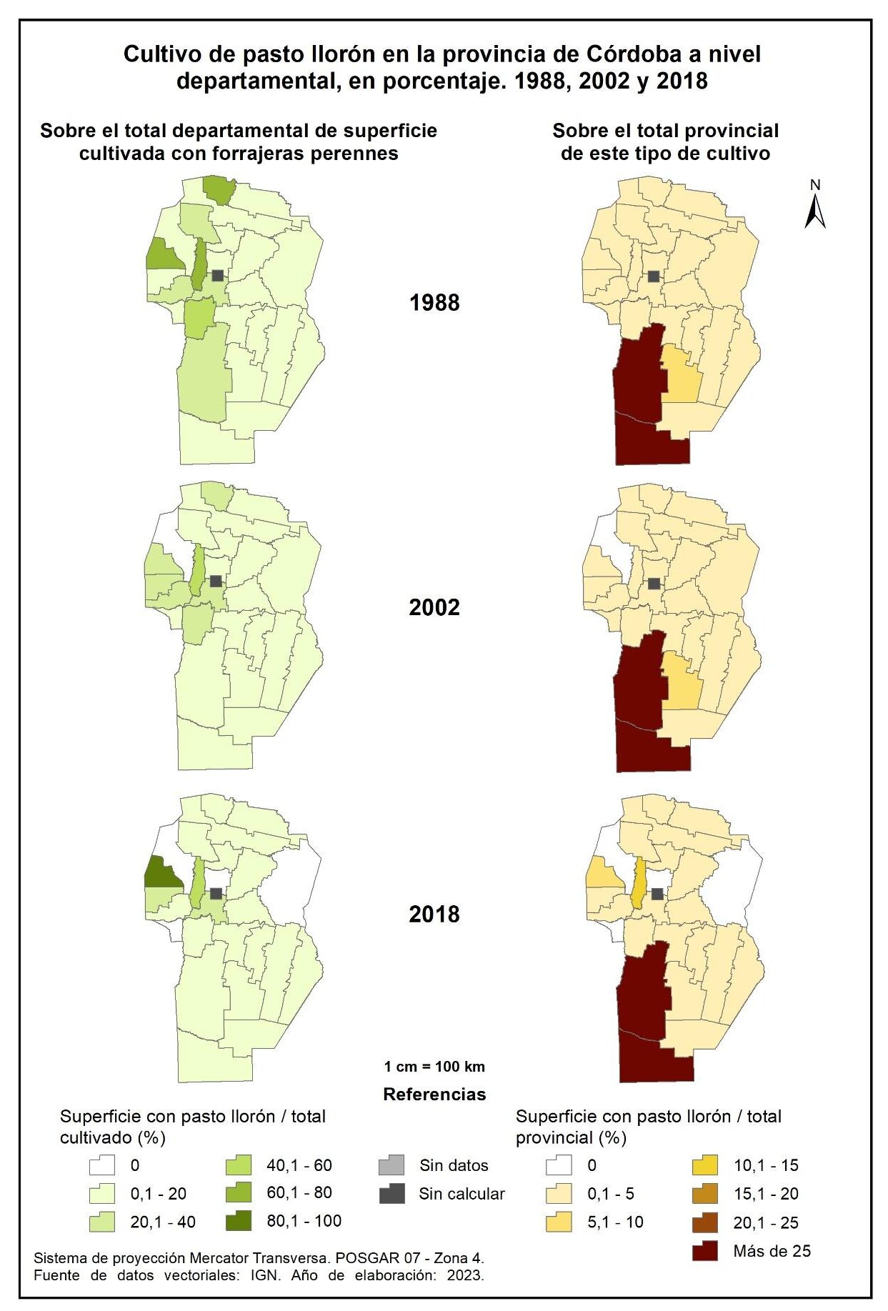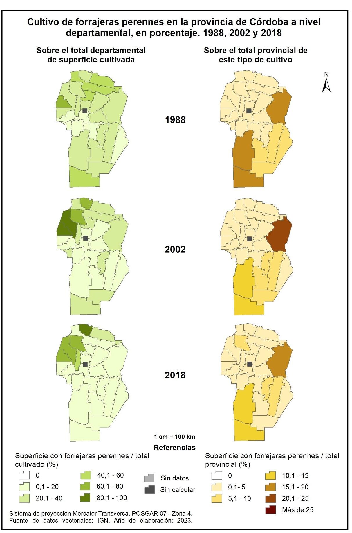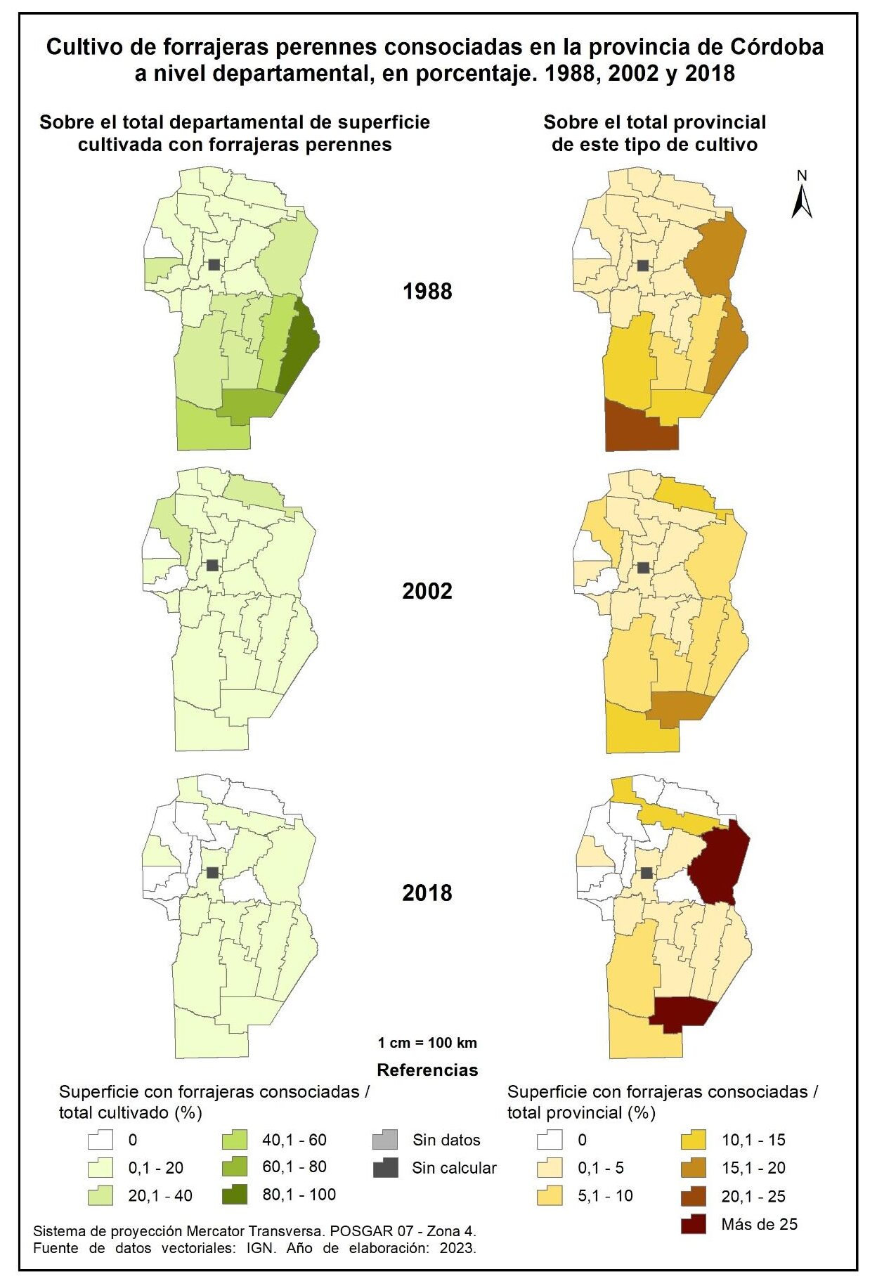 Figura 3.8. Evolución de la superficie cultivada con forrajeras perennes en la provincia de Córdoba a nivel departamental, en porcentaje. Años 1988, 2002 y 2018.