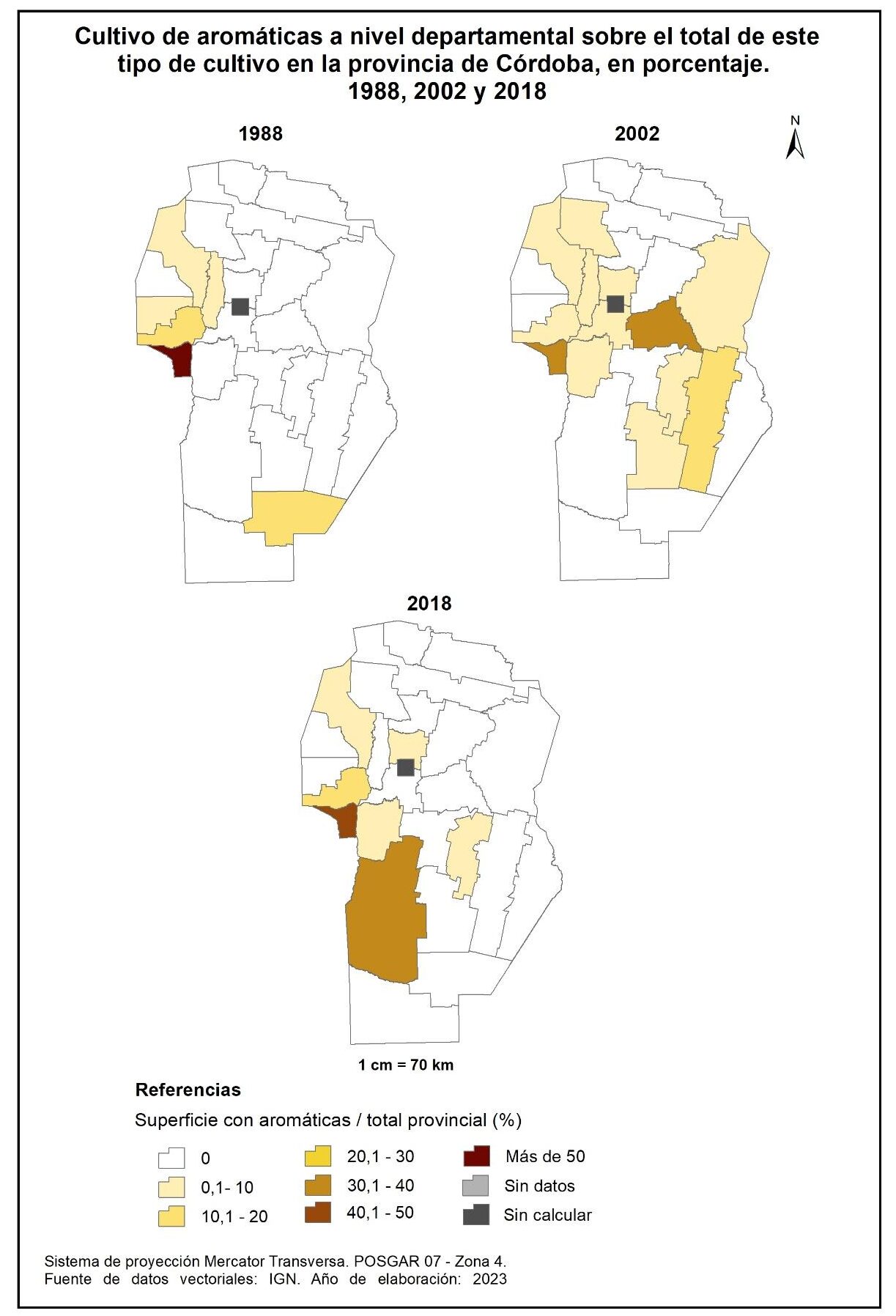 Figura 3.10. Cultivo de aromáticas a nivel departamental sobre el total de este tipo de cultivo en la provincia de Córdoba, en porcentaje. Años 1988, 2002 y 2018.