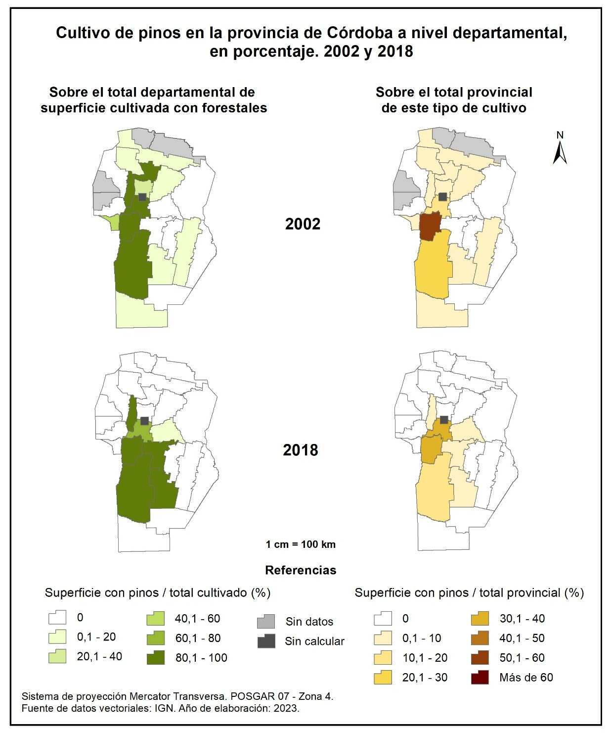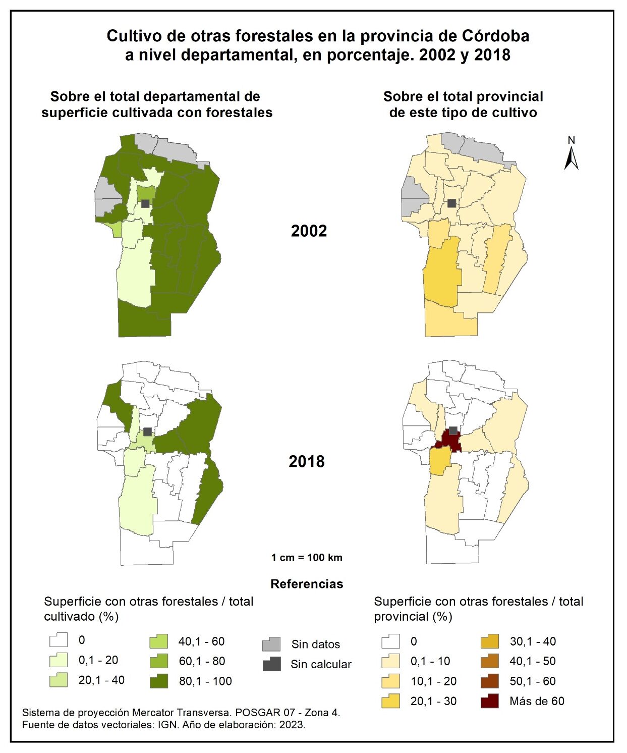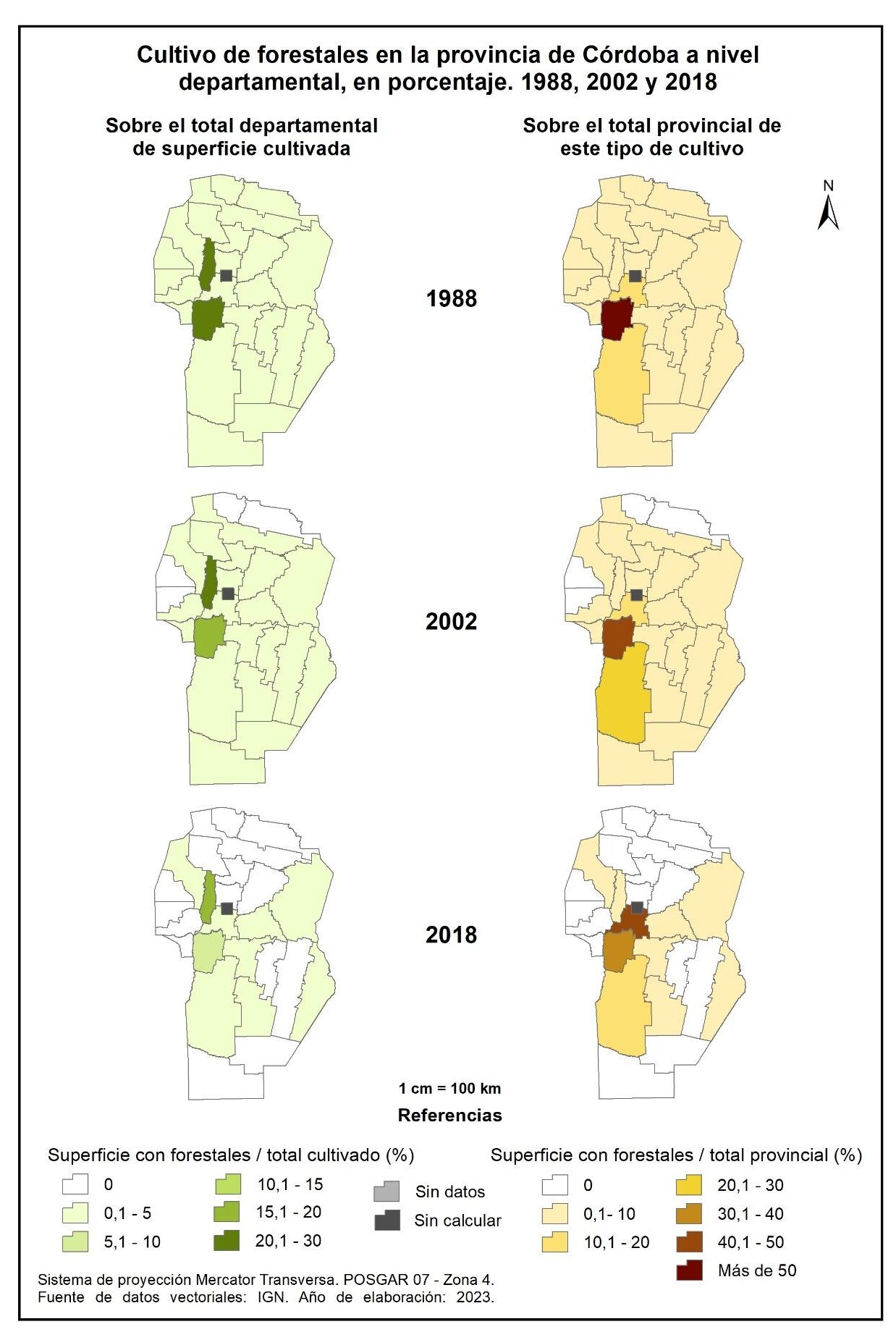 Figura 3.11. Cultivo de forestales en la provincia de Córdoba a nivel departamental, en porcentaje. Años 1988, 2002 y 2018.