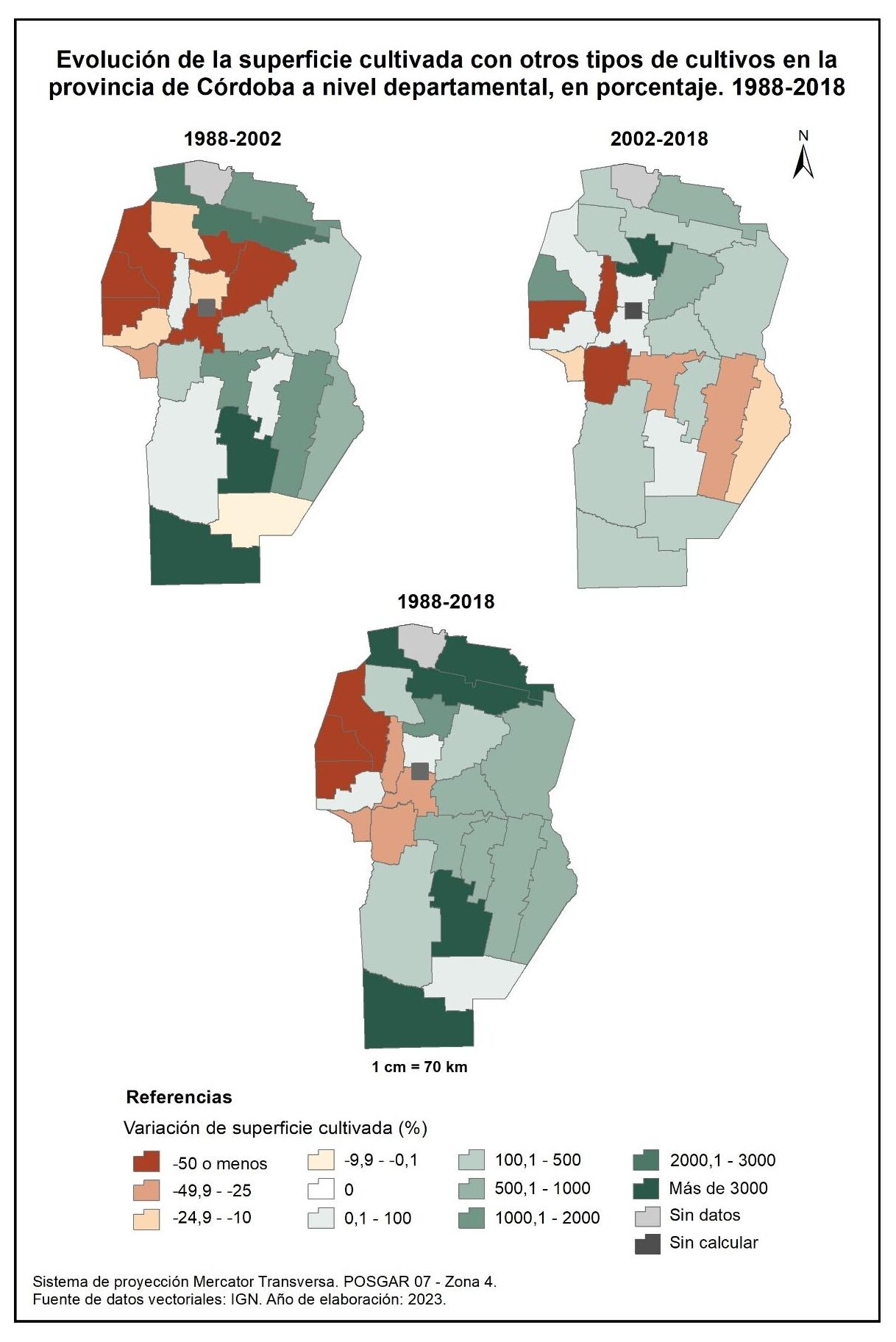 En la totalidad del corte temporal analizado (1988-2018) la mayor parte de la provincia muestra un aumento en la superficie implantada con otros cultivos, con un valor promedio del 113%. La excepción la constituyen la mayoría de los departamentos del oeste, entre los cuales Cruz del Eje, Minas y Pocho evidencian una disminución del -50% o menos, y Punilla, Santa María, Calamuchita y San Javier, una reducción de entre el -25 y -50%.