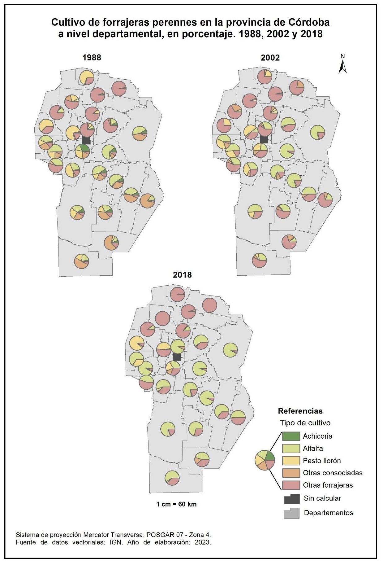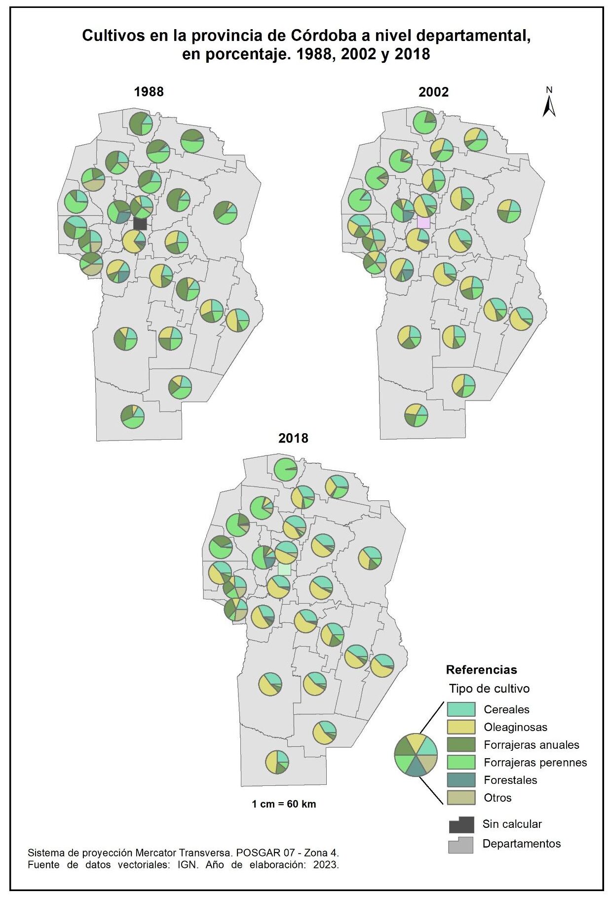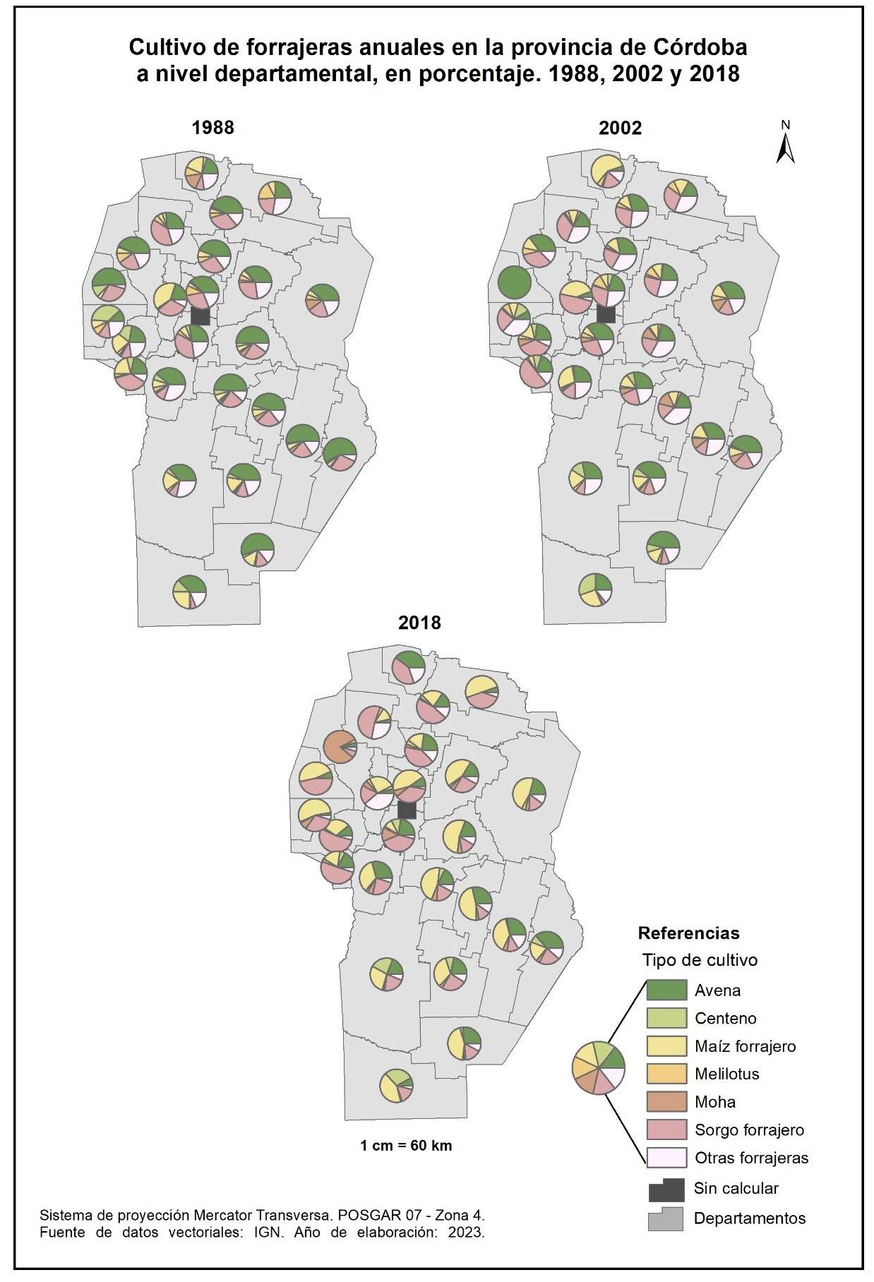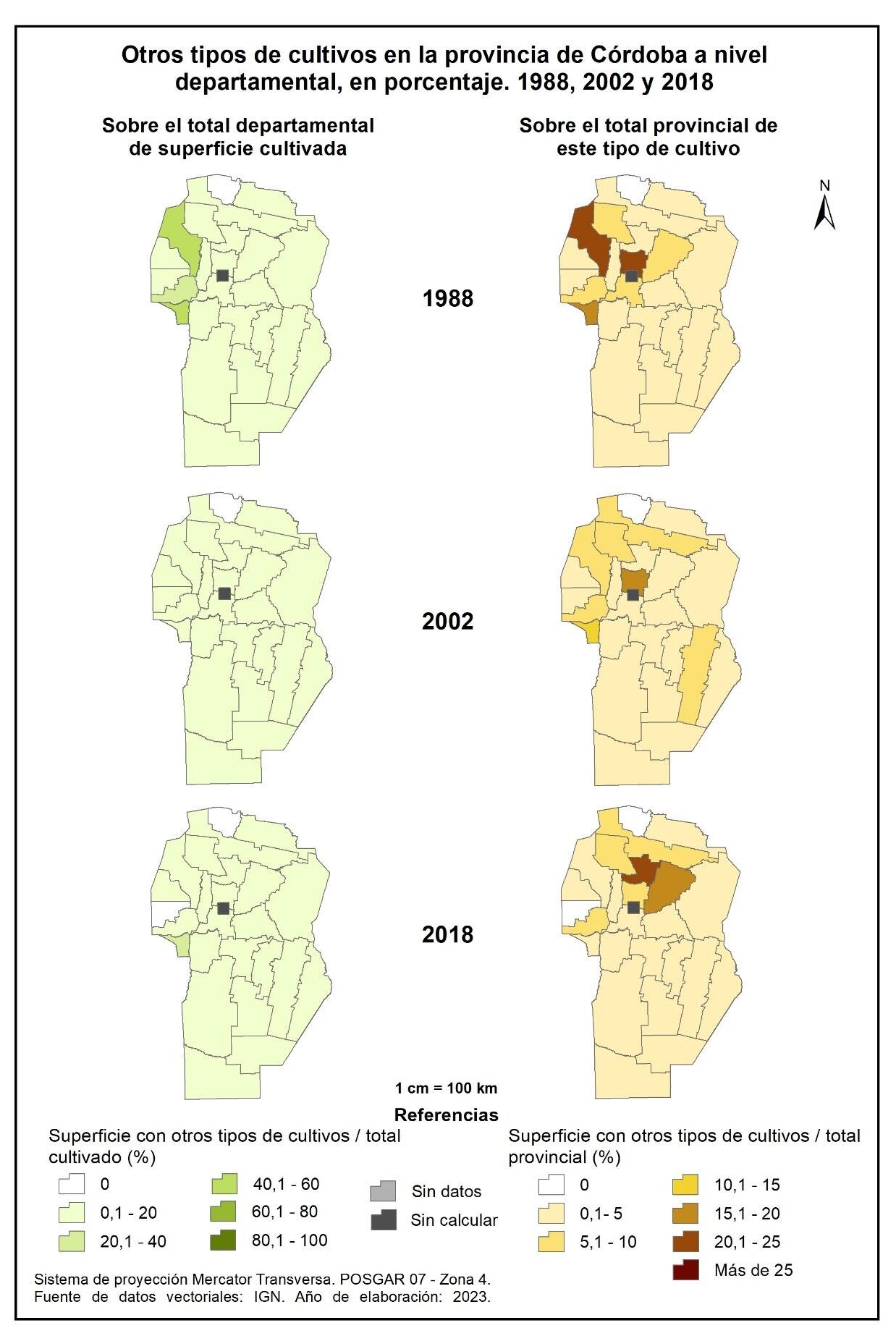 Figura 3.17. Cultivos en la provincia de Córdoba a nivel departamental. Años 1988, 2002 y 2018.