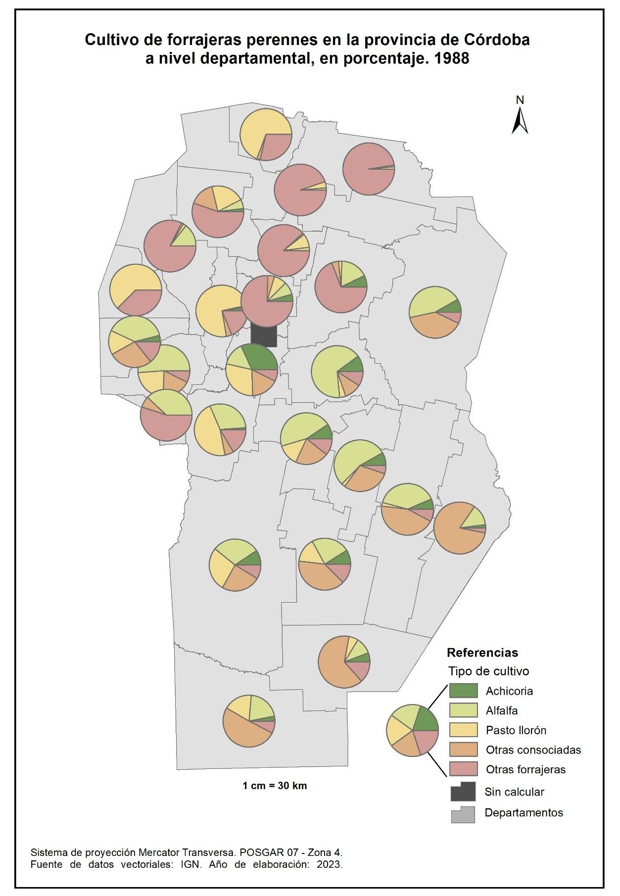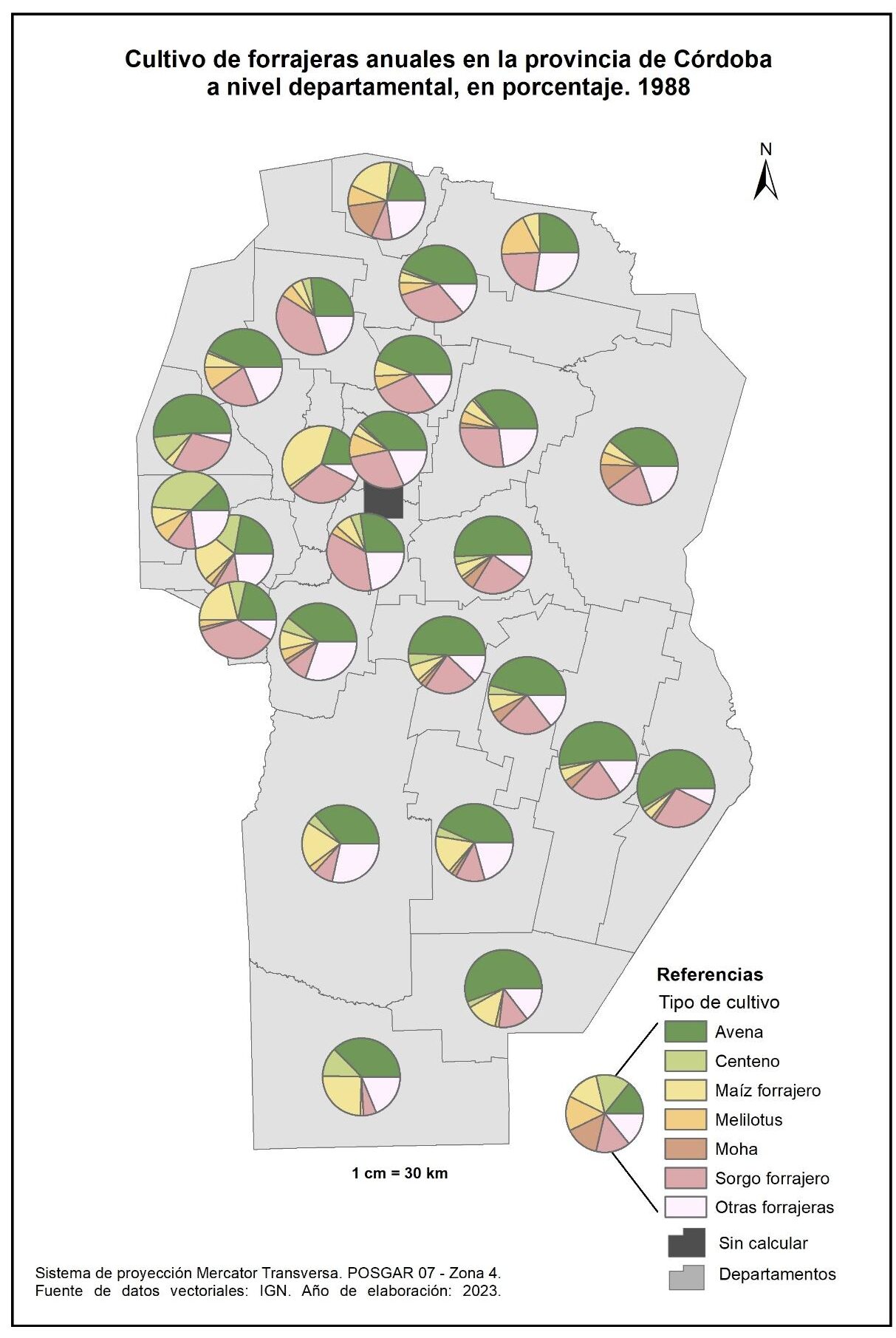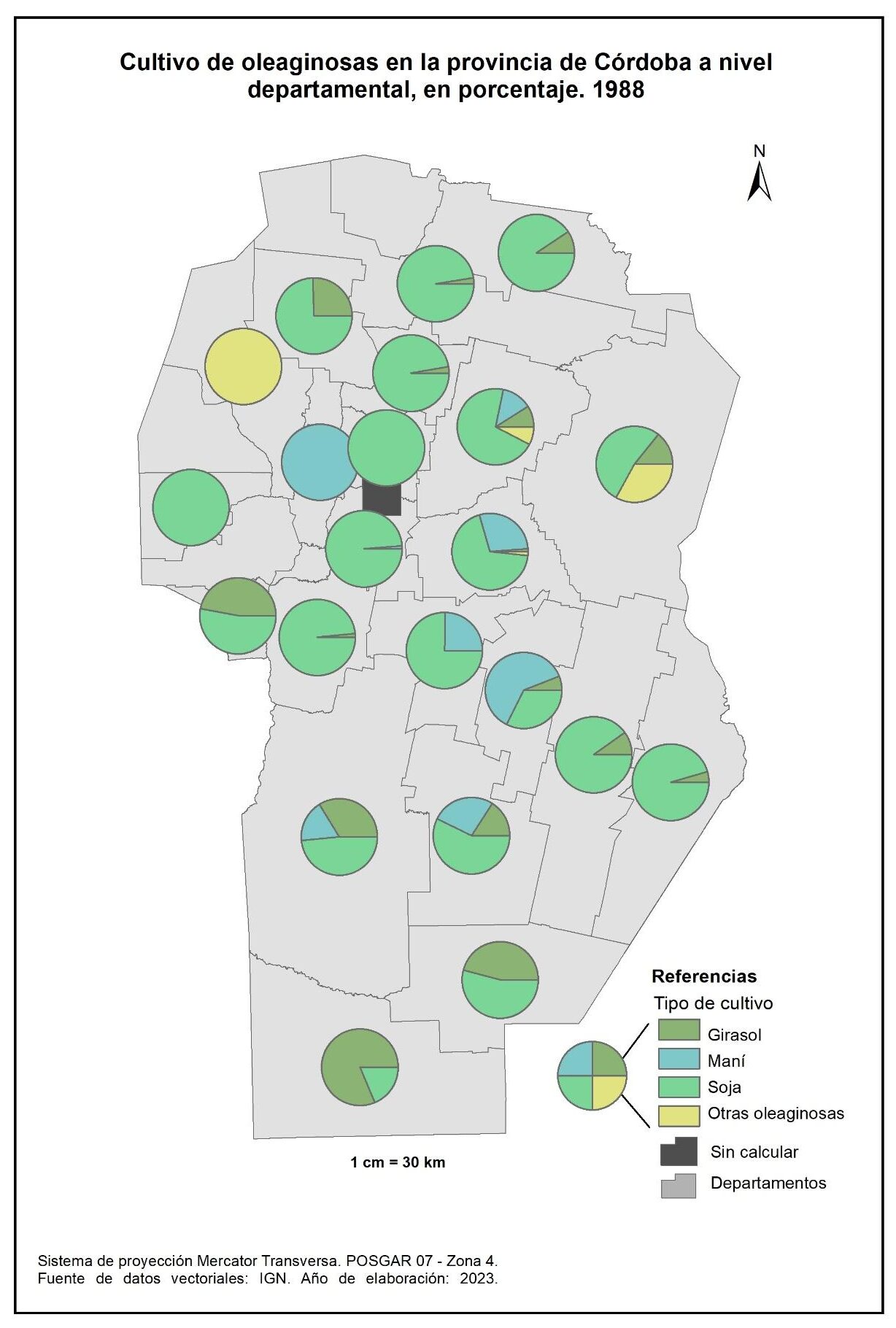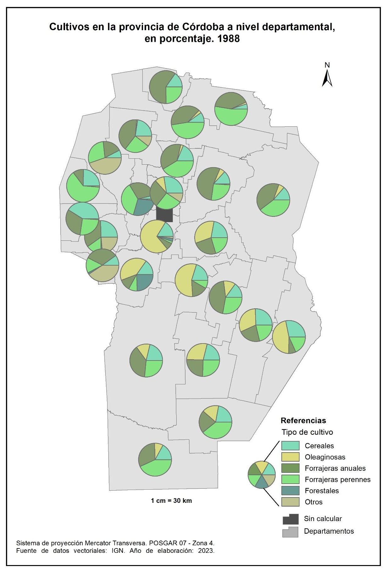 Figura 3.14. Cultivos en la provincia de Córdoba a nivel departamental. Año 1988.