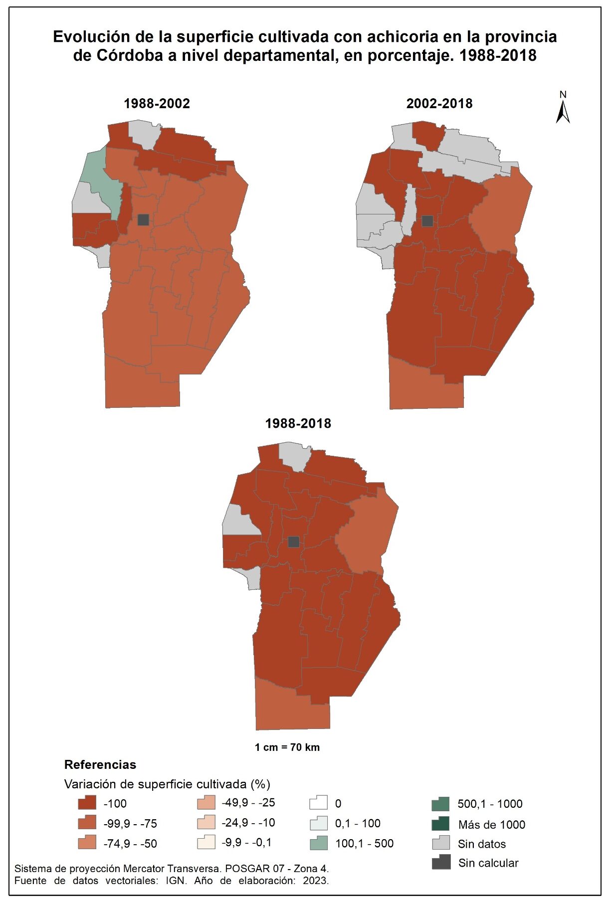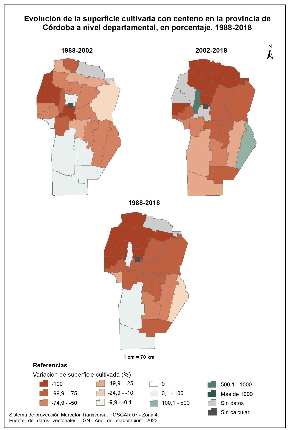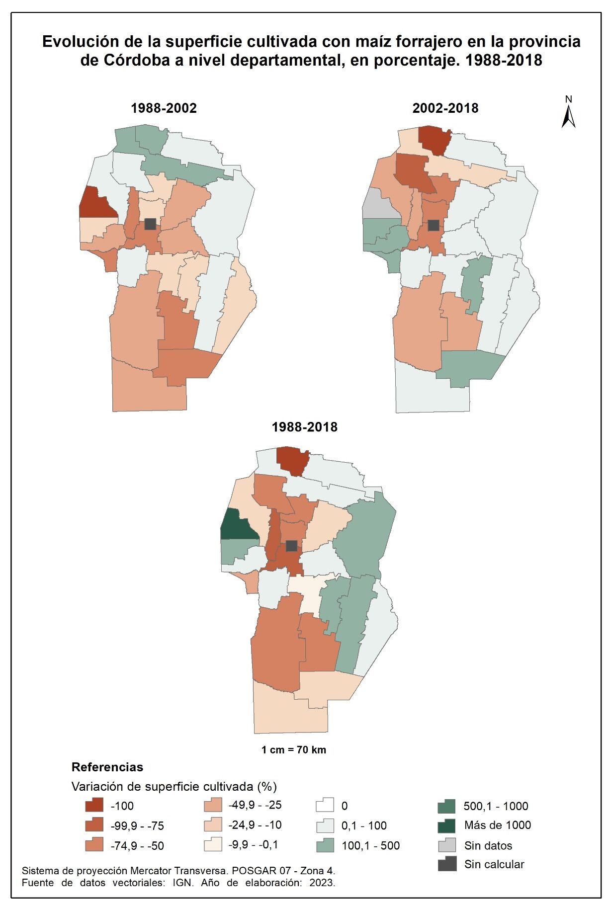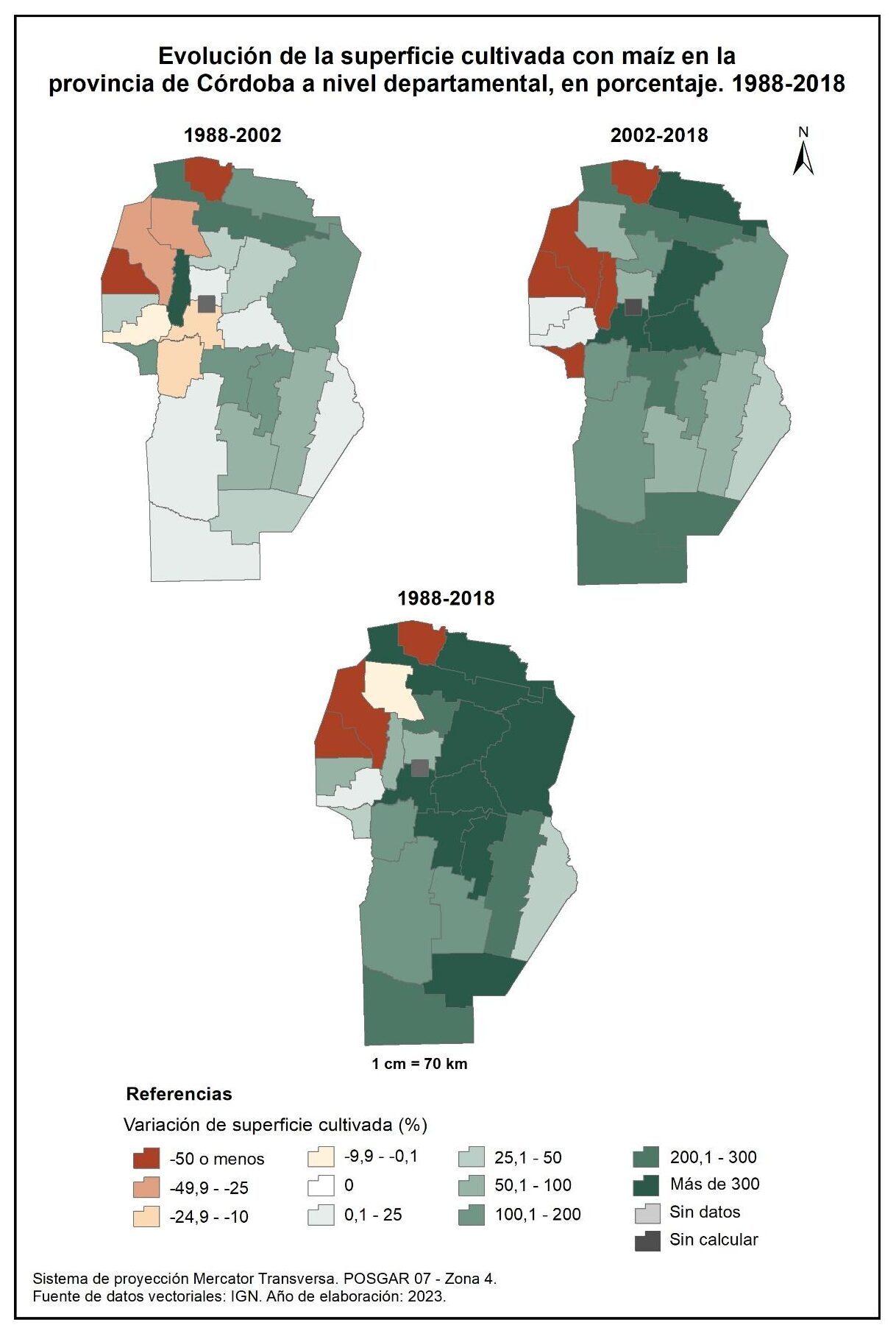 La superficie cultivada con maíz (figura 3.18), en la totalidad del corte temporal analizado (1988-2018), evidencia un aumento considerable, con valores que superan el 300%, en gran parte de los departamentos del noreste y norte provincial a los que se suma Presidente Roque Sáenz Peña. En oposición, Sobremonte, Cruz del Eje y Minas disminuyen la superficie cultivada con maíz en valores de -50 o menos, mientras que Ischilín registra valores de entre el -10 y -0,1%.