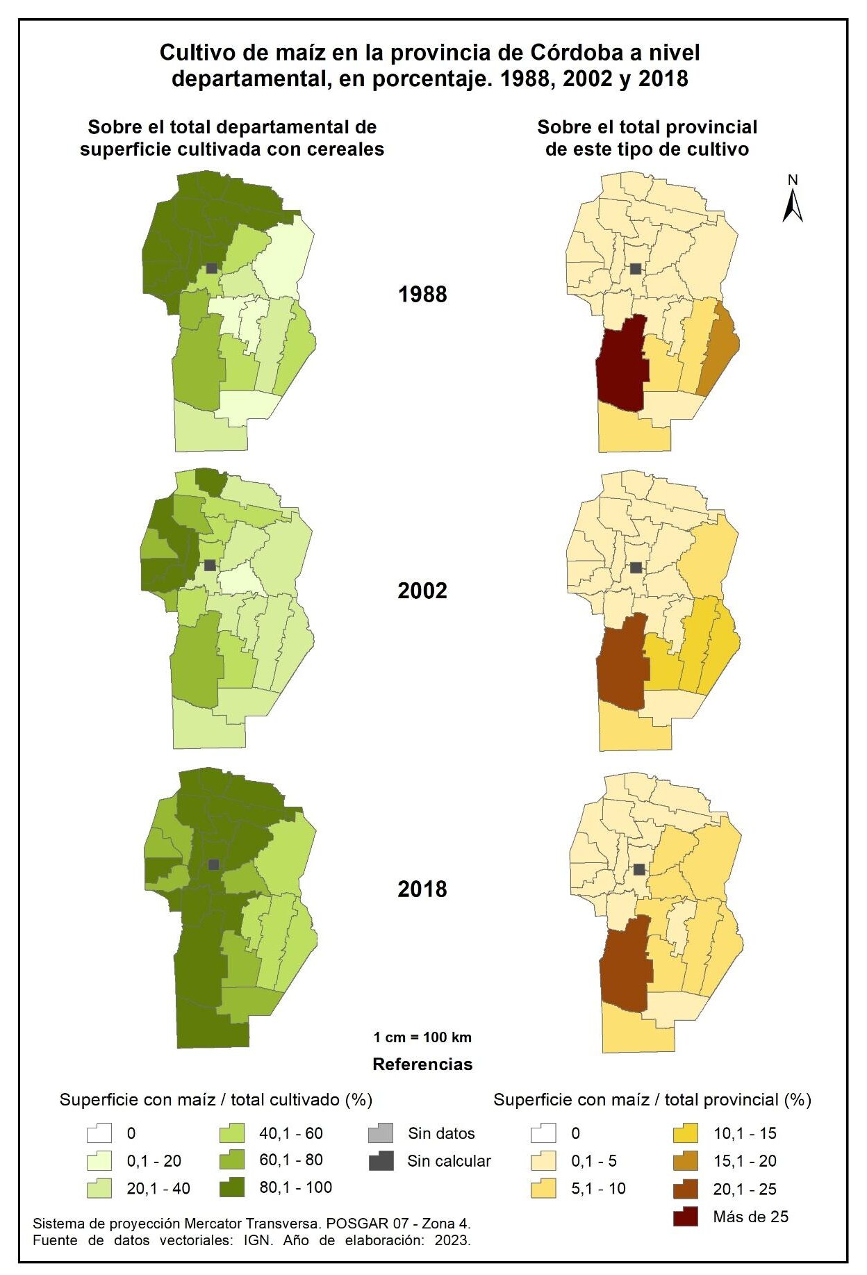 Figura 3.19. Cultivo de maíz en la provincia de Córdoba a nivel departamental, en porcentaje. Años 1988, 2002 y 2018.