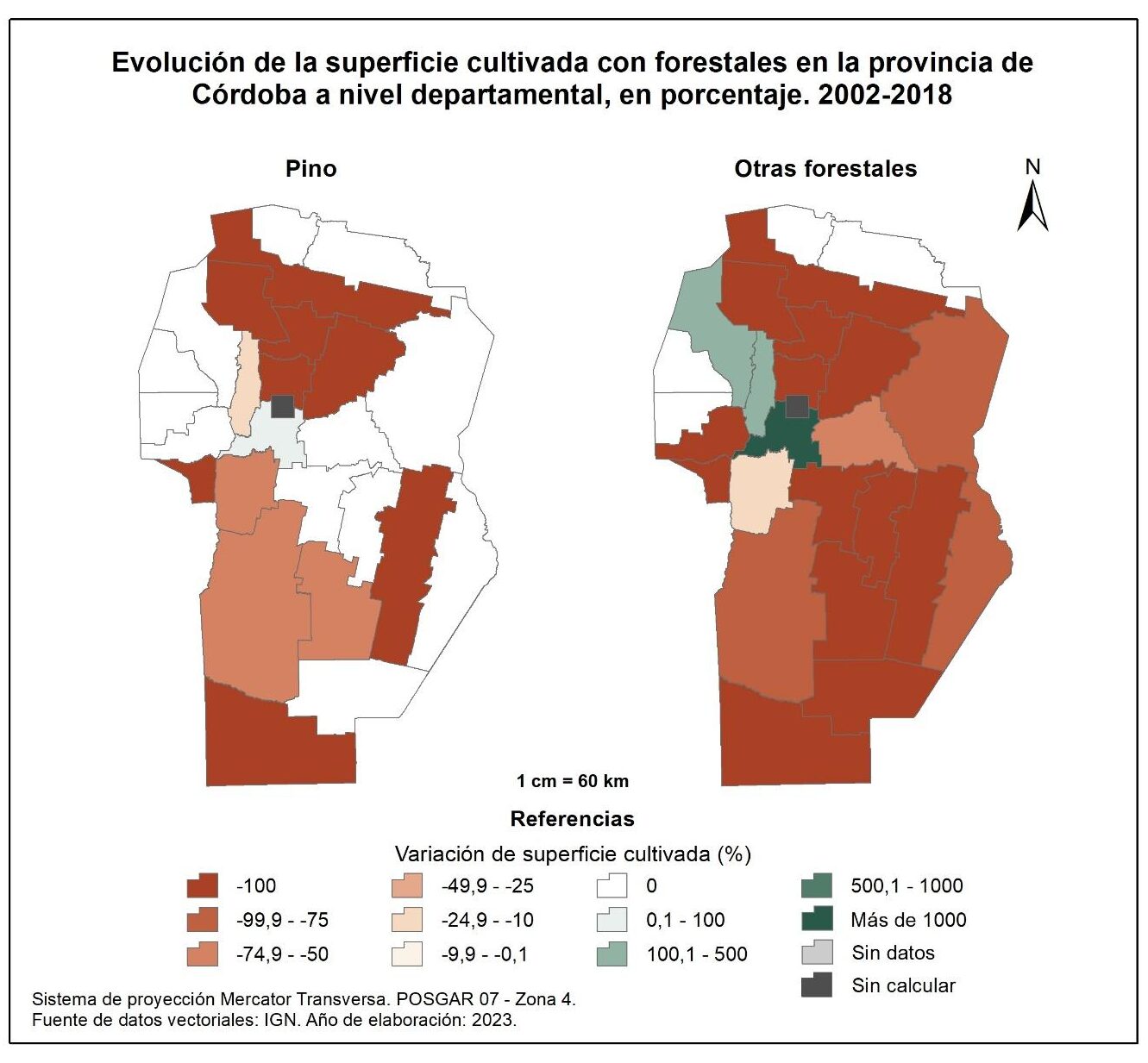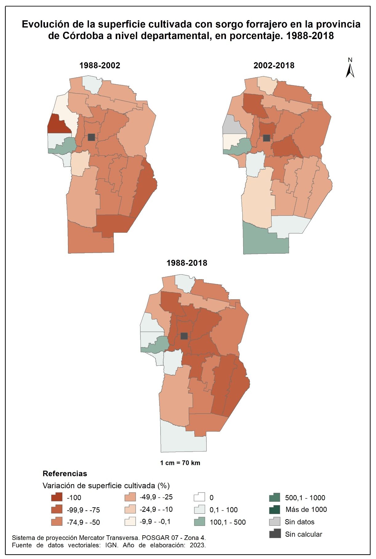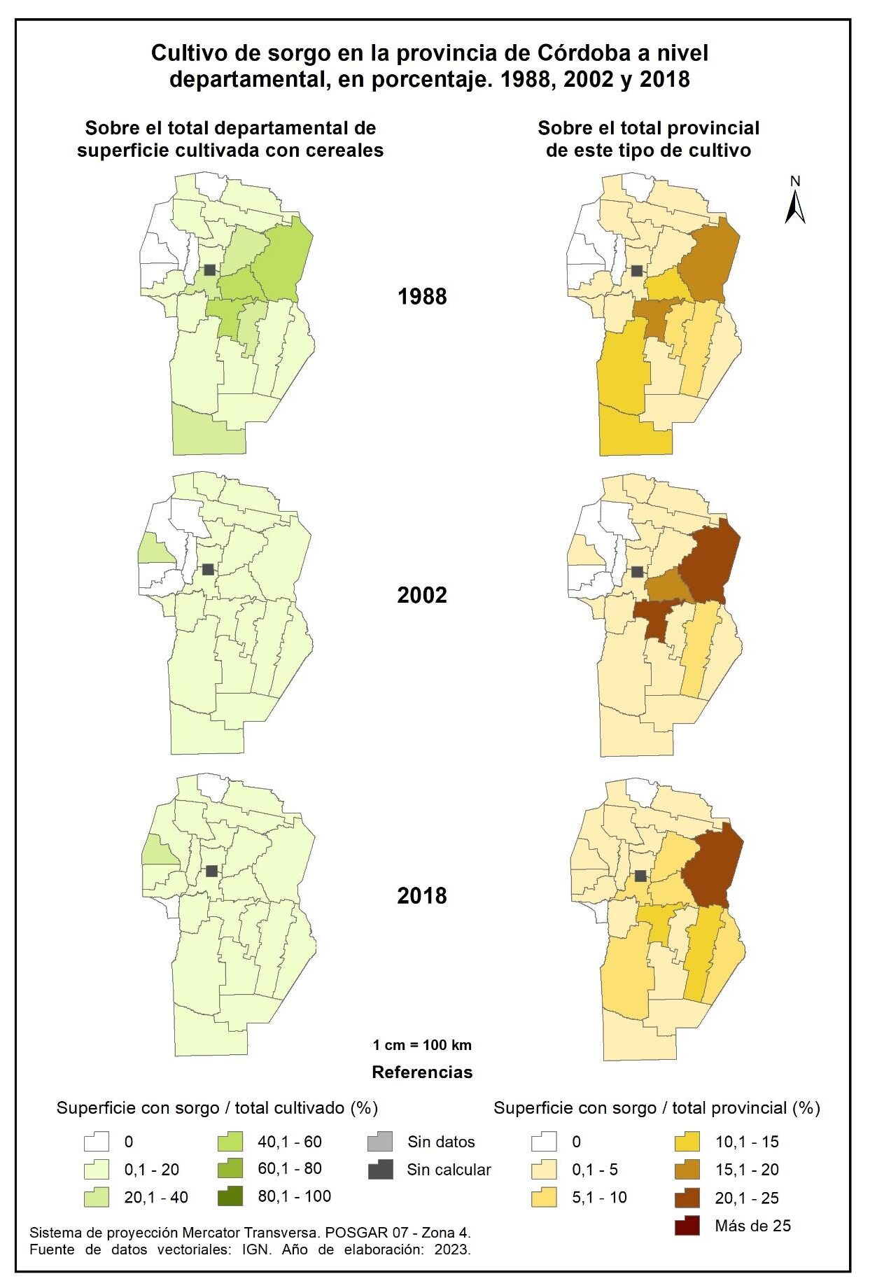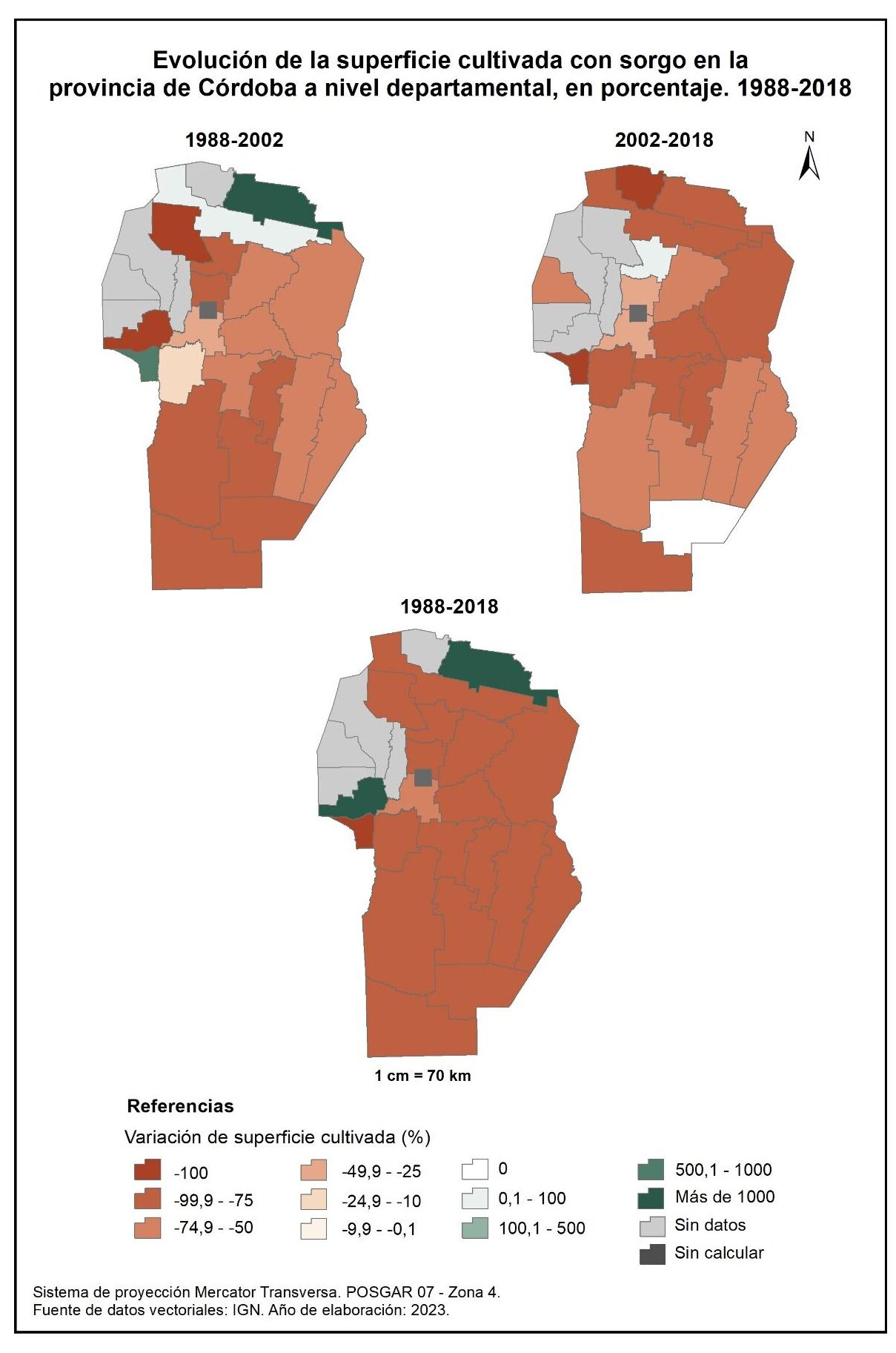 Para el período 1988-2002, la superficie cultivada con sorgo se redujo en un -72% a nivel general. Esta reducción se concentra mayormente en los departamentos del sur de la provincia y algunos del oeste –San Alberto e Ischilín–. Constituyen la excepción Río Seco (22.550%), San Javier (617%) y Tulumba (11%) en los que se observa un incremento de la superficie con sorgo. Por su parte, para el período 2002-2018 prácticamente todos los departamentos registran una disminución del cultivo de sorgo, a excepción de Totoral que incrementa un 56%.