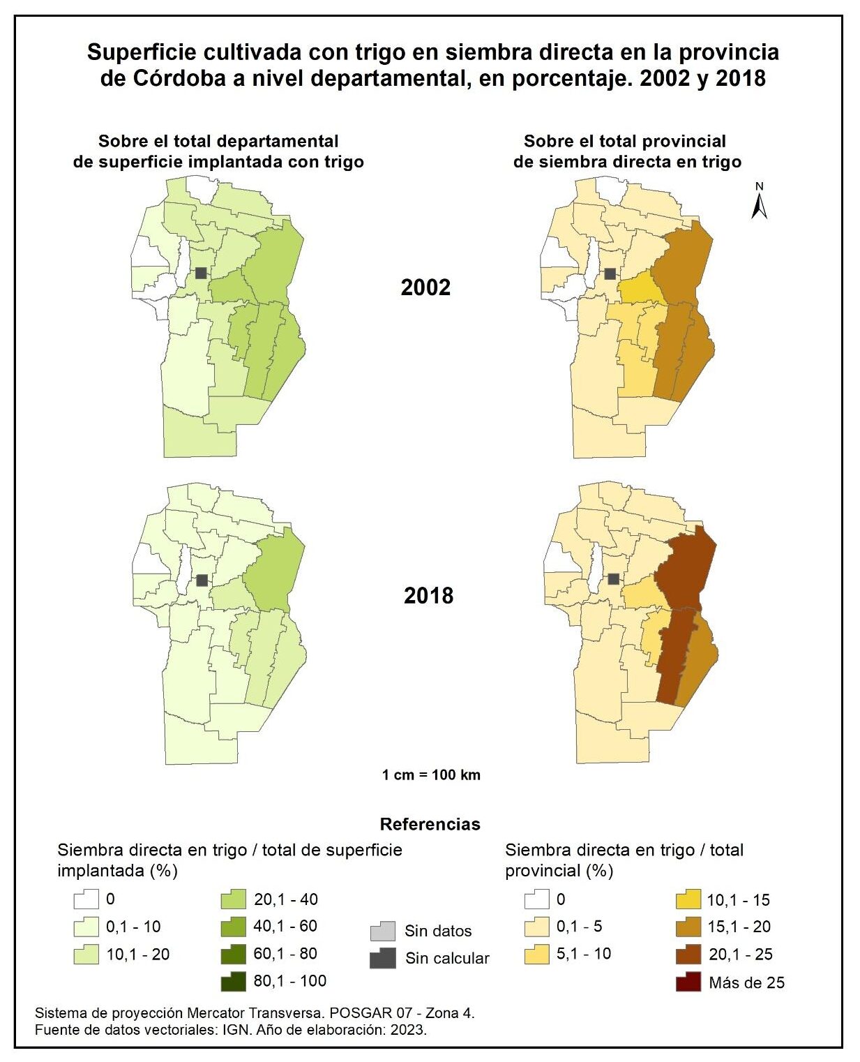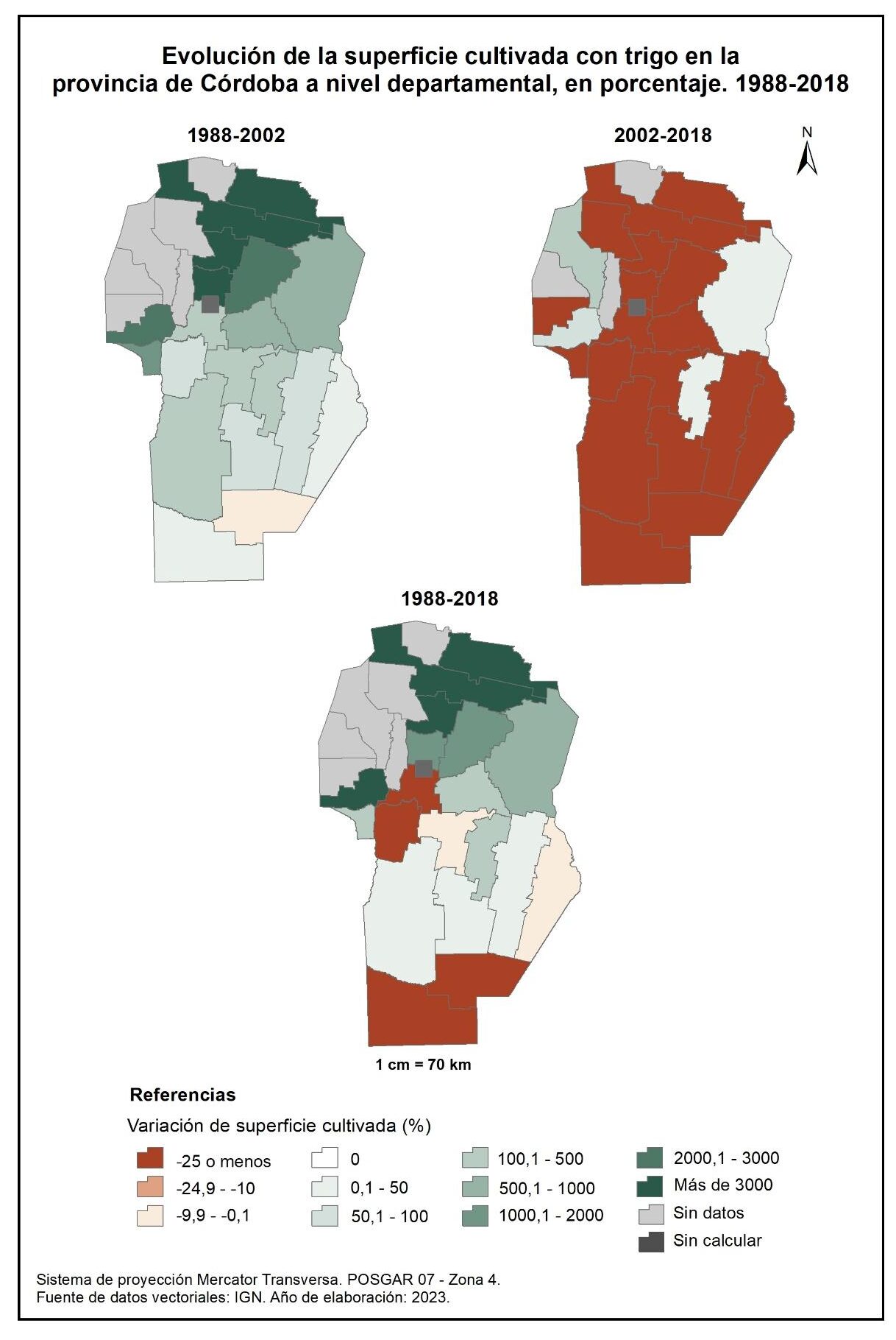 Para el primer período (1988-2002), el crecimiento intercensal fue del 149% a nivel provincial. Este fue más marcado en algunos departamentos del noreste y oeste, mientras que el único que registra un decrecimiento es Presidente Roque Sáenz Peña. En el segundo período (2002-2018) la superficie cultivada con trigo evidenció una disminución promedio del -40%, la que se traduce en valores negativos en casi todos los departamentos, a excepción de San Justo, Cruz del Eje, San Alberto y General San Martín que presentan un aumento de la superficie cultivada con trigo entre el 0,1 y 500%.