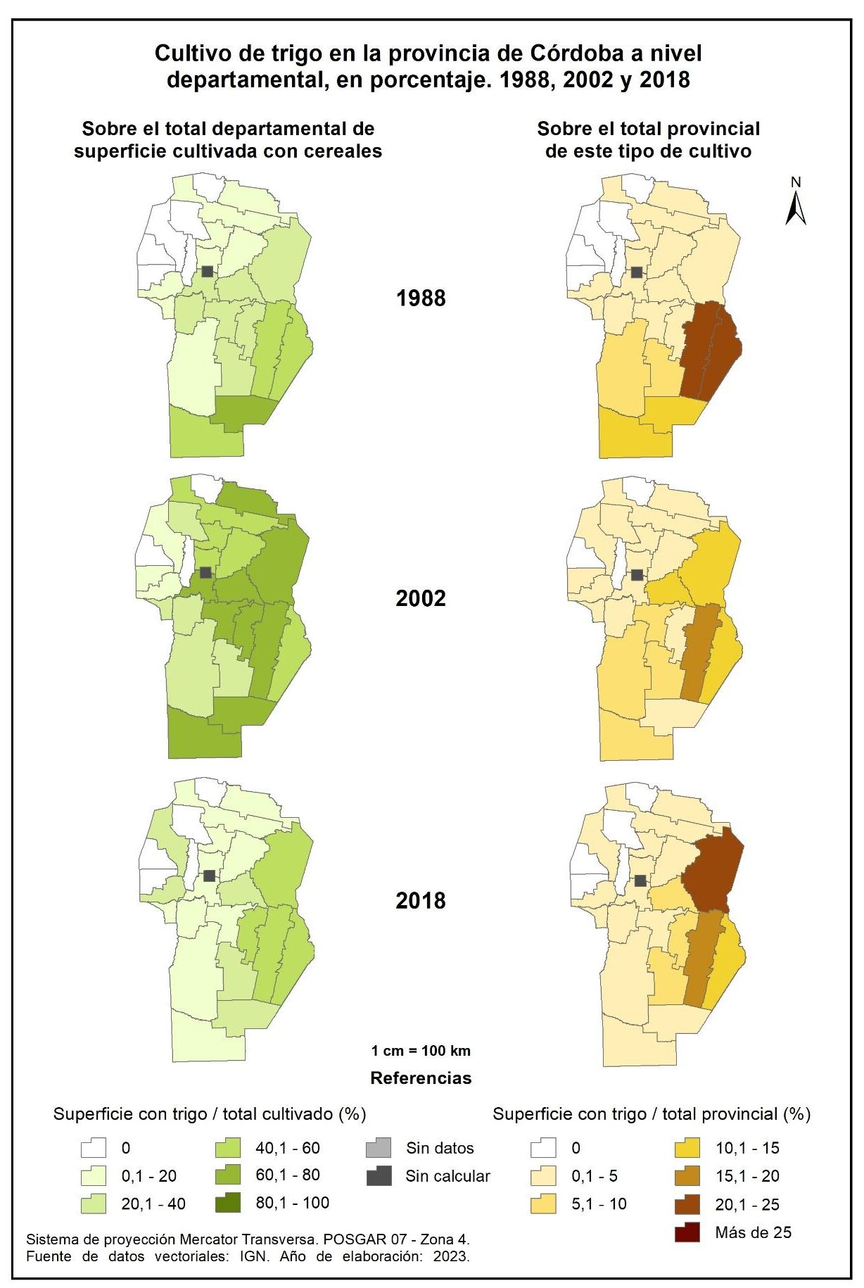 Figura 3.23. Cultivo de trigo en la provincia de Córdoba a nivel departamental, en porcentaje. Años 1988, 2002 y 2018.