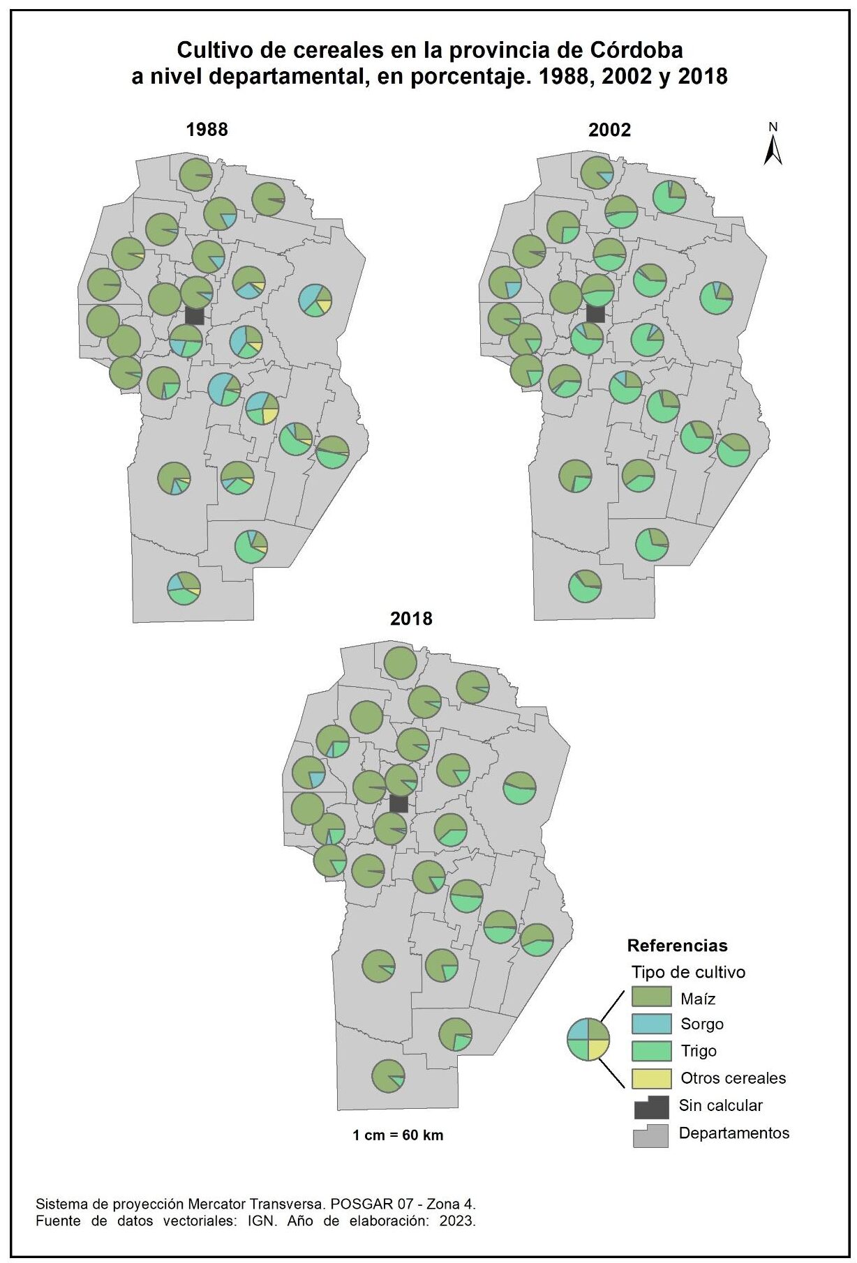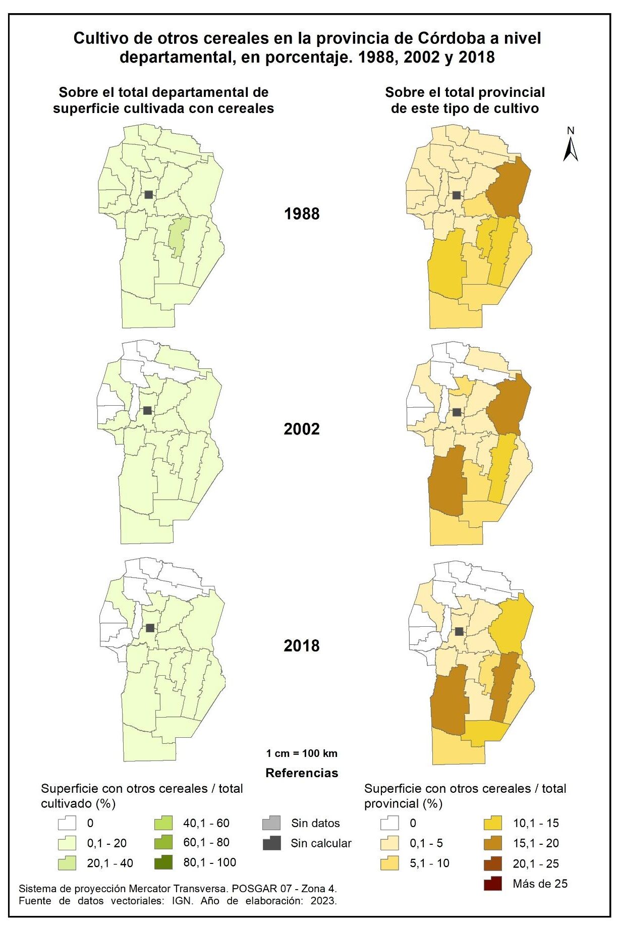 Figura 3.29. Cultivo de cereales en la provincia de Córdoba a nivel departamental. Años 1988, 2002 y 2018.