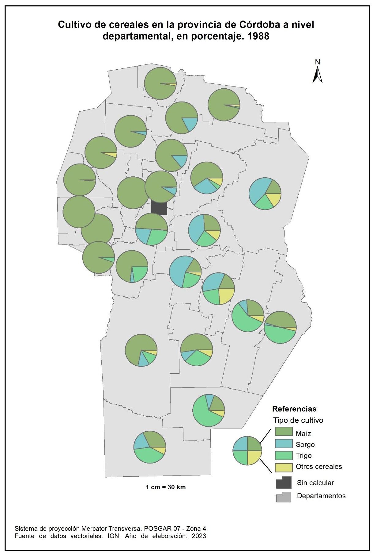 Figura 3.26. Cultivo de cereales en la provincia de Córdoba a nivel departamental. Año 1988.