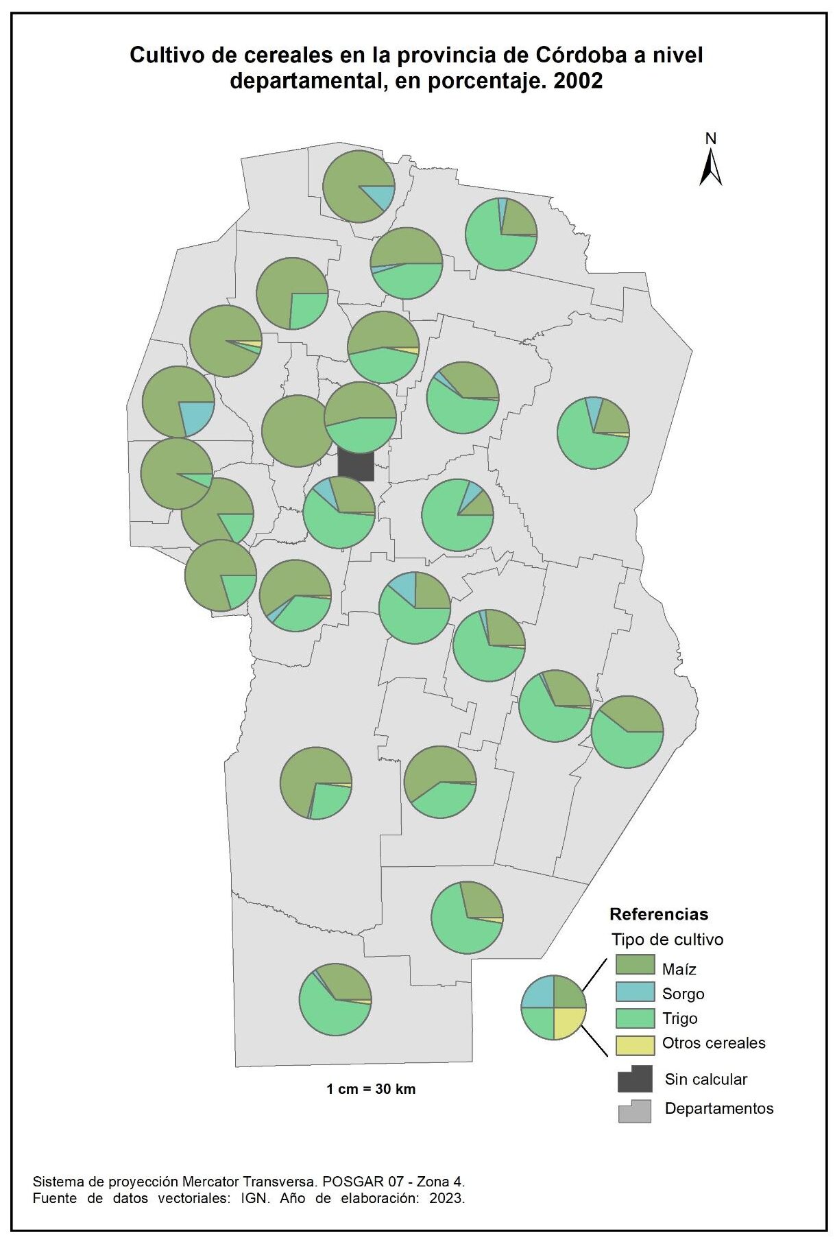 Figura 3.27. Cultivo de cereales en la provincia de Córdoba a nivel departamental. Año 2002.