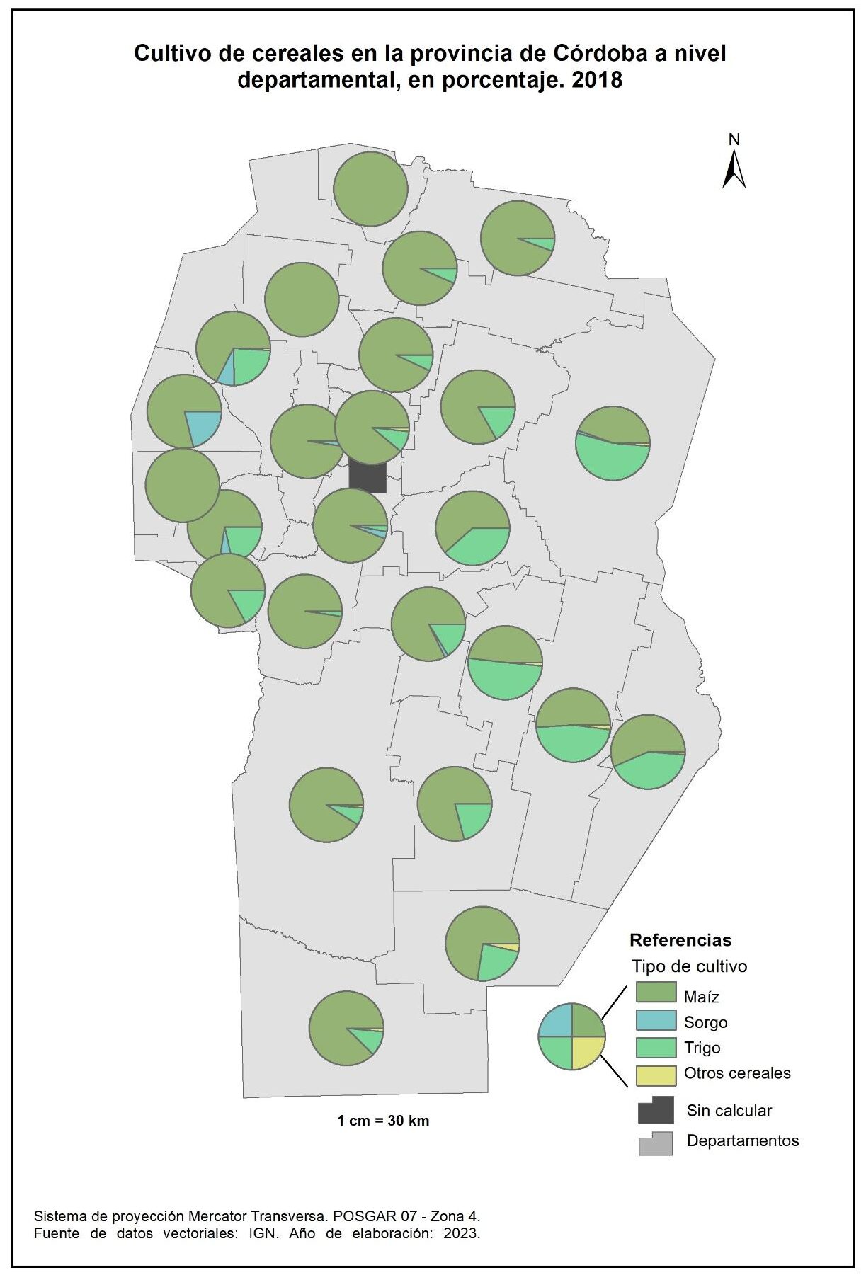 Figura 3.28. Cultivos de cereales en la provincia de Córdoba a nivel departamental. Año 2018.