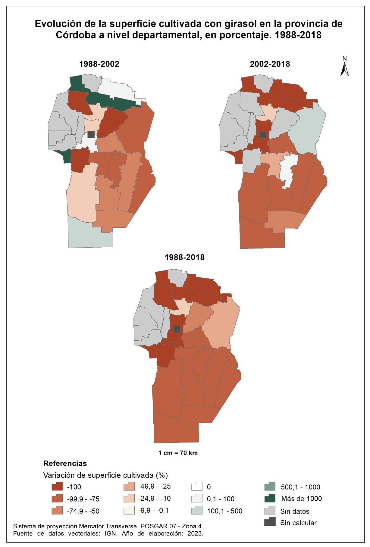 Por tanto, en la totalidad del corte temporal analizado (1988-2018), la mayor parte de la provincia muestra una marcada disminución en el orden del -93% de la superficie cultivada con girasol.
