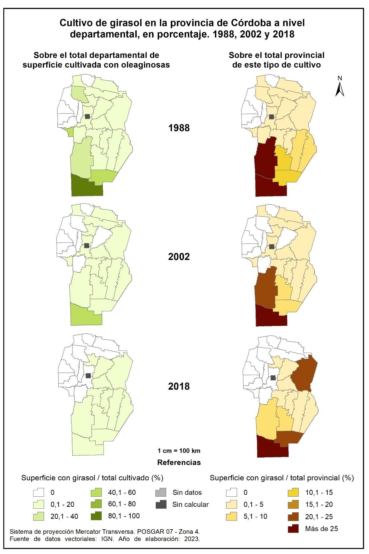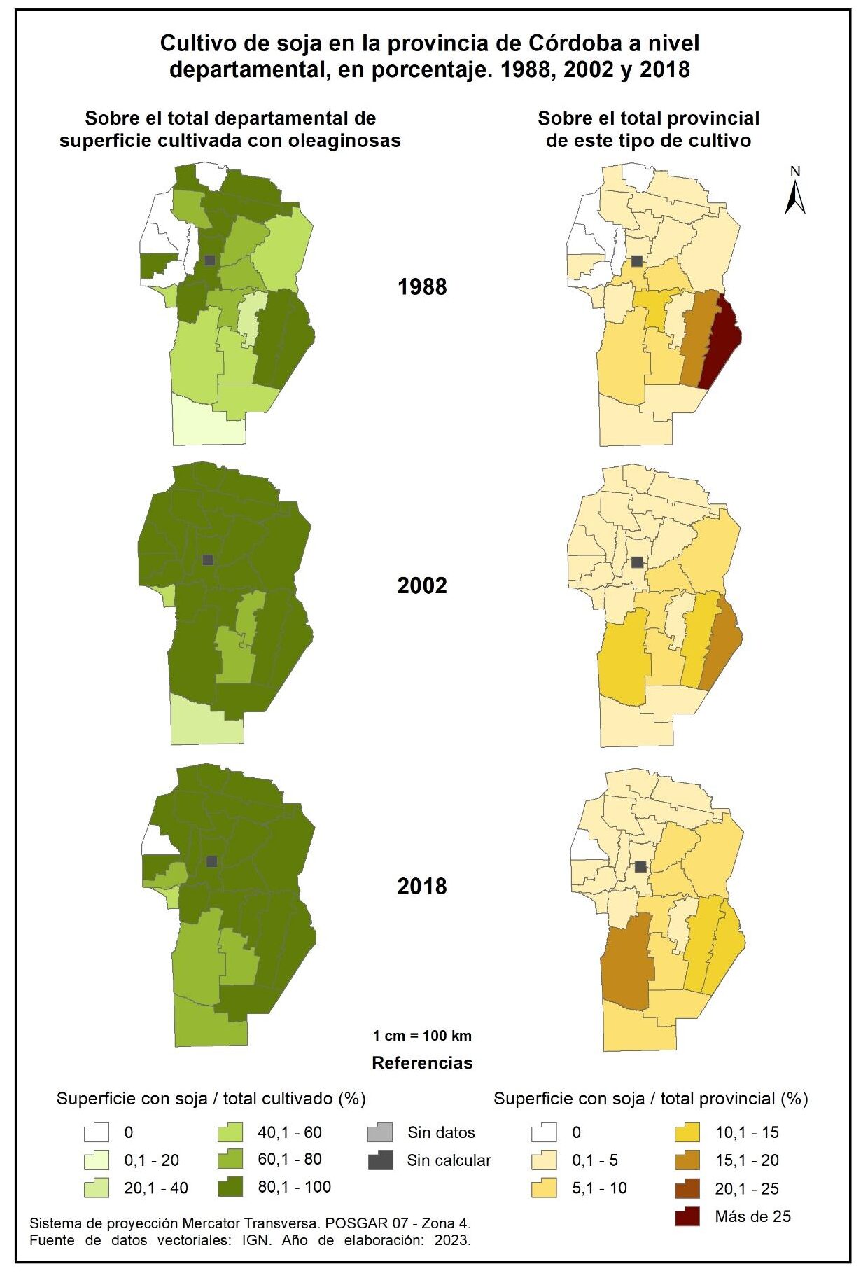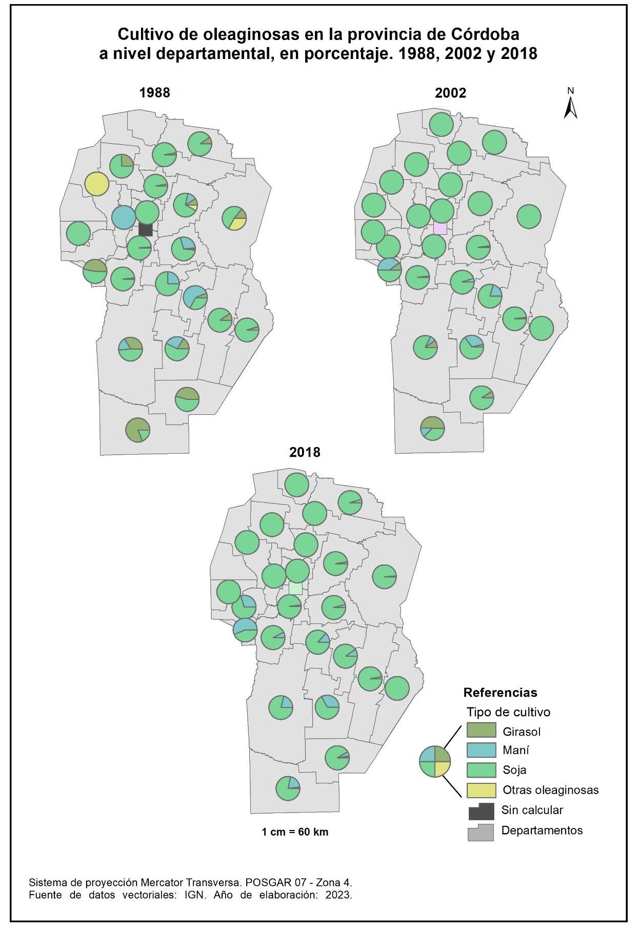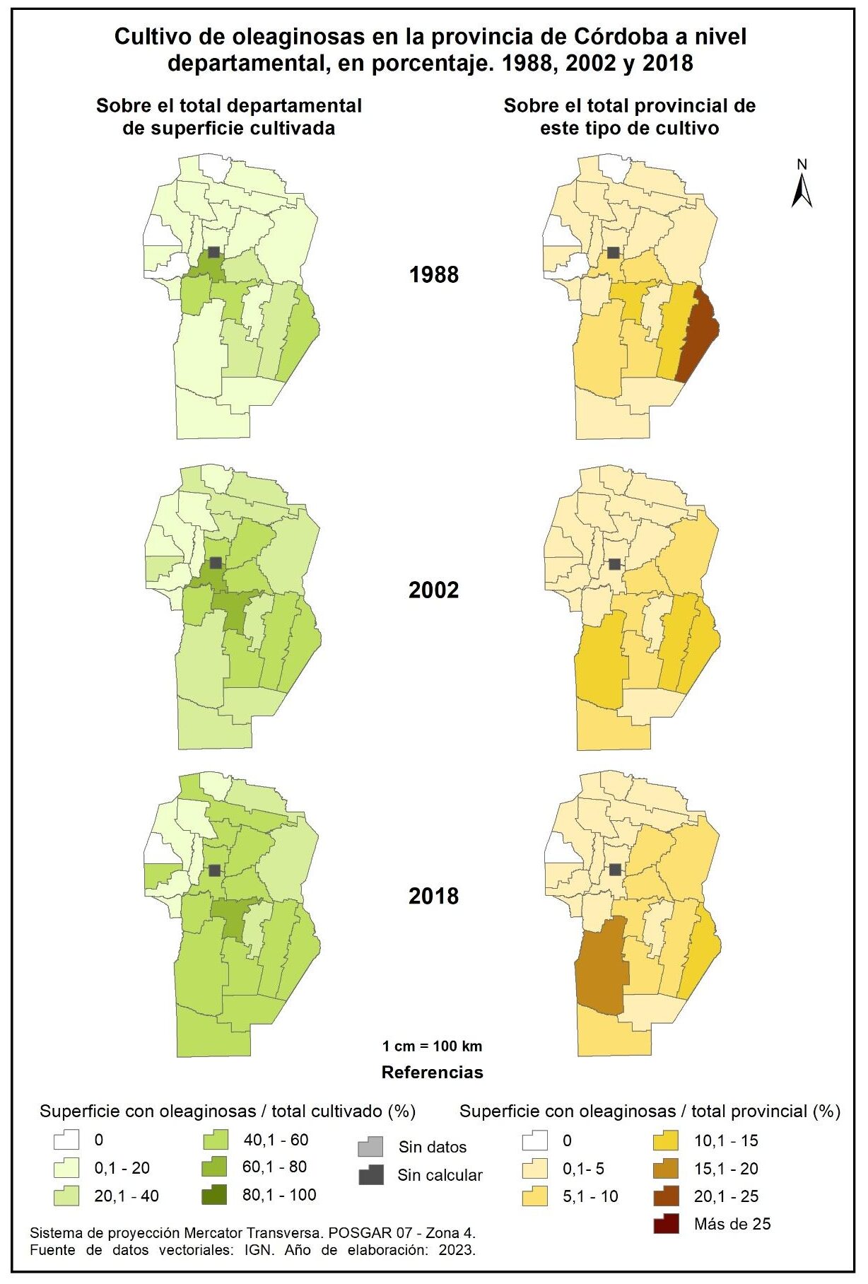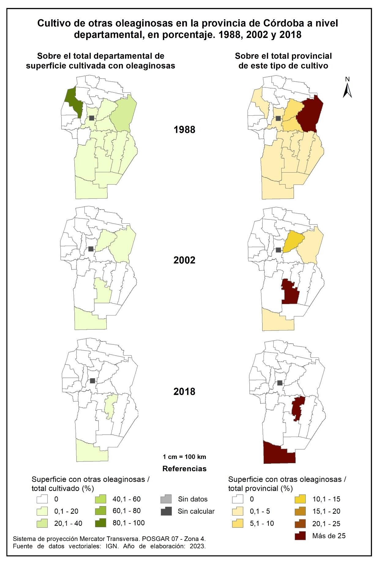 Figura 3.5. Cultivo de oleaginosas en la provincia de Córdoba a nivel departamental, en porcentaje. Años 1988, 2002 y 2018.