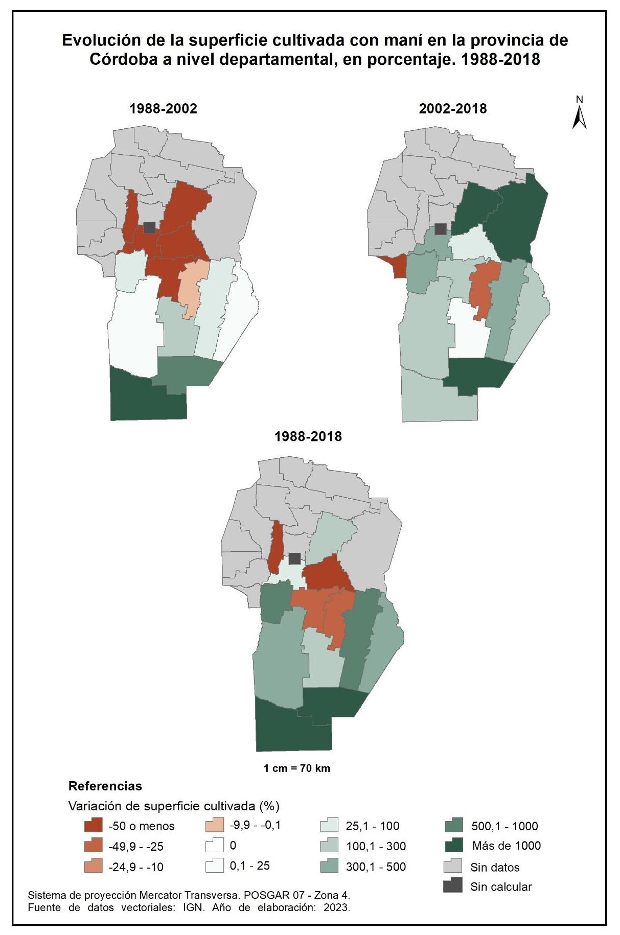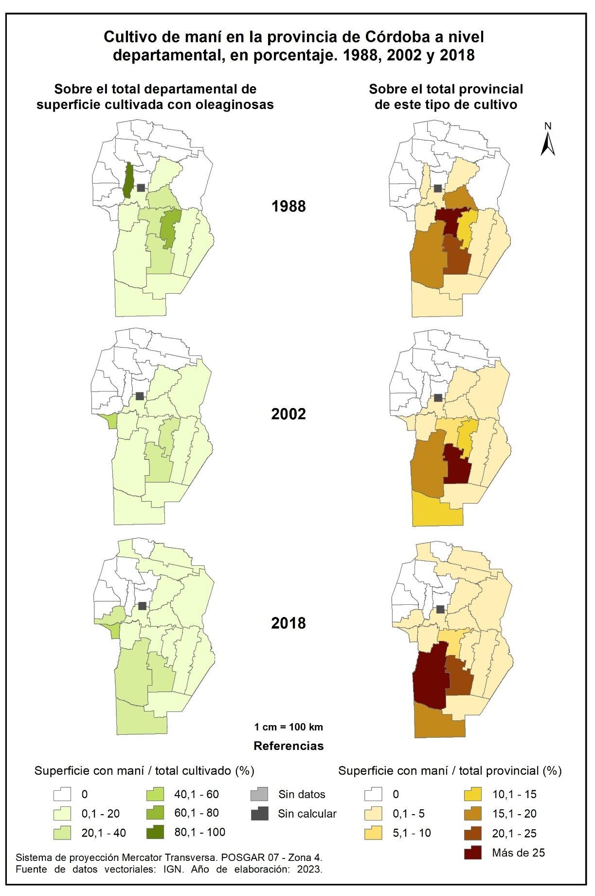 De esta manera, entre 1988 y 2018 el cultivo del maní se expande mayormente en el sur de Córdoba; los departamentos General Roca y Presidente Roque Sáenz Peña sobresalen con más del 1.000%.