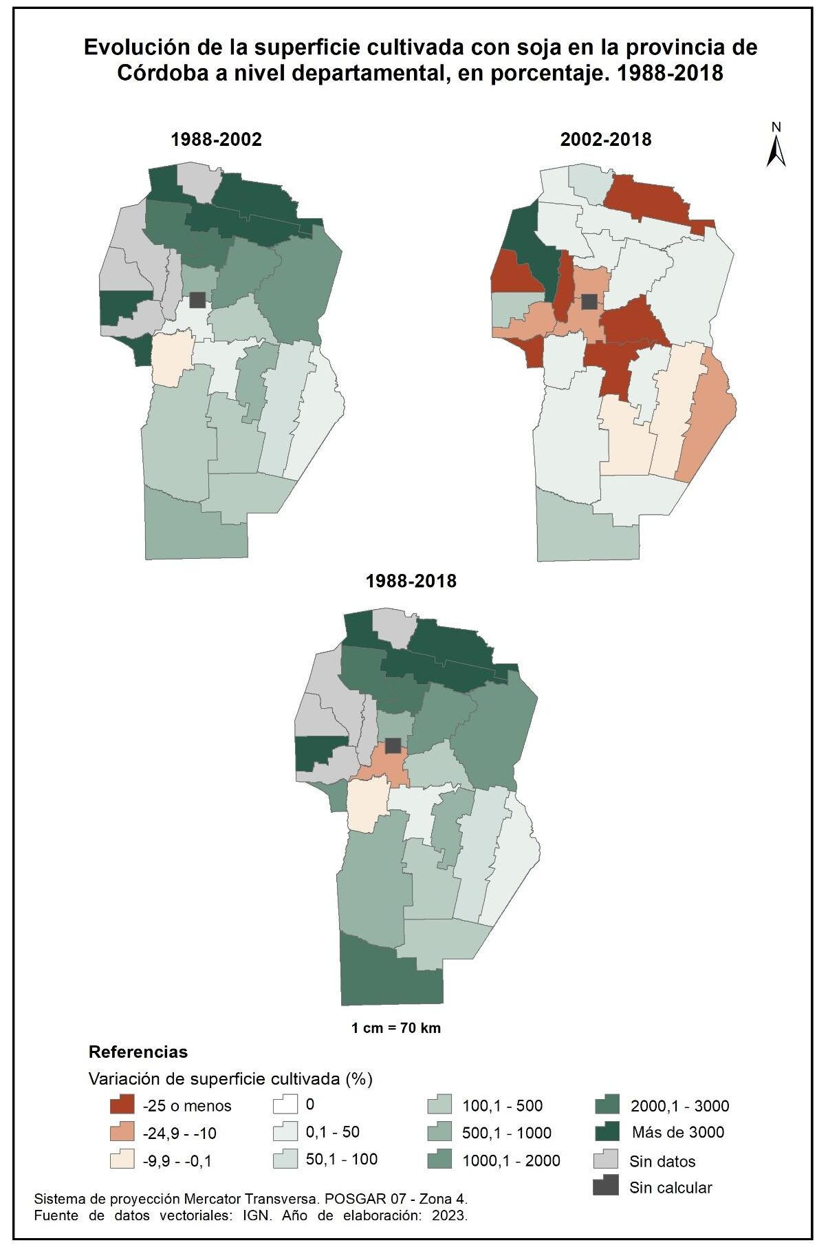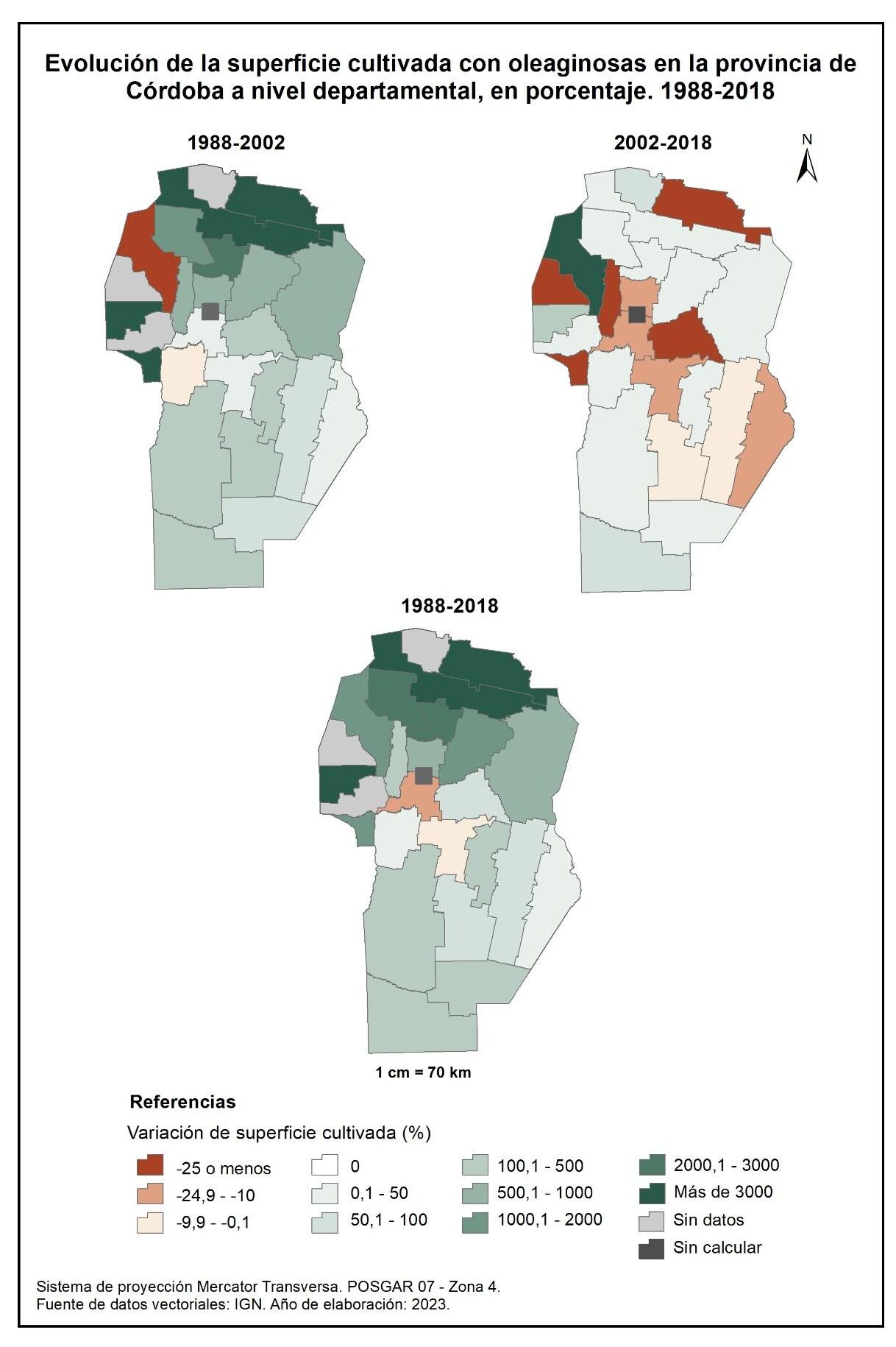 En la totalidad del corte temporal analizado (1988-2018) la mayor parte de la provincia evidencia un incremento en la superficie implantada con oleaginosas, cuyos valores no superan los 4.700%; se destaca el caso de Pocho con el 16.963%. La excepción la constituyen los departamentos Santa María y Tercero Arriba, con un leve decrecimiento.
