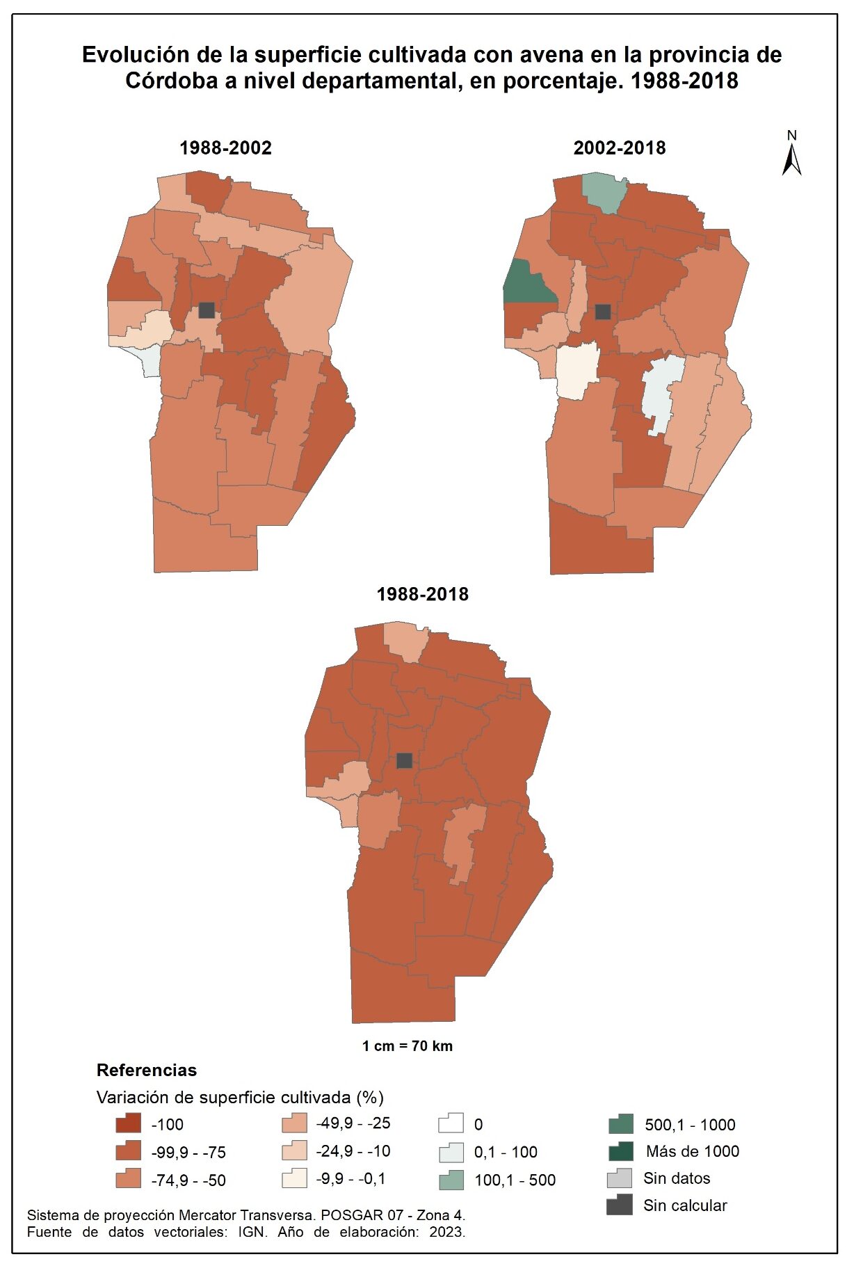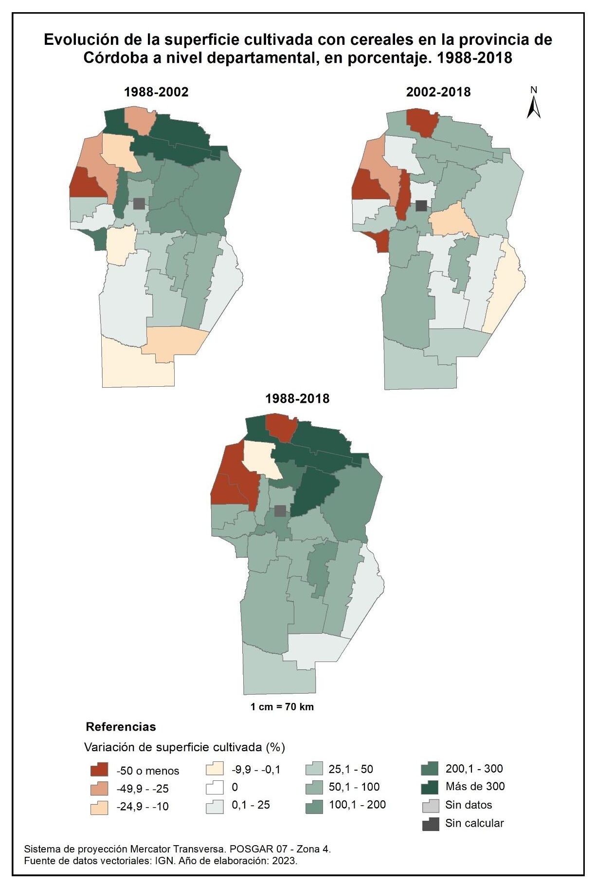 En la totalidad del corte temporal analizado (1988-2018) la mayor parte de la provincia evidencia un incremento en la superficie implantada con cereales, a excepción de cuatro departamentos (Sobremonte, Minas, Cruz del Eje e Ischilín).