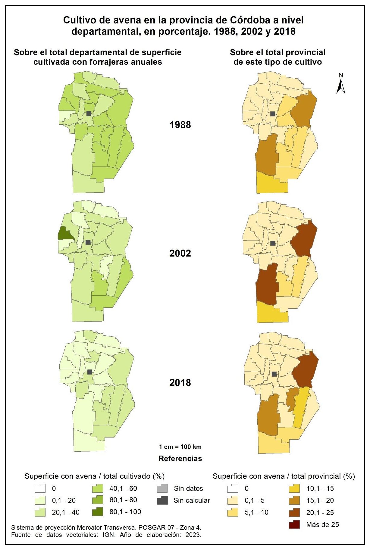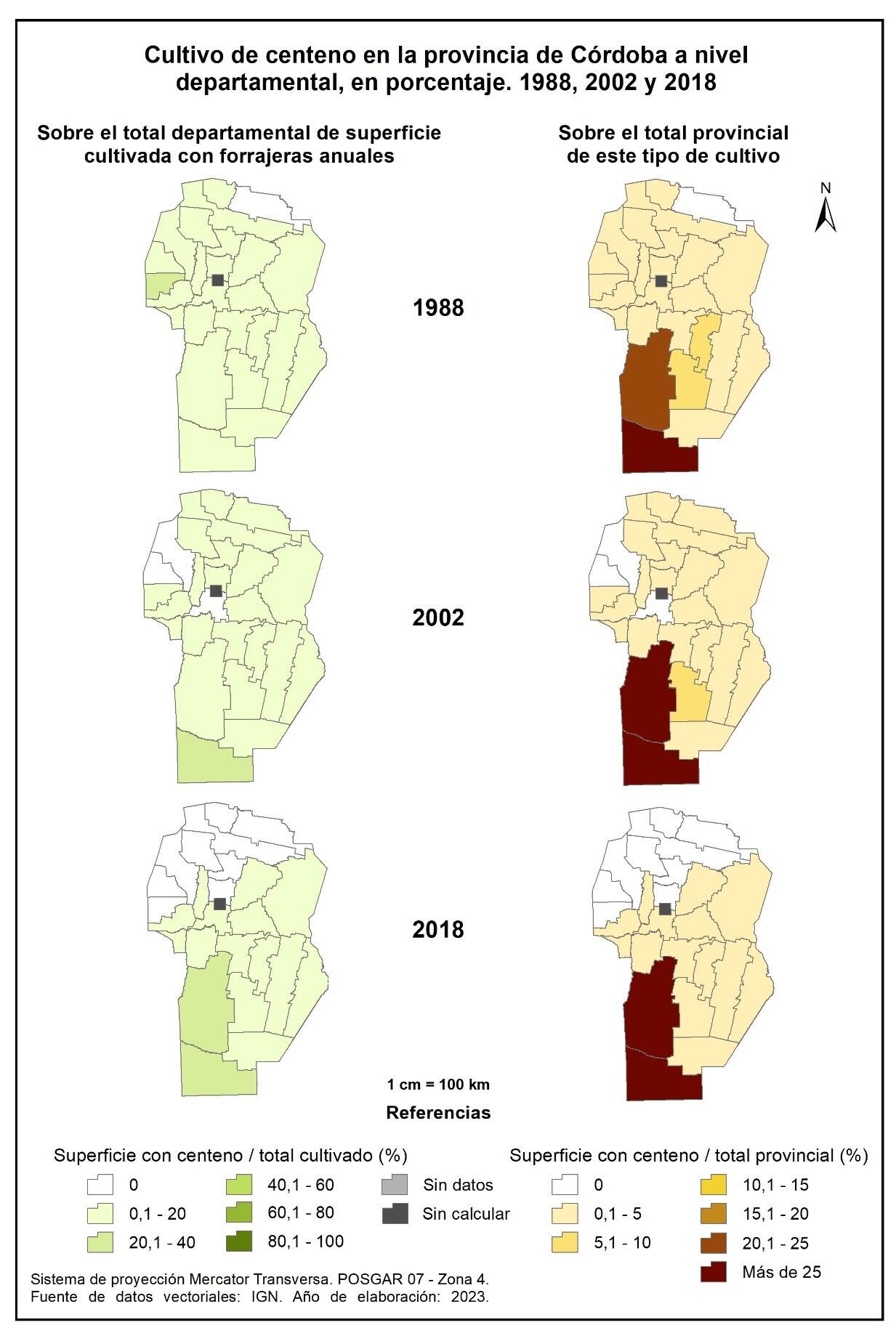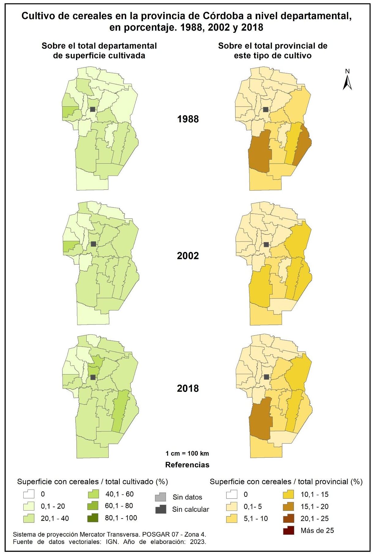 Figura 3.3. Cultivo de cereales en la provincia de Córdoba a nivel departamental, en porcentaje. Años 1988, 2002 y 2018.