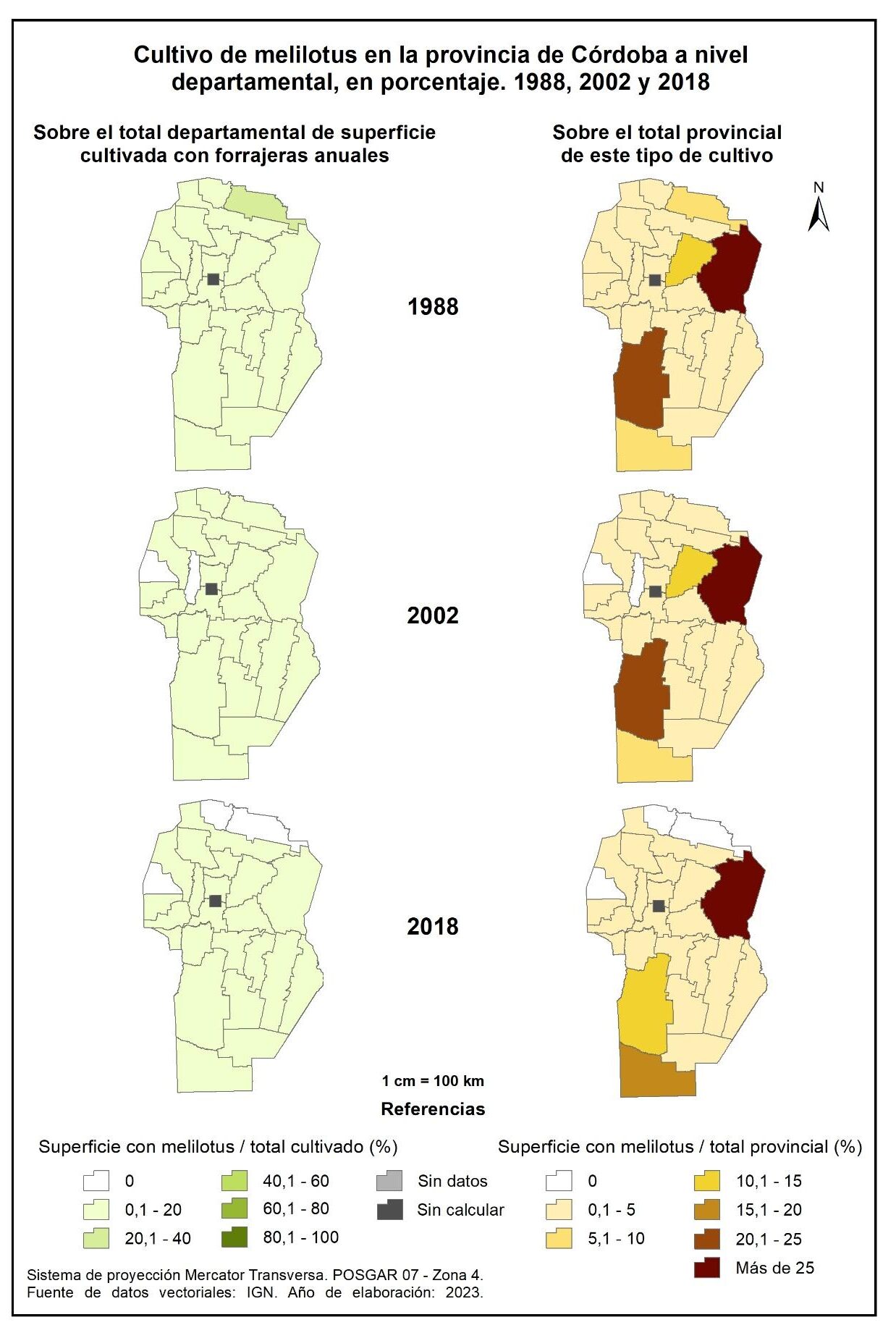 Figura 3.7. Cultivo de forrajeras anuales en la provincia de Córdoba a nivel departamental, en porcentaje. Años 1988, 2002 y 2018.