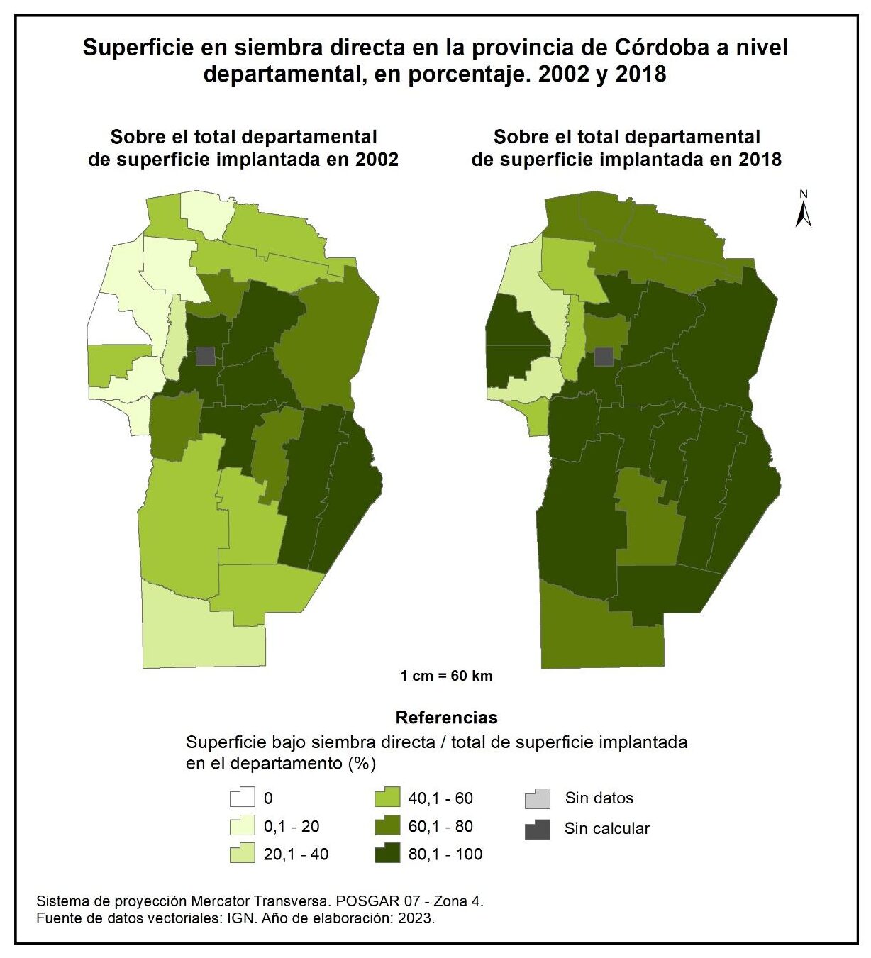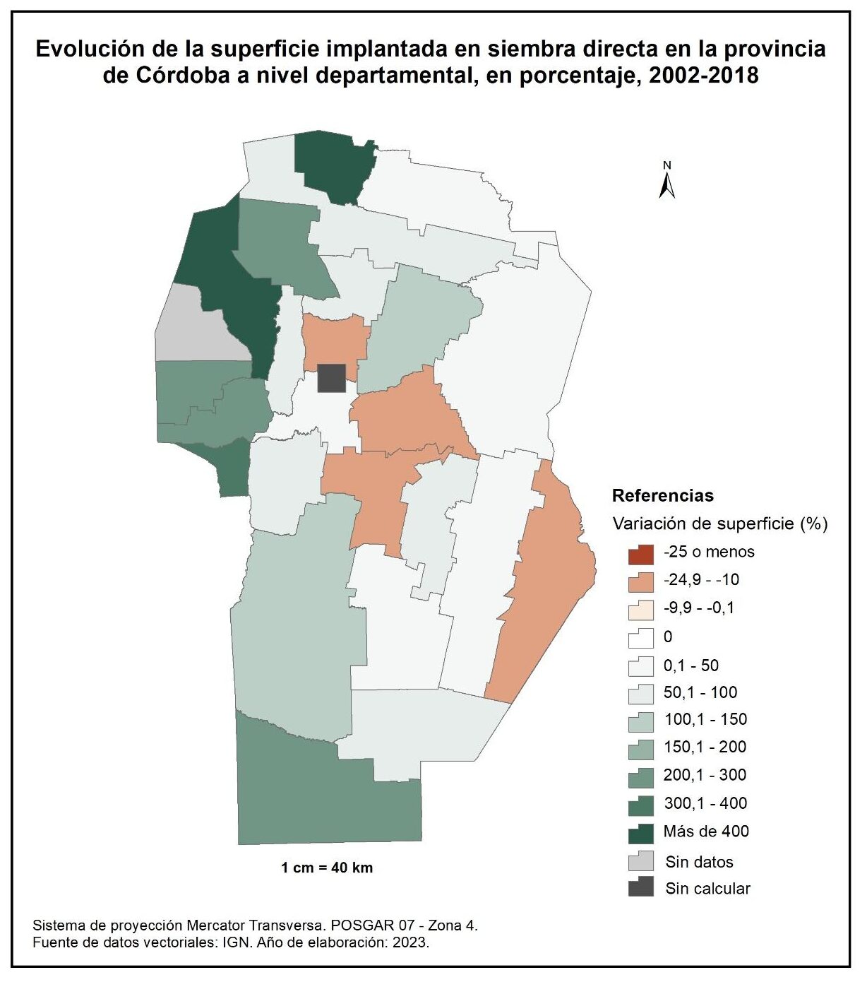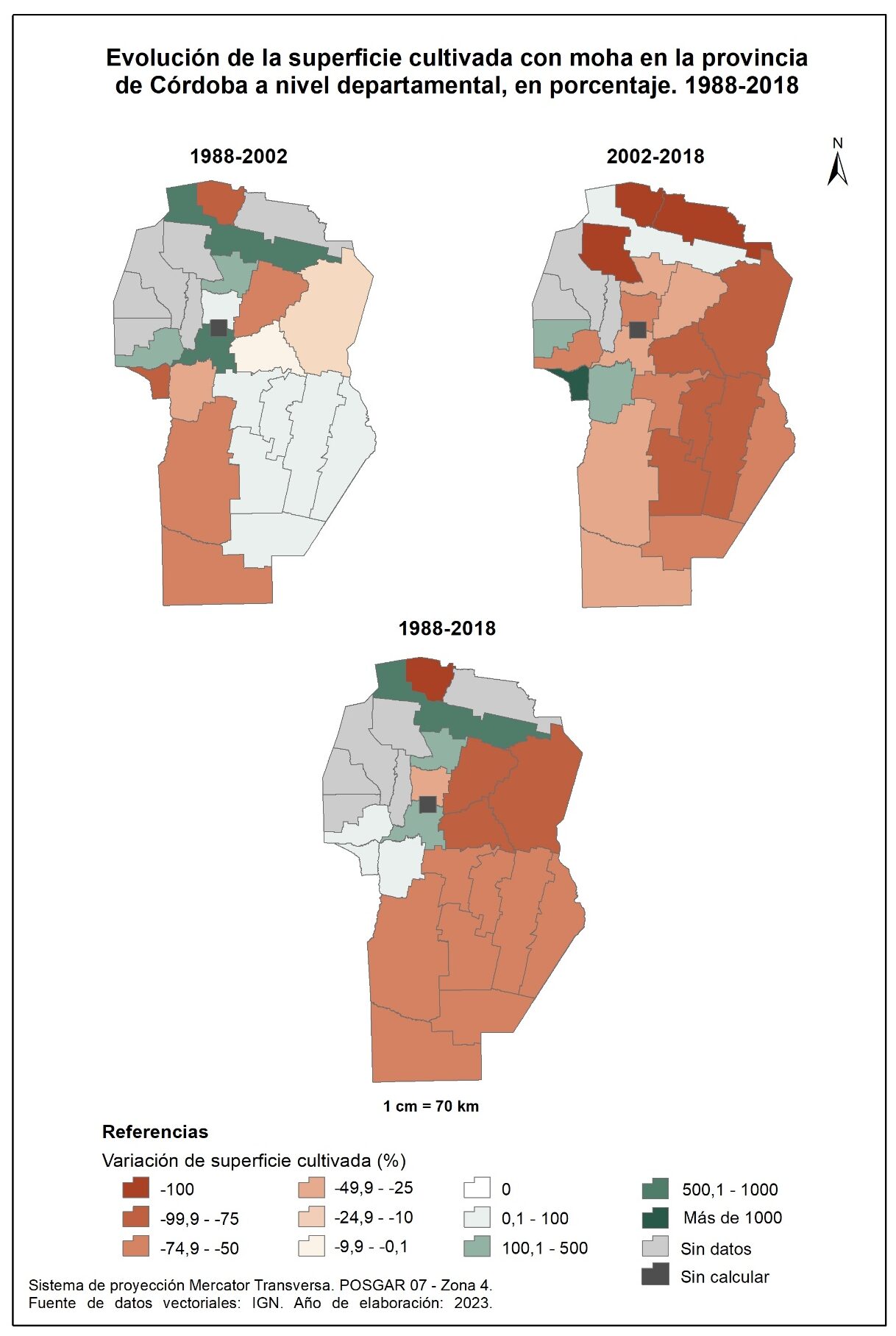 En la totalidad del corte temporal analizado (1988-2018) la mayor parte de la provincia evidencia un leve incremento en la superficie implantada –sobresalen los departamentos del norte y oeste–, a excepción de Minas (-60%) y Punilla (-26%).