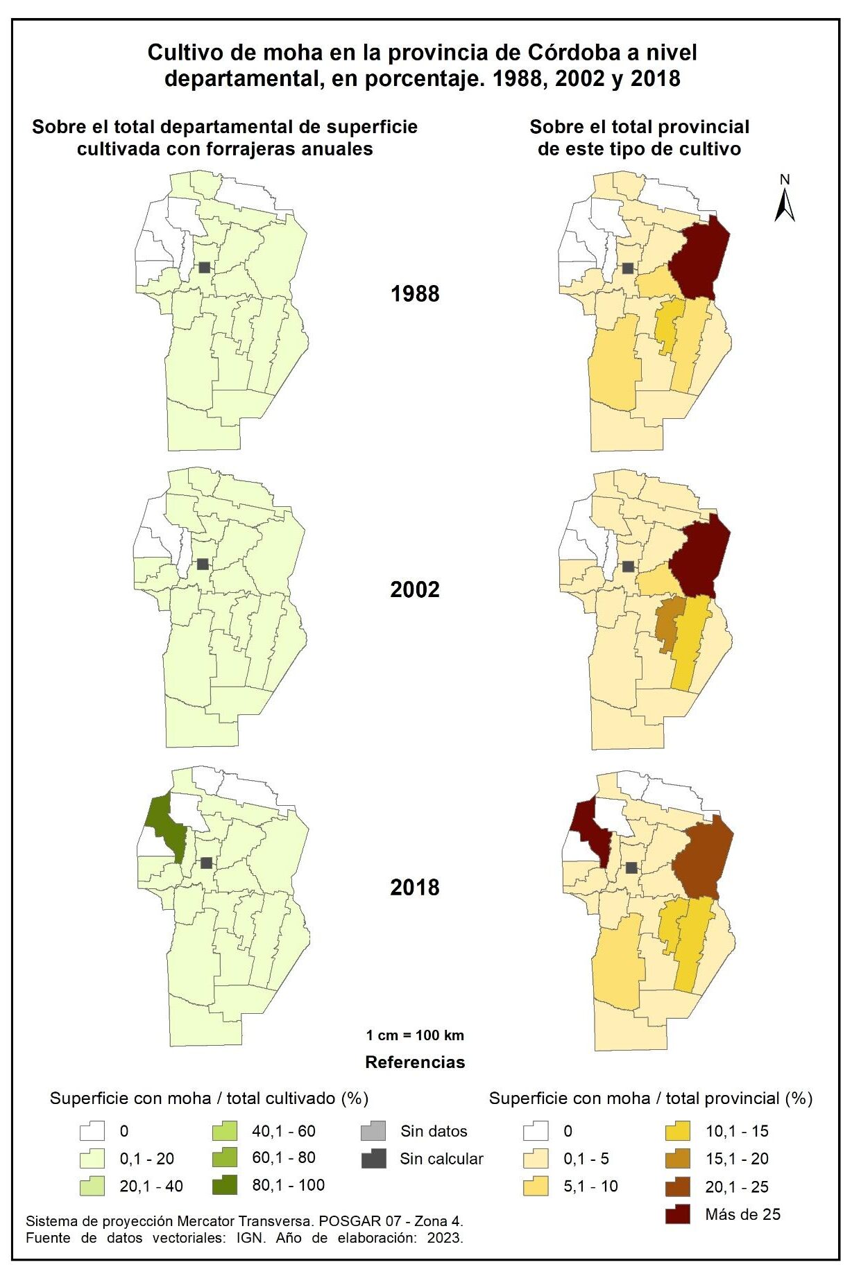 Figura 3.6. Evolución de la superficie cultivada con forrajeras anuales en la provincia de Córdoba a nivel departamental, en porcentaje. Años 1988, 2002 y 2018.