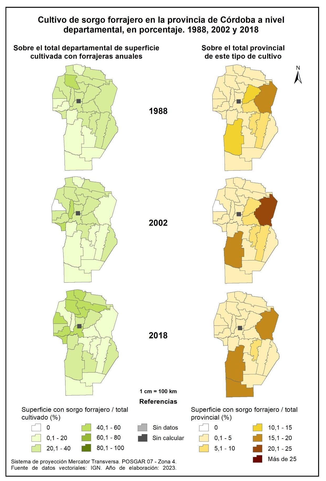 Figura 3.21. Cultivo de sorgo en la provincia de Córdoba a nivel departamental, en porcentaje. Años 1988, 2002 y 2018.
