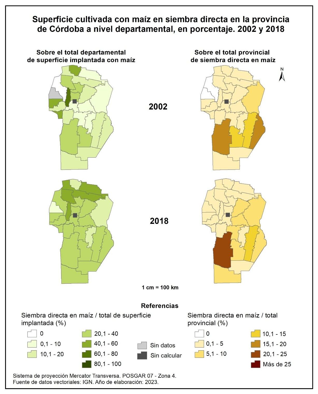 En el segundo período intercensal (2002-2018) el incremento del cultivo de maíz fue más acelerado en la casi totalidad de los departamentos, con excepción de Minas, Punilla, San Javier, Cruz del Eje y Sobremonte en los cuales se evidencia un descenso del -50 o menos.