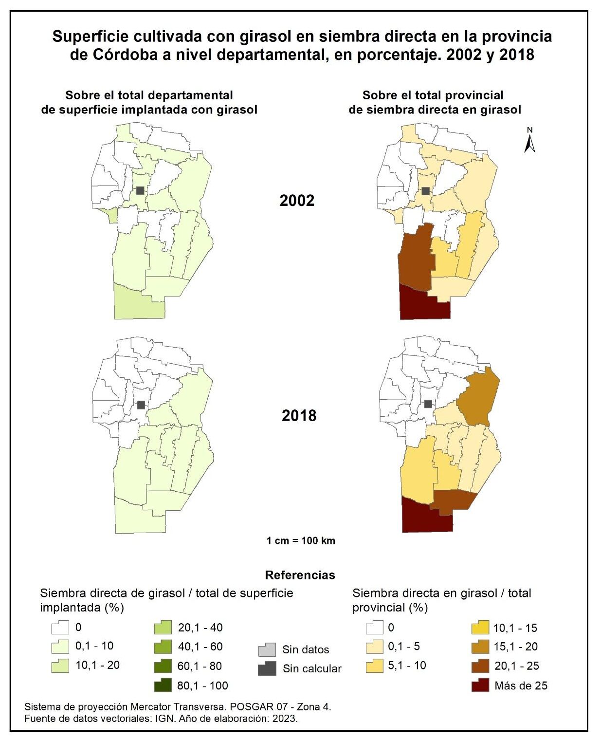 Figura 3.31. Cultivo de girasol en la provincia de Córdoba a nivel departamental, en porcentaje. Años 1988, 2002 y 2018.